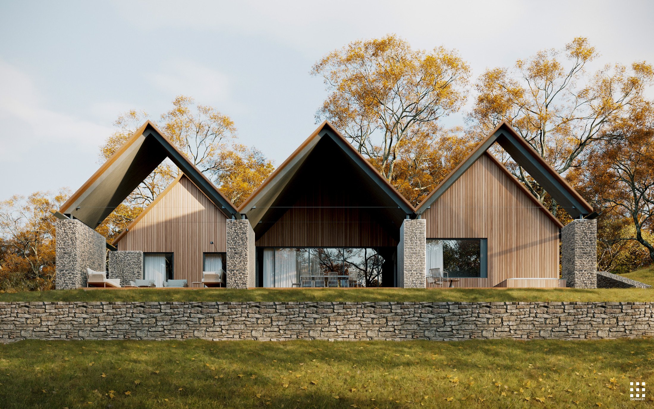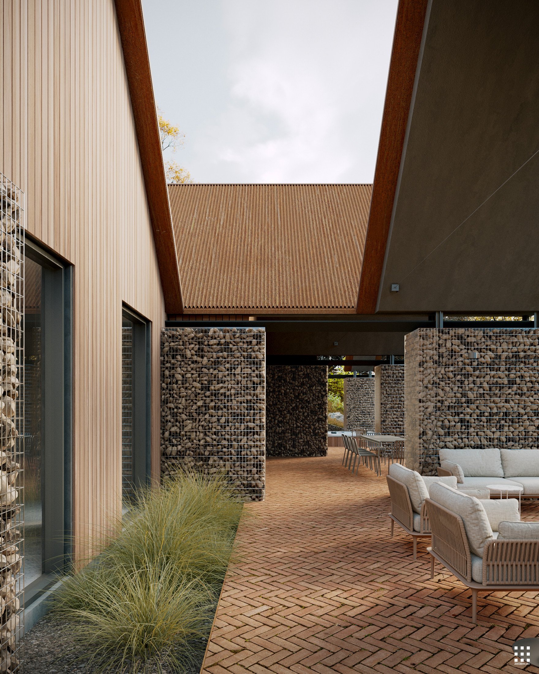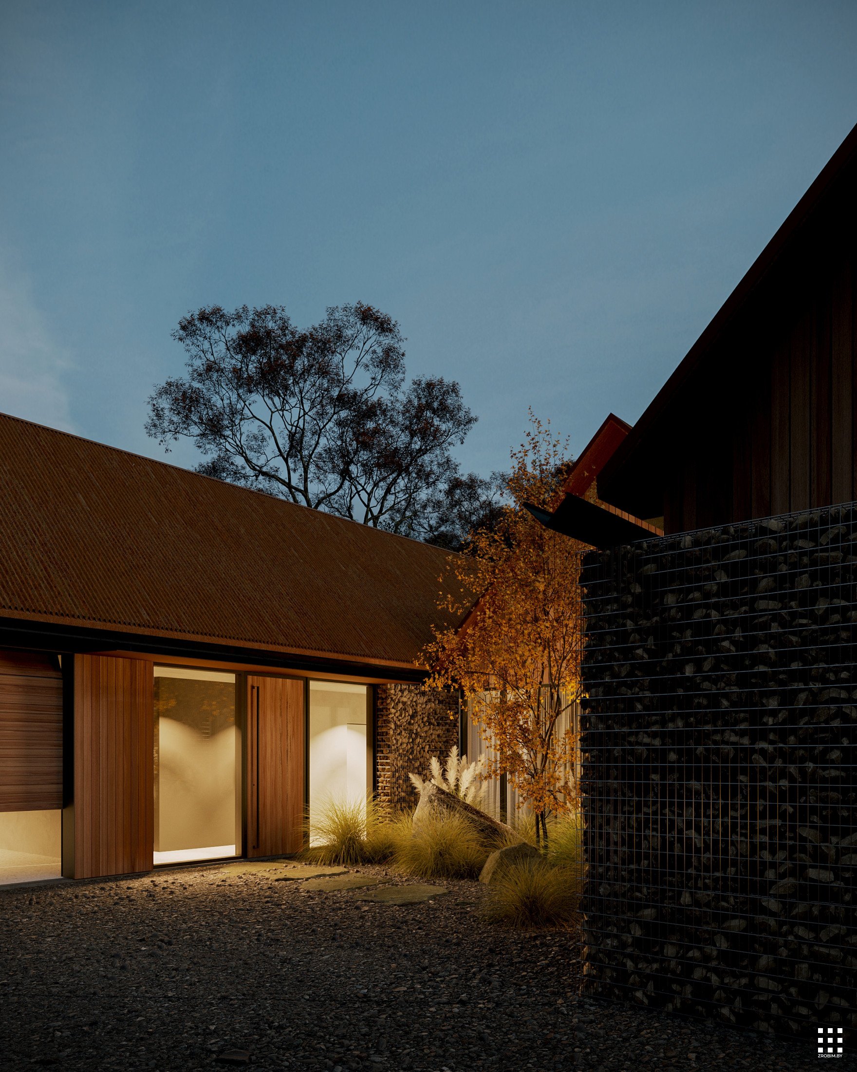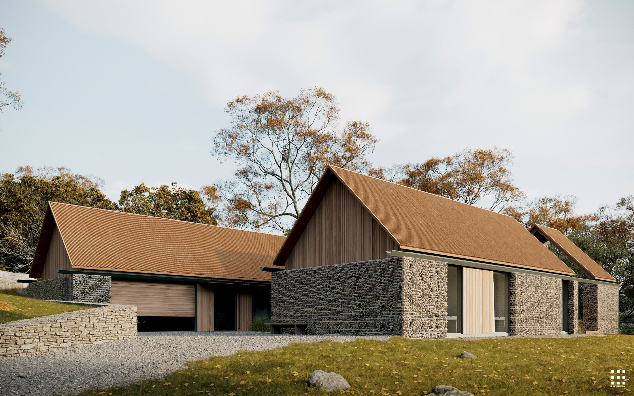 يتكون تصميم المنزل من ثلاثة حظائر متصلة ببعضها البعض. تُضفي ارتفاعاتها المختلفة، وتباعداتها الصغيرة، وانتقالاتها إلى مصاطب، ديناميكيةً وتعبيرًا معماريًا. في الوقت نفسه، يبقى تصميم المنزل بسيطًا للغاية، وسهل التنفيذ.
