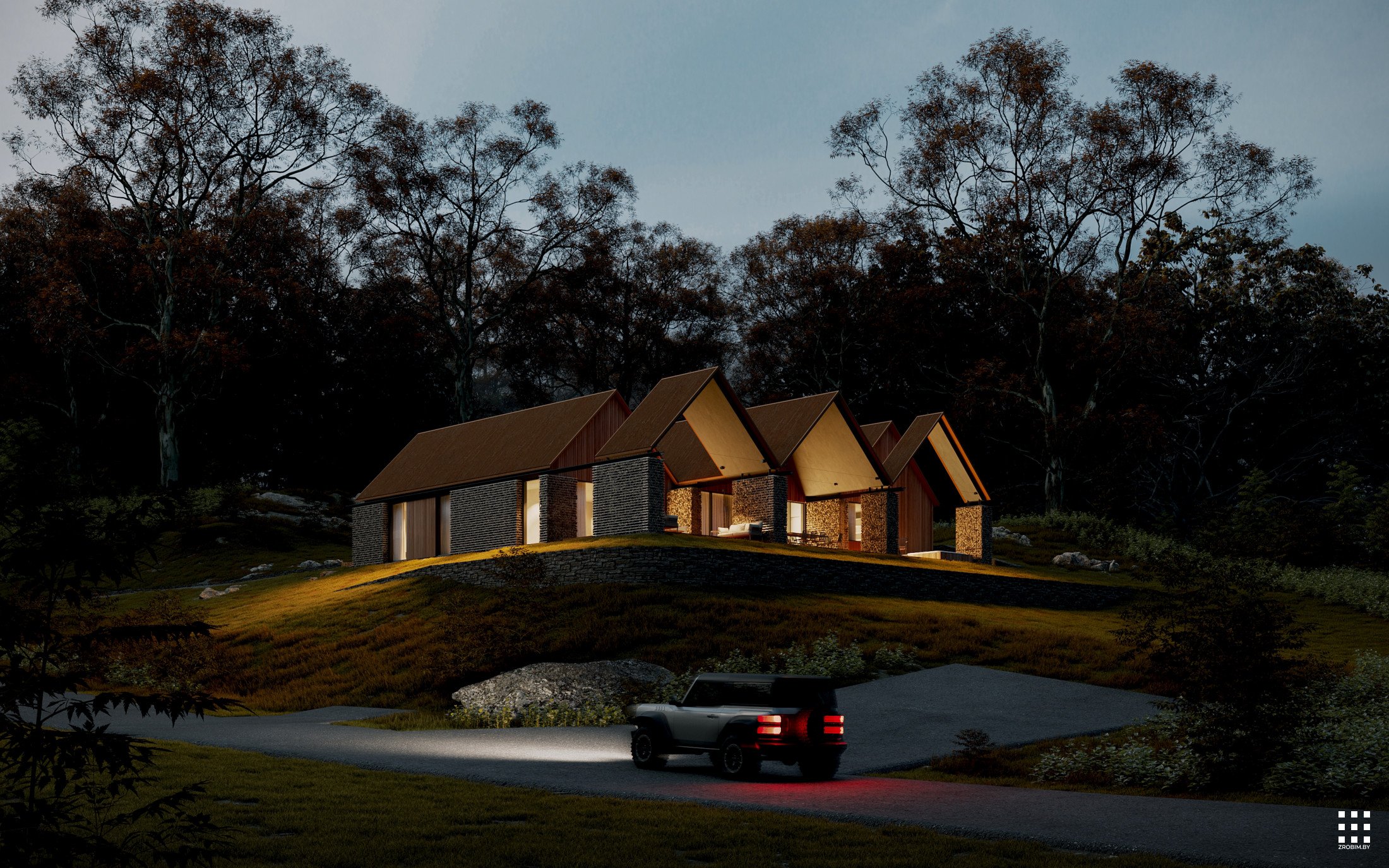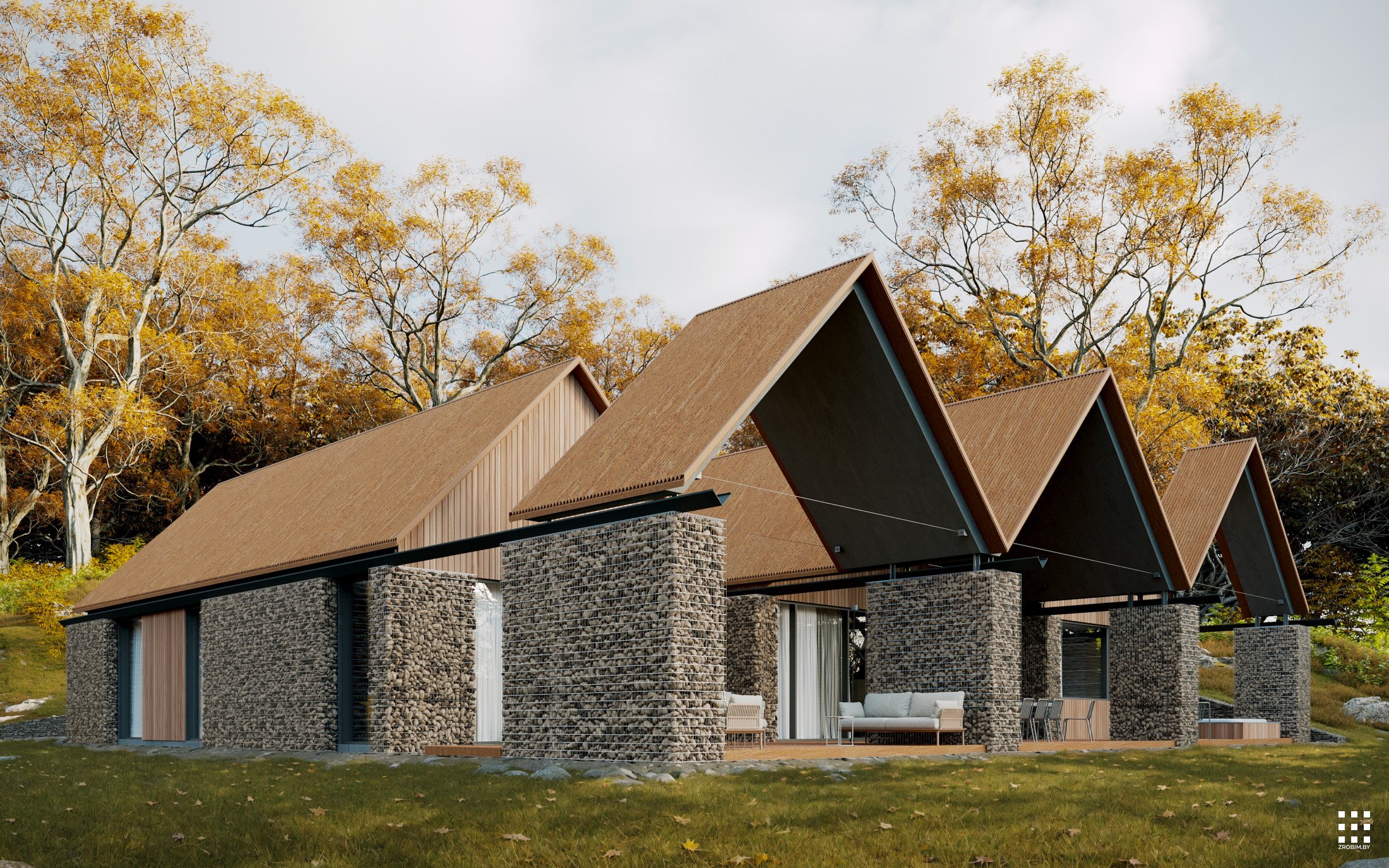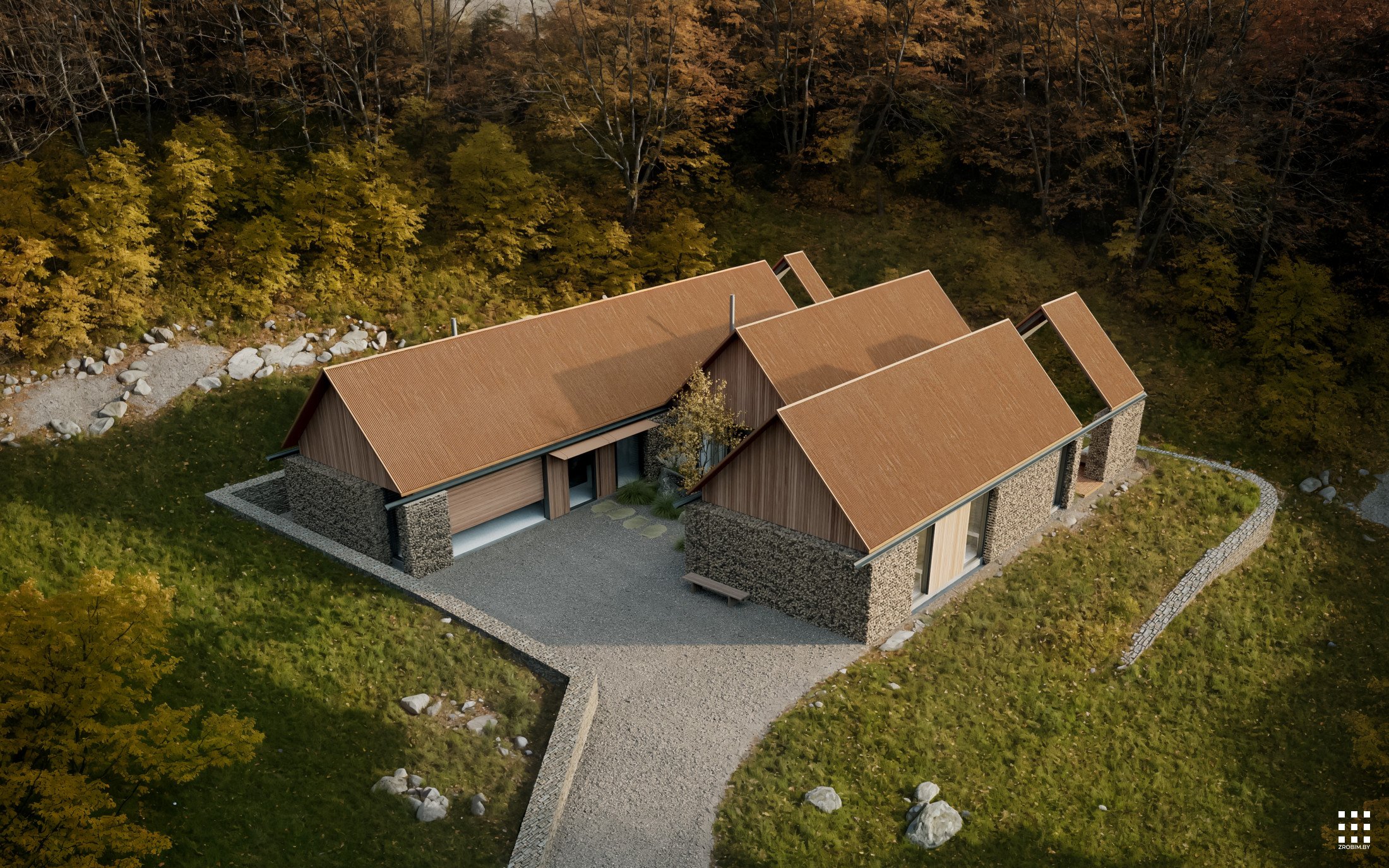 يقع المنزل في منطقة مشجرة، على حافة صخرية ذات ارتفاع مختلف. اخترنا مساحةً مستوية على هذا التضاريس، ونسجم المبنى مع المناظر الطبيعية دون المساس بطابعه.
