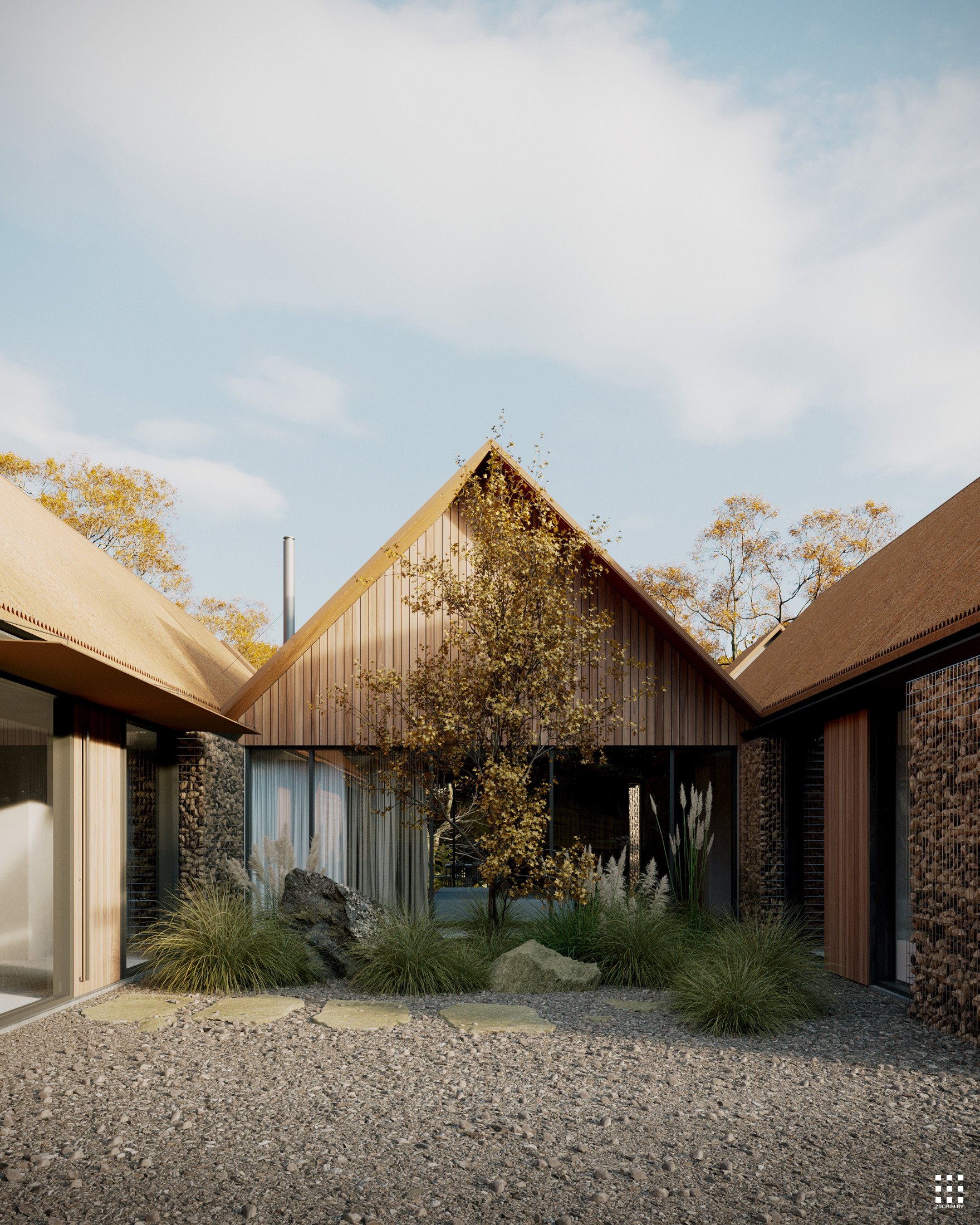 تستوحي المواد المستخدمة من الطبيعة أيضًا. فالأساس هو الخشب، باعتباره من أكثر مواد البناء طبيعيةً ودفئًا. أما الميزة الثانية فهي التراب، الذي يُستخدم عادةً في حلول الأسوار، وقد أصبح هنا عنصرًا من عناصر الواجهة. جمعنا الحجارة اللازمة له من الموقع مباشرةً - وهي ما تبقى بعد أعمال الحفر. وهذا لا يسمح لك بتوفير المال فحسب، بل يسمح لك أيضًا بـ ""خياطة"" المنزل في المكان الذي يقع فيه قدر الإمكان.