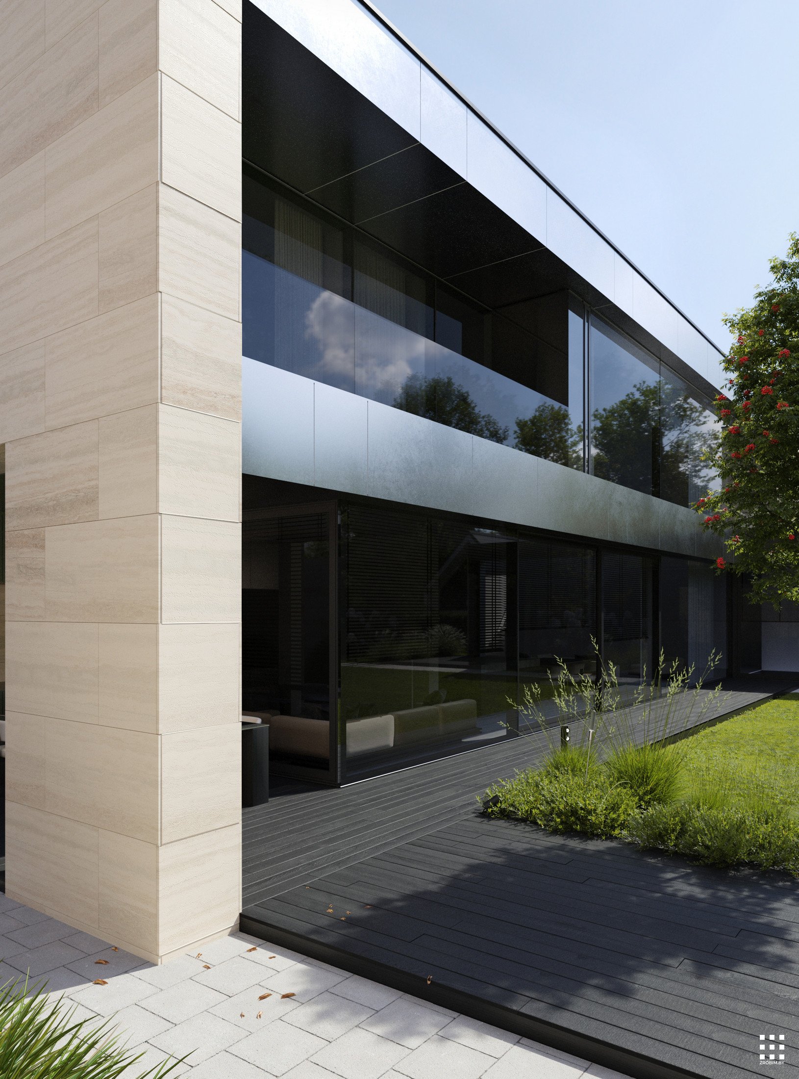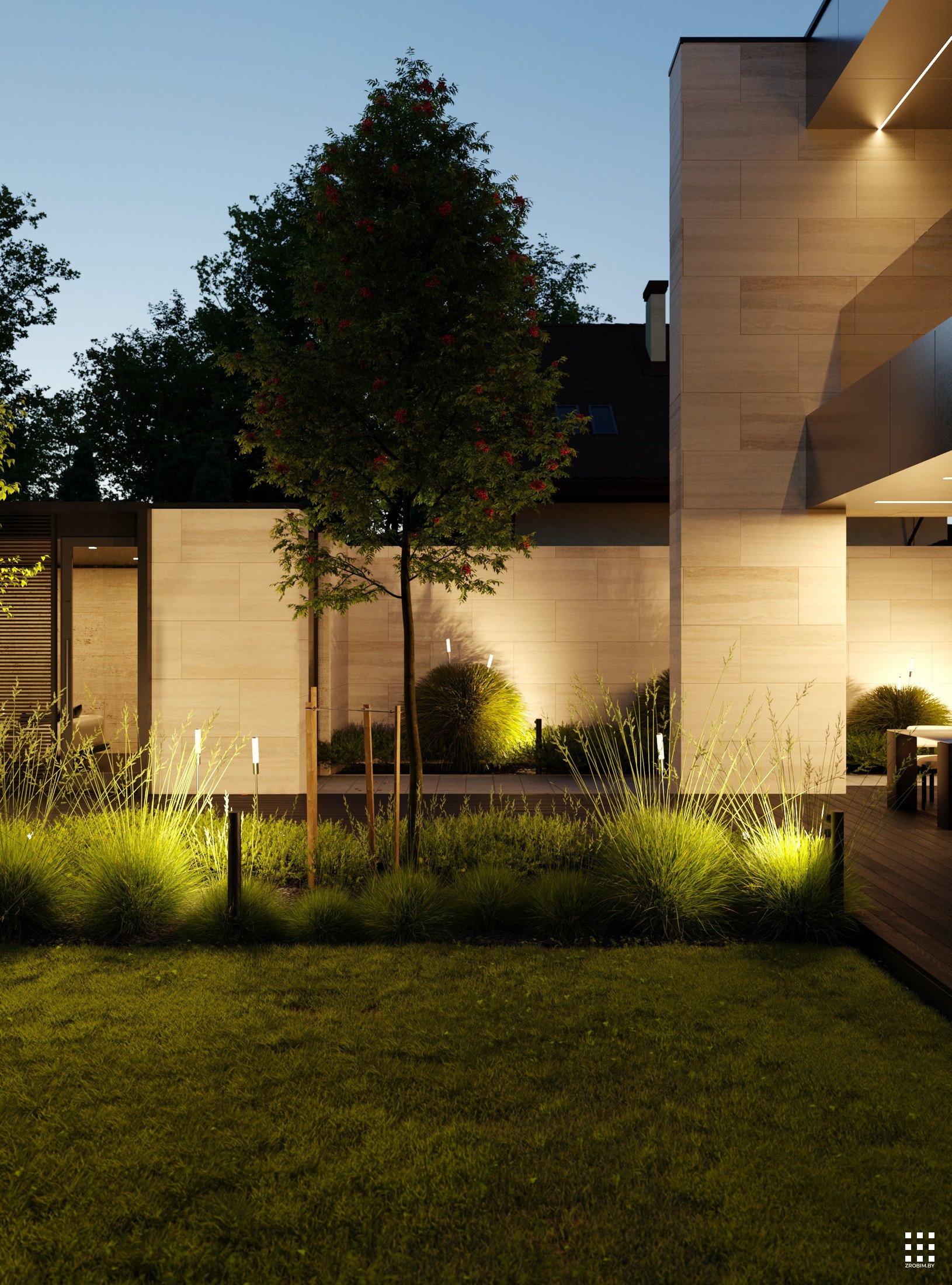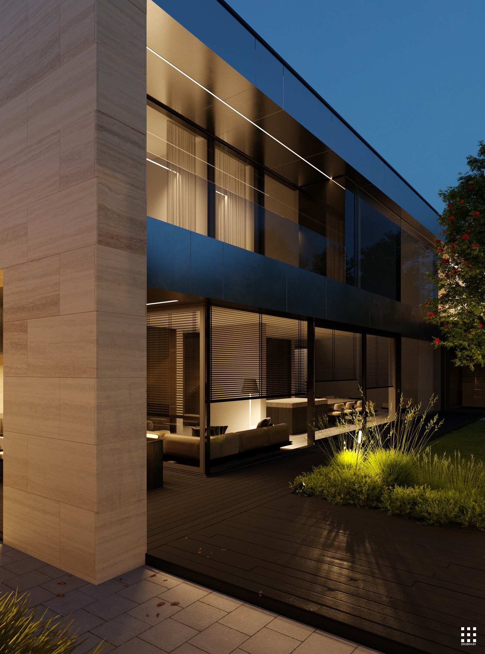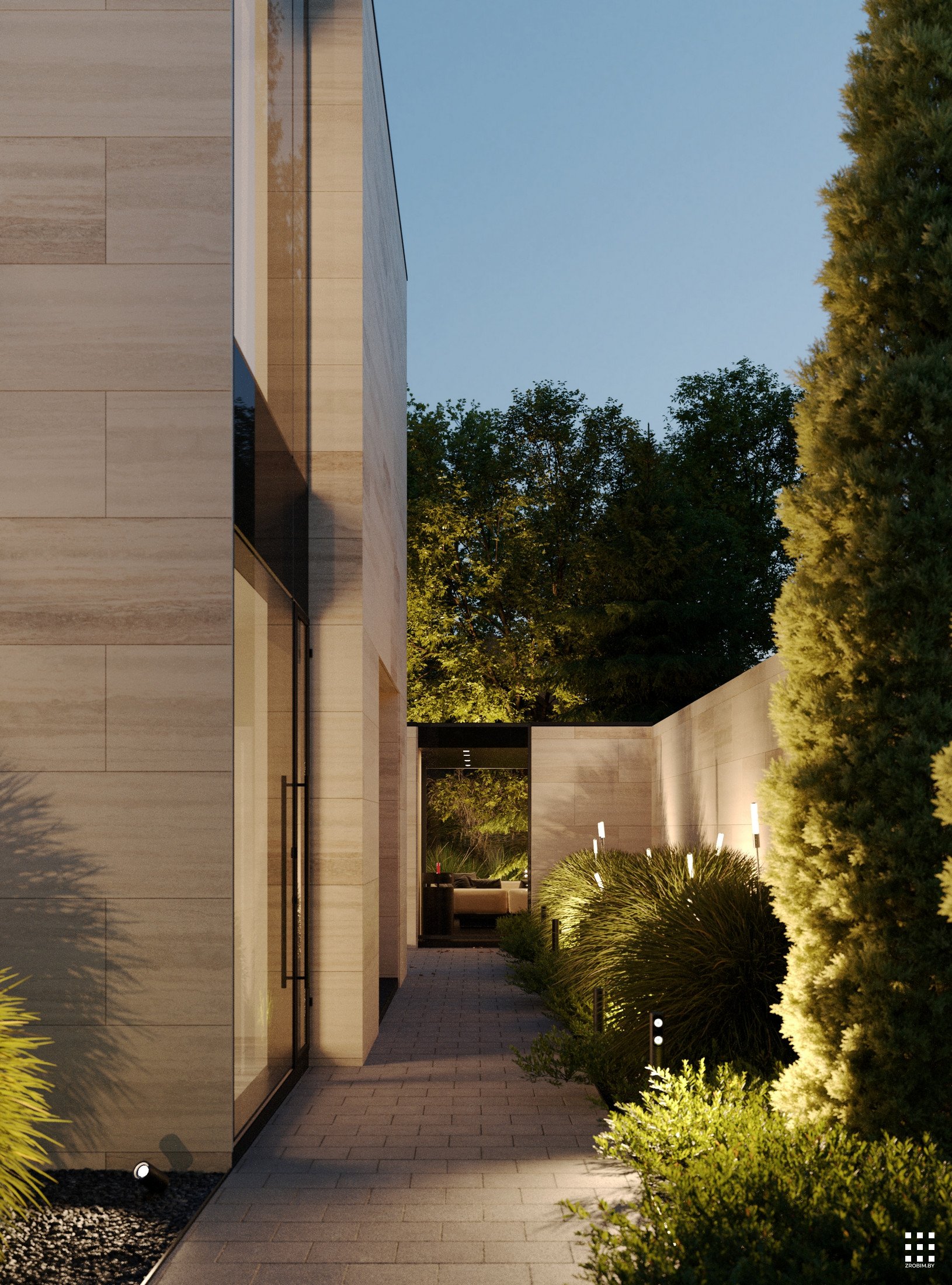 Акценты из нержавеющей стали создают архитектурное напряжение и тонкий контраст по отношению к тёплым, природным фактурам травертина, усиливая вертикальные пропорции и придавая архитектуре дополнительную выразительность.