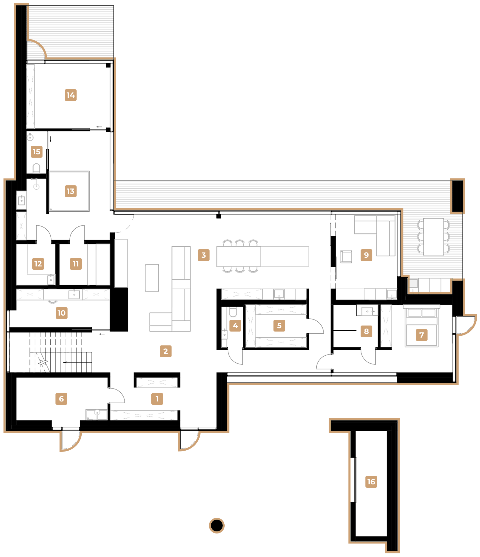Сценарий пространства раскрывается уже при входе: светлый open space со вторым светом формирует визуальную ось во внутренний двор с террасой, отдельной закрытой лаунж-зоной и спа. Продуманная планировочная деталь — два прохода через гардеробную, один из которых ведёт к лестнице, позволяя перемещаться между уровнями, не нарушая жизнь общего пространства.