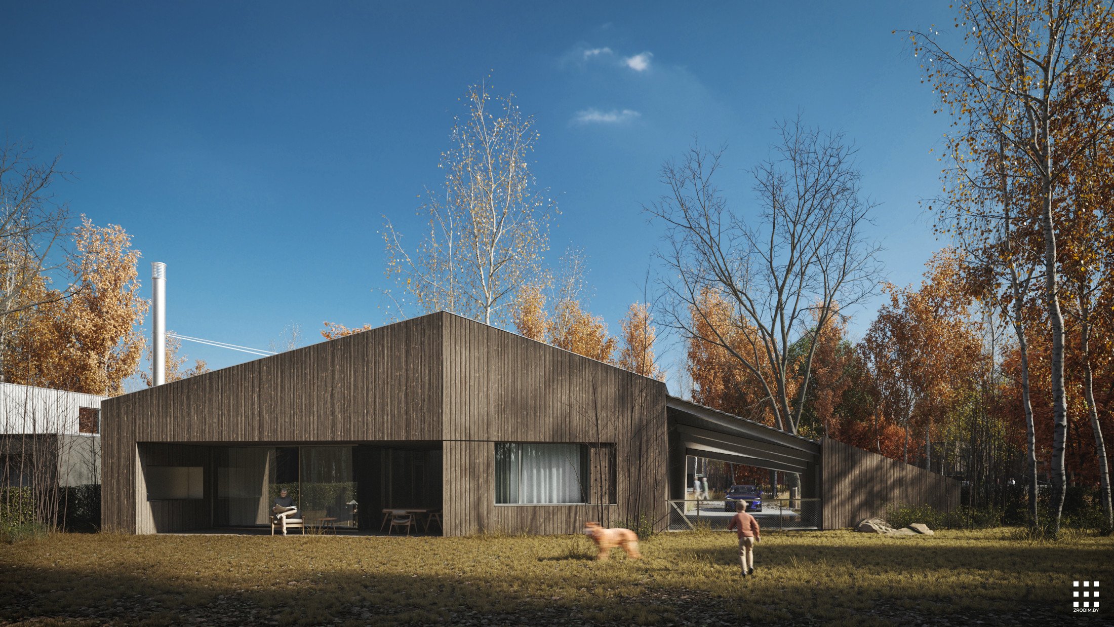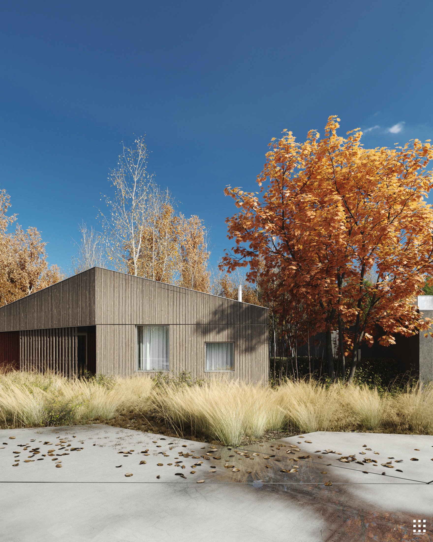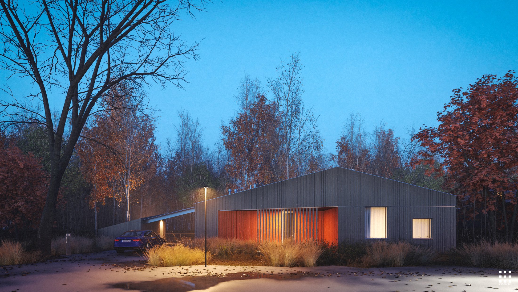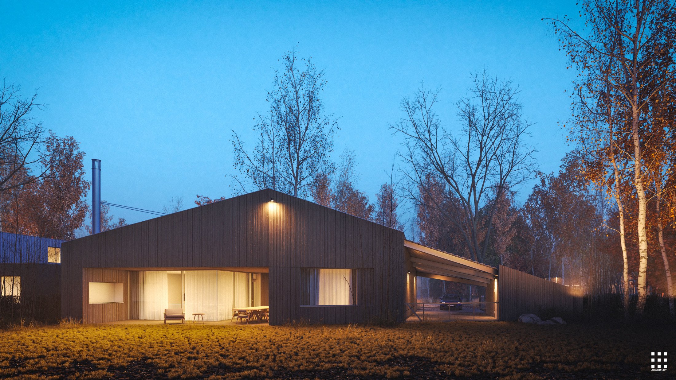 Дом кажется простым и лаконичным, но за этой внешней сдержанностью скрывается продуманная и необычная структура. Планировочная структура построена по принципу треугольника, и именно она формирует его характер: внутри рождается динамичная геометрия пространства, а снаружи эта идея продолжена в ломаной линии кровли.