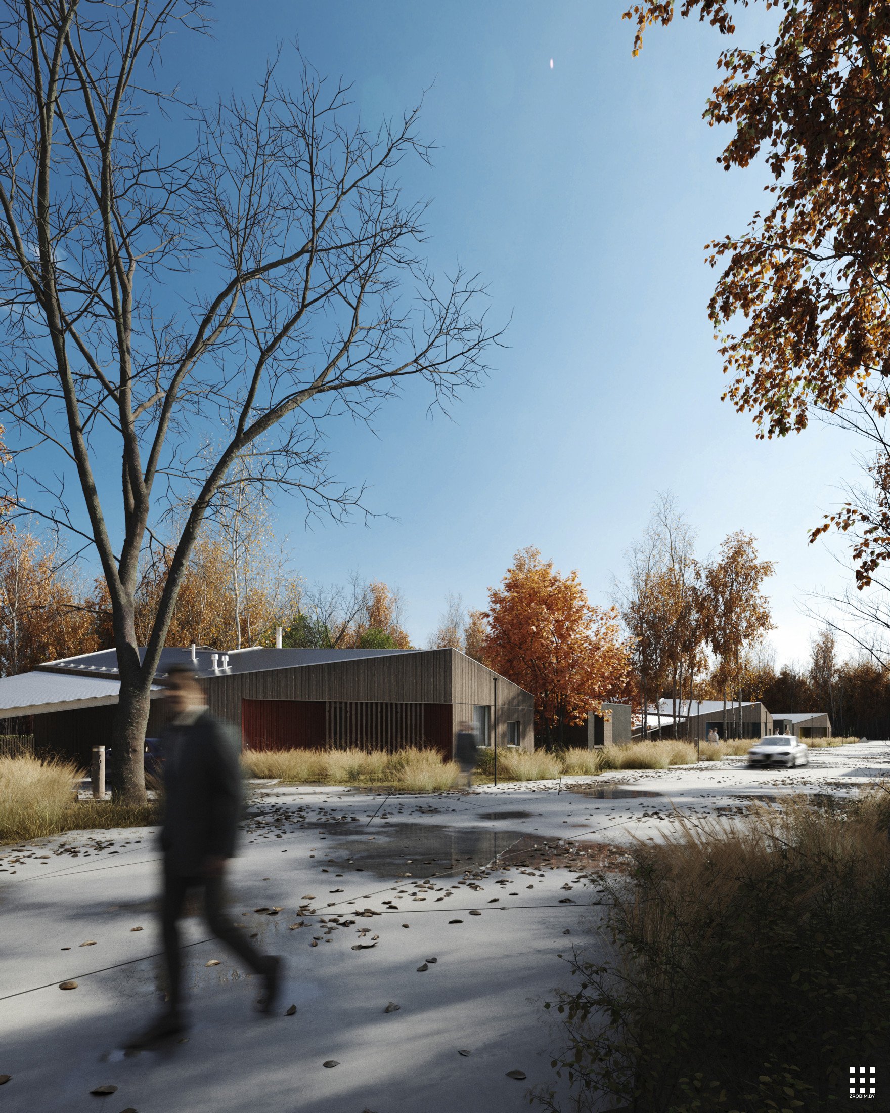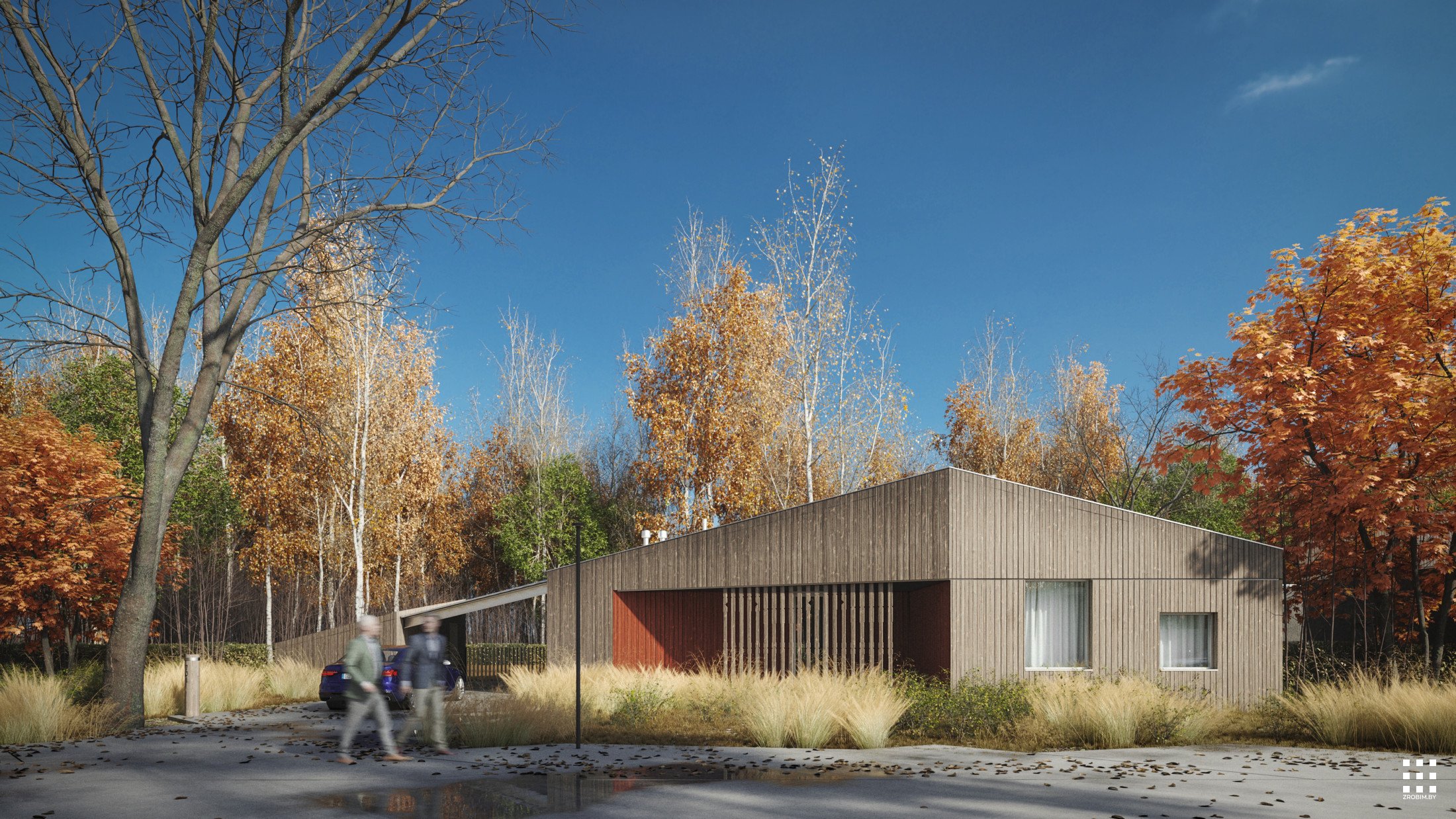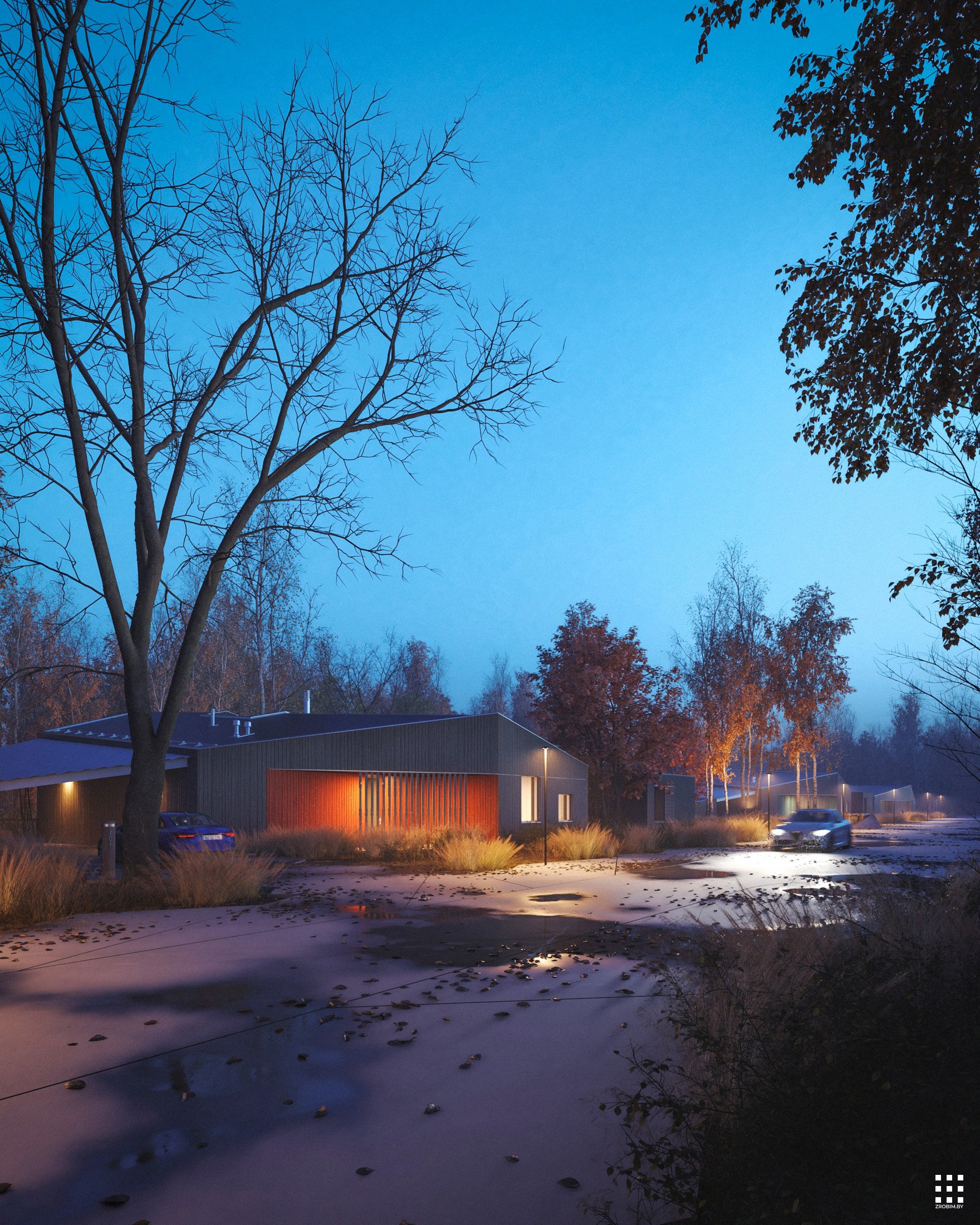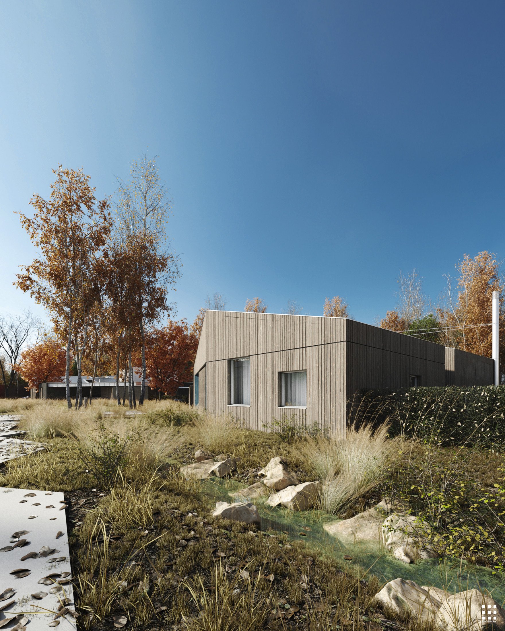 Дом кажется простым и лаконичным, но за этой внешней сдержанностью скрывается продуманная и необычная структура. Планировочная структура построена по принципу треугольника, и именно она формирует его характер: внутри рождается динамичная геометрия пространства, а снаружи эта идея продолжена в ломаной линии кровли.