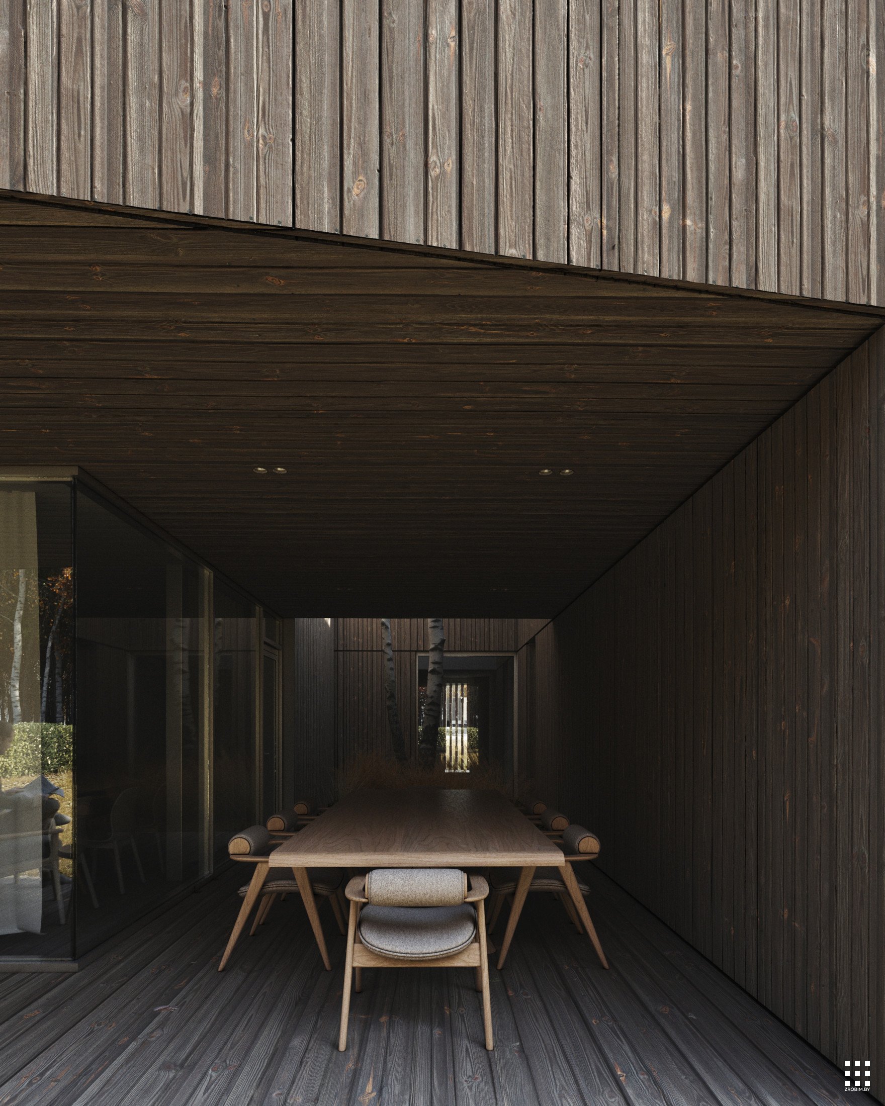 Треугольная схема в плане позволила чётко разделить дом на зоны. В одном крыле расположены спальни, в другом — кухня и гостиная. В отдельный блок, отделенный от общего пространства террасой, выделена хозяйская спальня состоим санузлом и гардеробом. а в центре сходятся все основные потоки жизни. Благодаря такой организации дом одновременно компактный и просторный: приватные пространства изолированы, но остаются в естественной связи с общей частью.