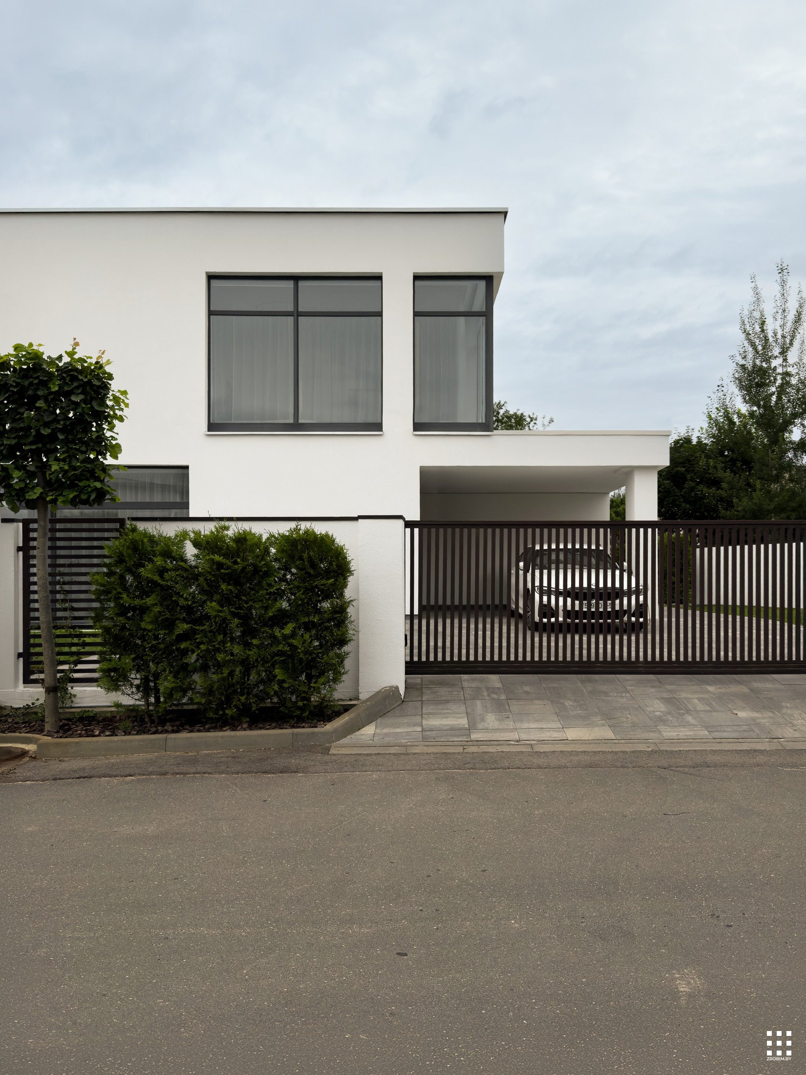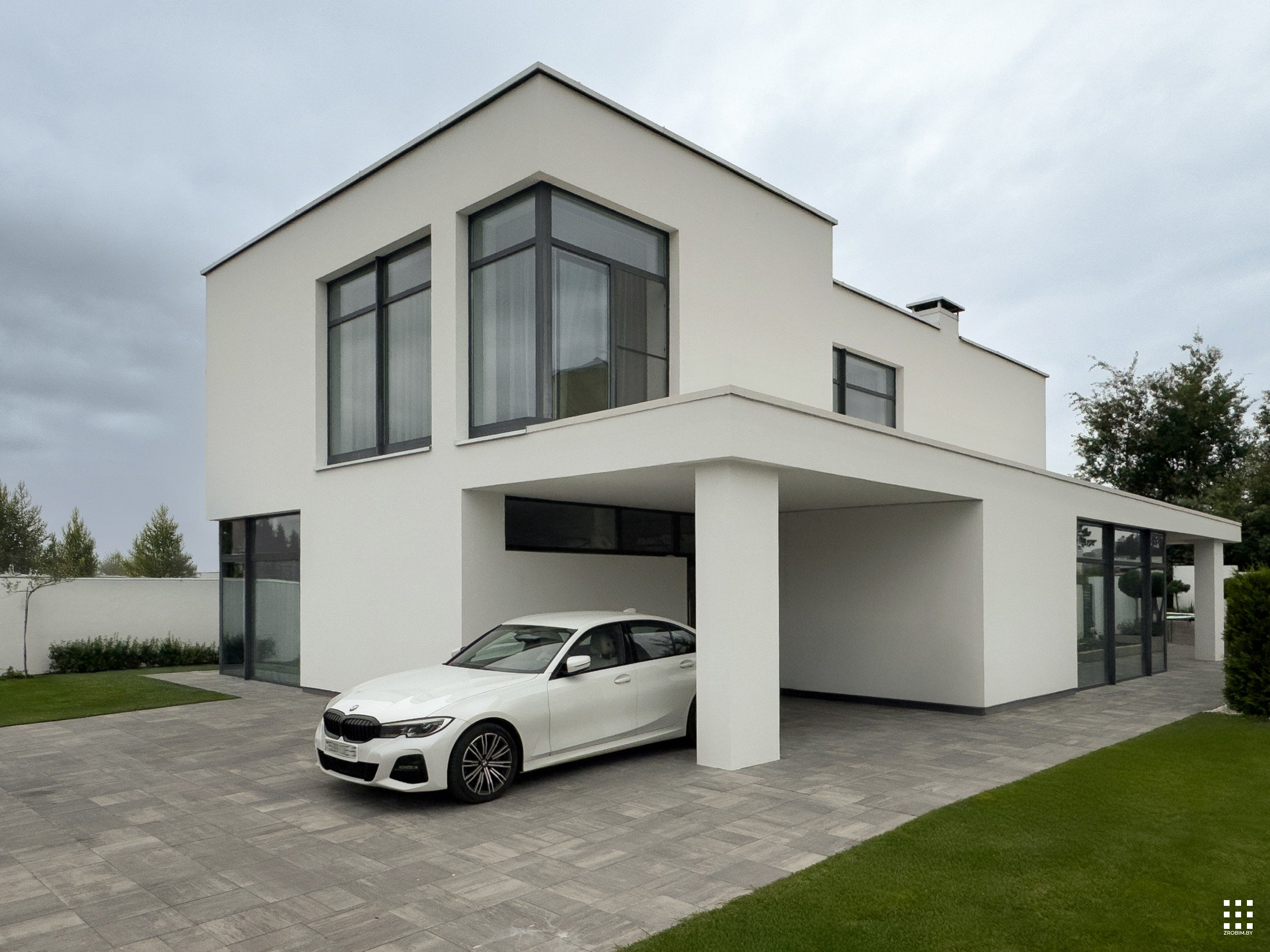 Современный дом с витражным остеклением, эксплуатируемой кровлей и отделкой тонким широкоформатным керамогранитом.