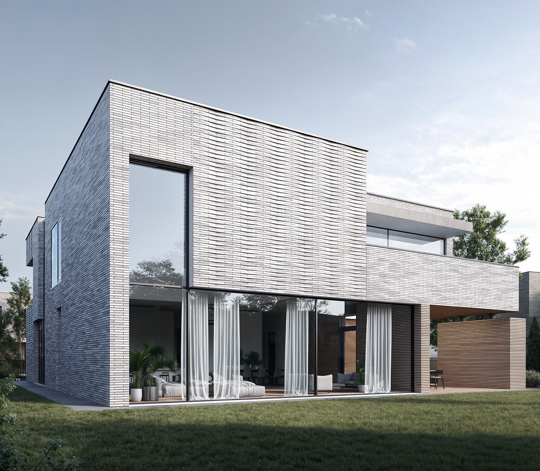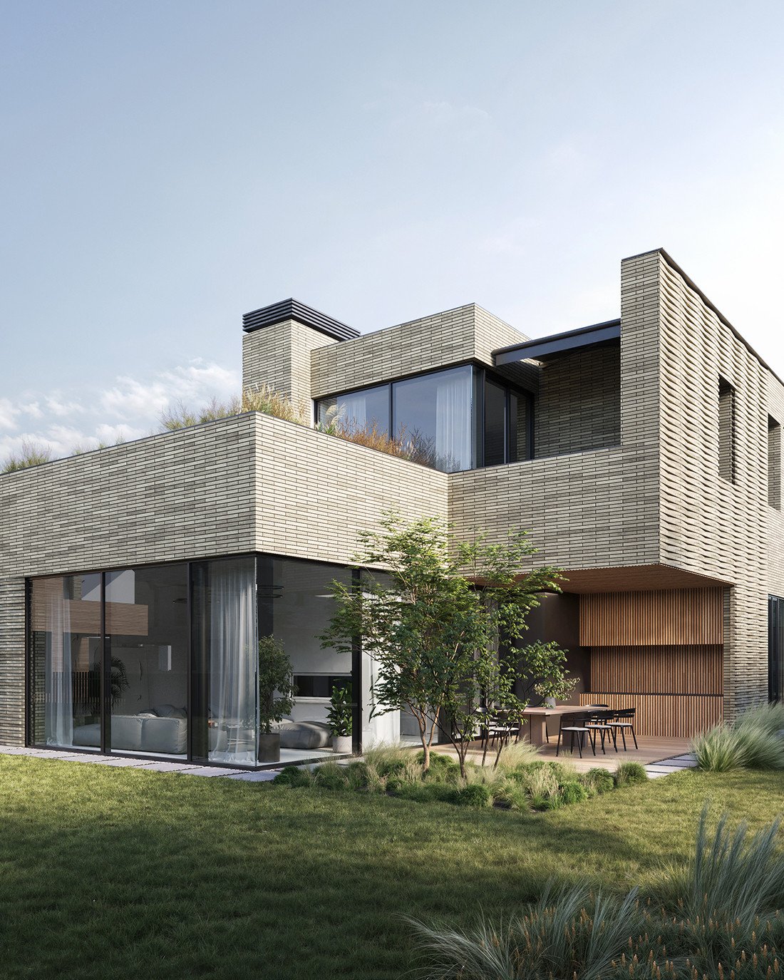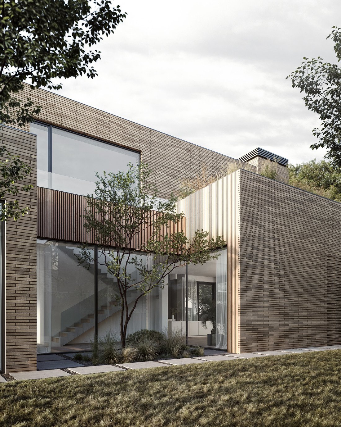 Кирпичная монолитность контрастирует с теплом дерева, а гладкая глазурь скатных элементов добавляет современный акцент. Чередование витражей и камерных проёмов создаёт ритм, управляет светом и делает архитектуру живой и выразительной.