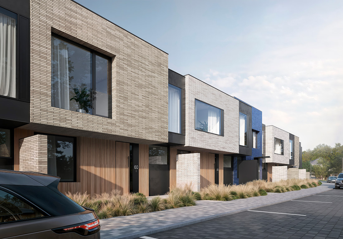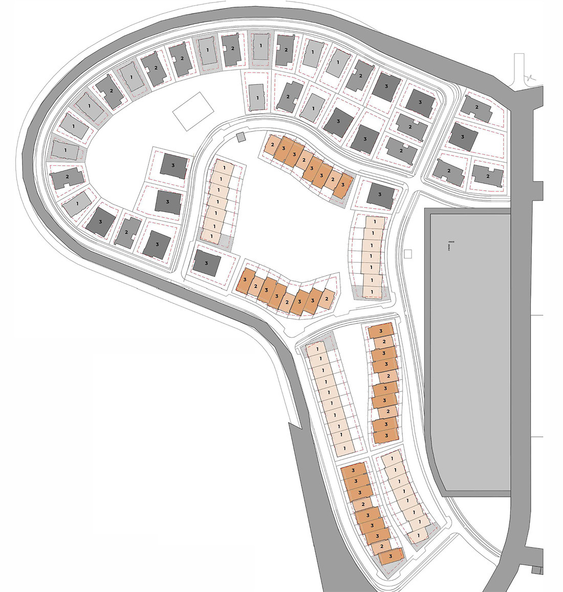 Проект основан на принципе единства и разнообразия. Это не ряд однотипных домов, а ансамбль, где каждая секция сохраняет индивидуальность и одновременно принадлежит целому. Динамика достигается благодаря смещённым объёмам и сочетанию горизонтальных и скатных кровель, из-за чего облик комплекса меняется в зависимости от ракурса и освещения.