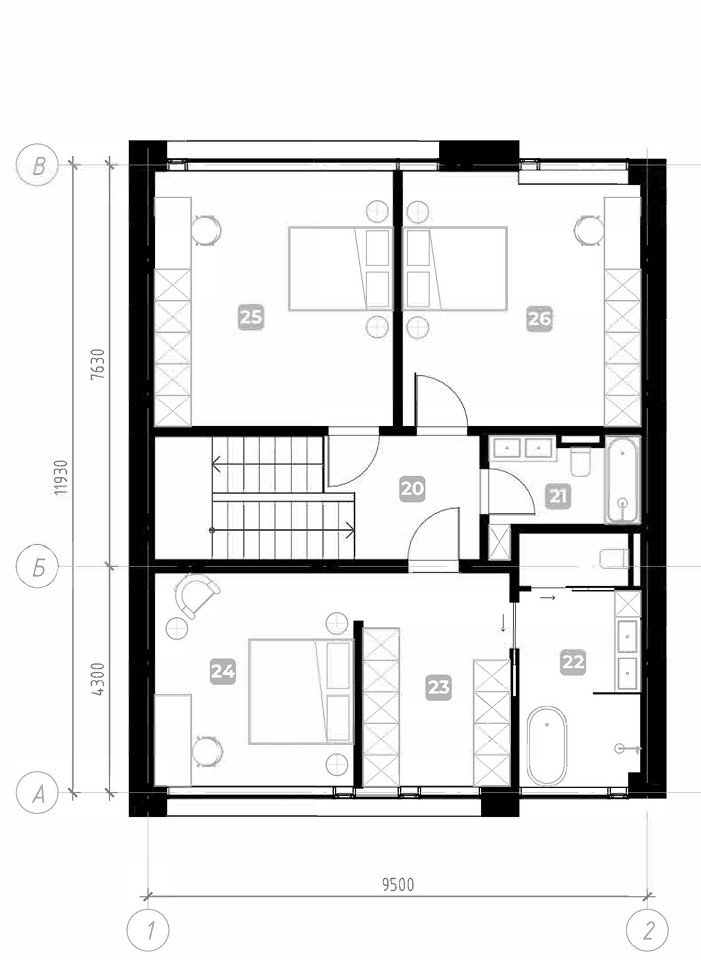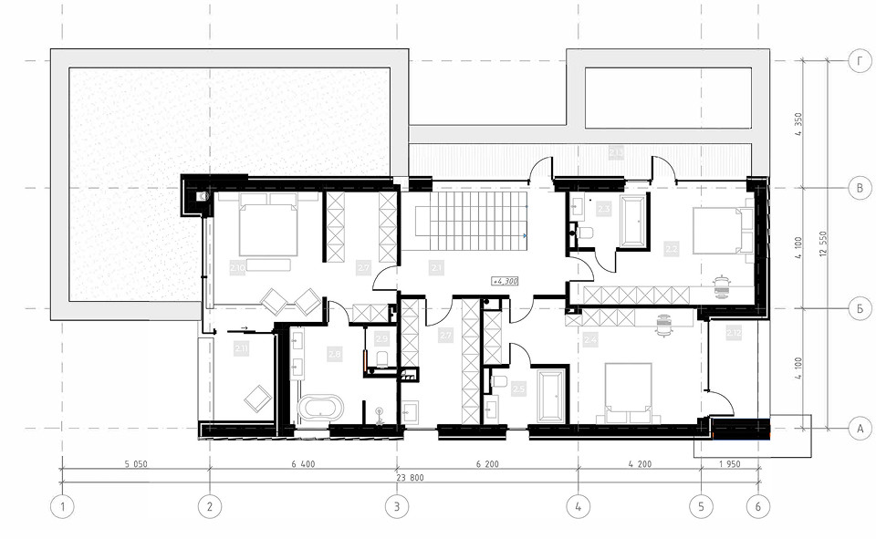 Расширенный формат, где комфорт выходит на новый уровень. На втором этаже — спальни с собственными санузлами и гардеробными зонами. На первом — просторные прихожие, хозяйственные помещения и эффектные двусветные пространства, создающие особую атмосферу.