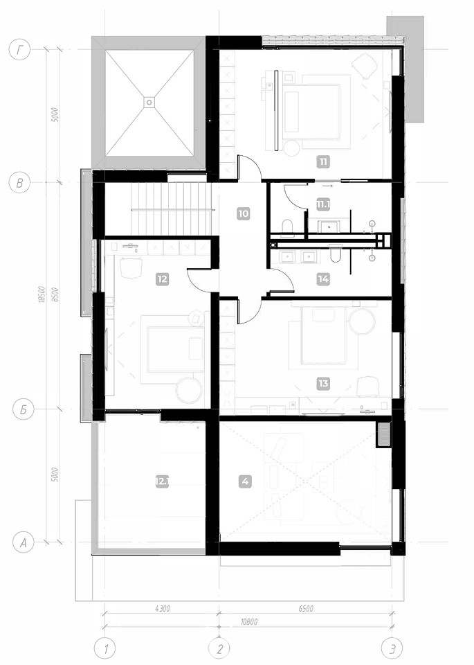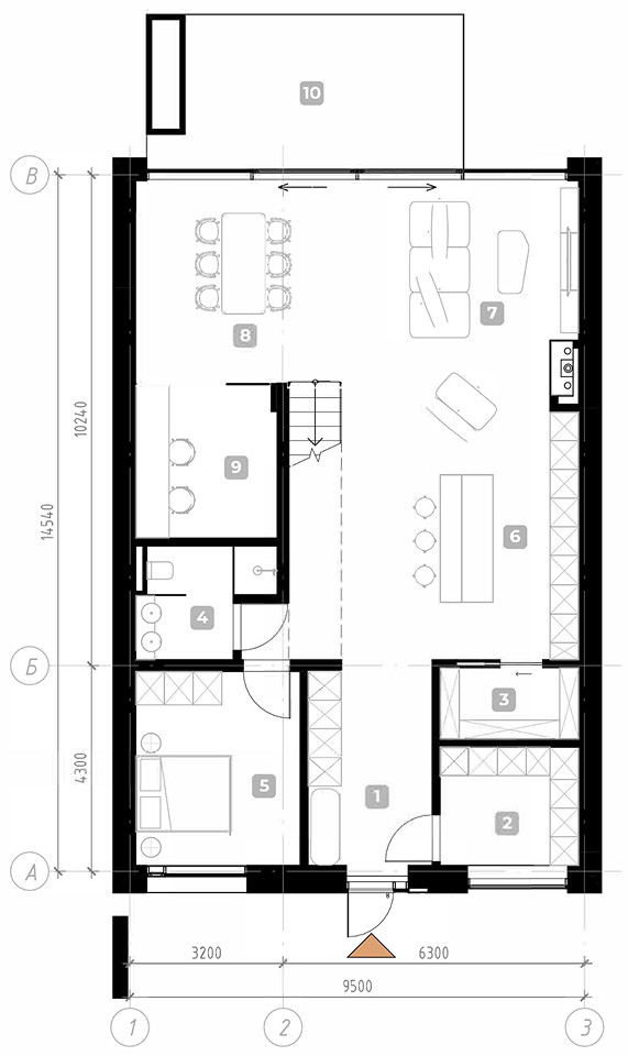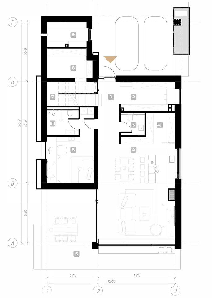 Характерной чертой домов этого типа является размещение всех помещений на одном этаже, а также расположение заезда в дом с заднего фасада, в то время как передняя часть дома нависает над рельефом. Все жилые помещения мы ориентировали в направлении перспективных видов, которые открываются через сплошной фронт панорамного остекления.