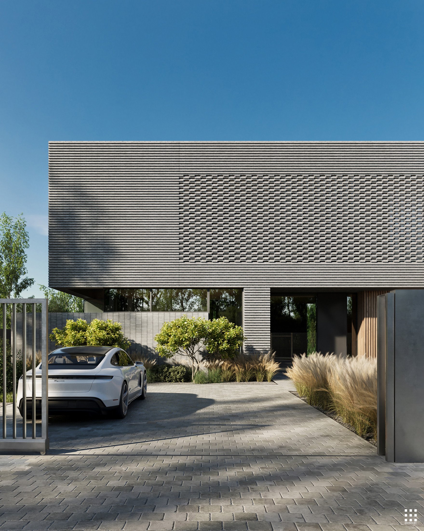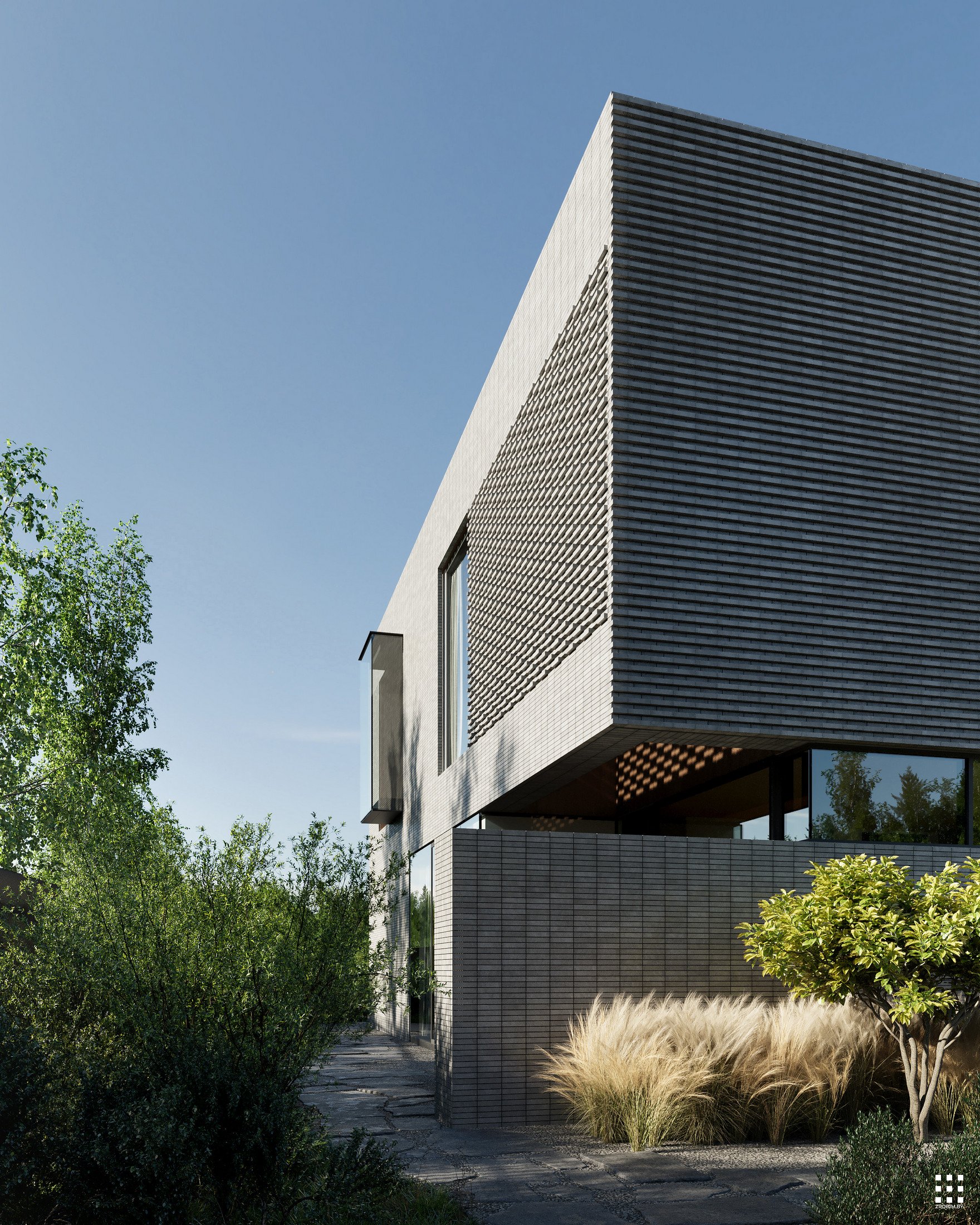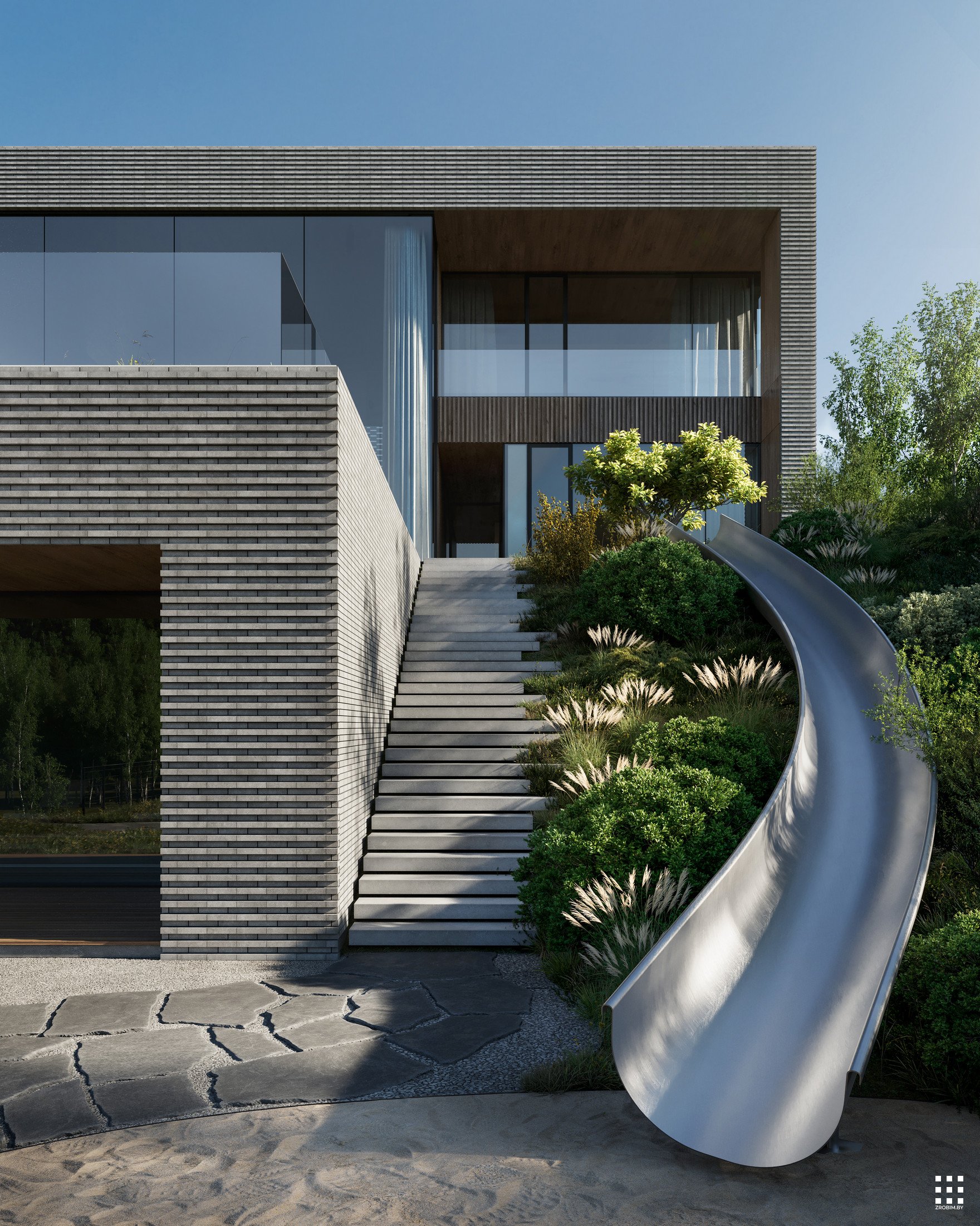 Калі мы думаем аб уражлівай архітэктуры, мы адразу ўспамінаем гэты праект. Клінкерная цэгла, арнаментальнасць, металічная горка, акно вышынёй 8 м у гасцінай, гараж са шкляным пераходам у асноўную частку дома - усё гэта злучылі разам і стварылі архітэктуру, у якой мінімалізм спалучаецца з самабытнасцю.