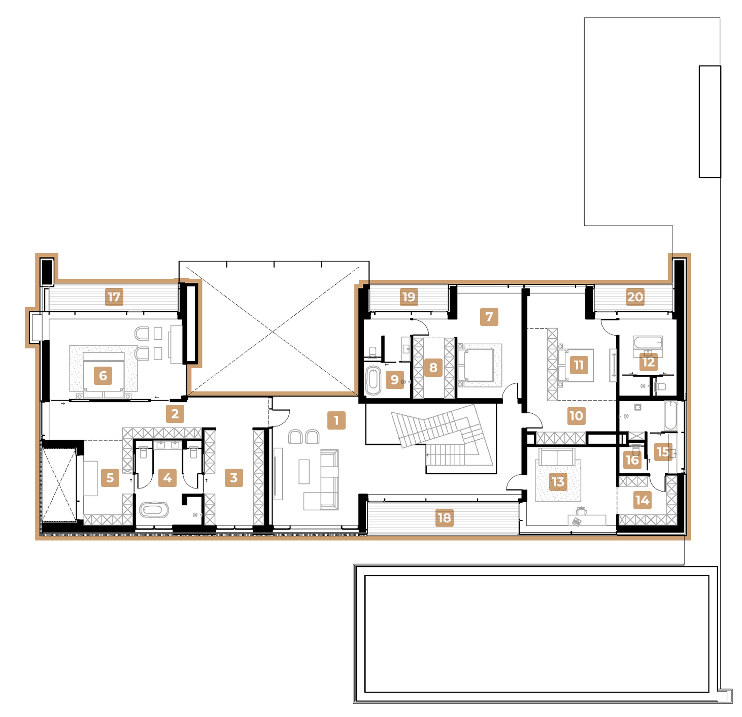 Архітэктура звонку і планіроўка ўнутры пераклікаюцца сваёй эфектнасцю і маштабам: парадныя металічныя ўсходы якая нагадвае стужку для мастацкай гімнастыкі і служыць візуальным акцэнтам у цэнтры хаты, неабсяжная агульная прастора і некалькі спальняў з прасторнымі гардэробнымі і ўласнымі ваннымі пакоямі, адна з якіх займае два ўзроўня і адзін.