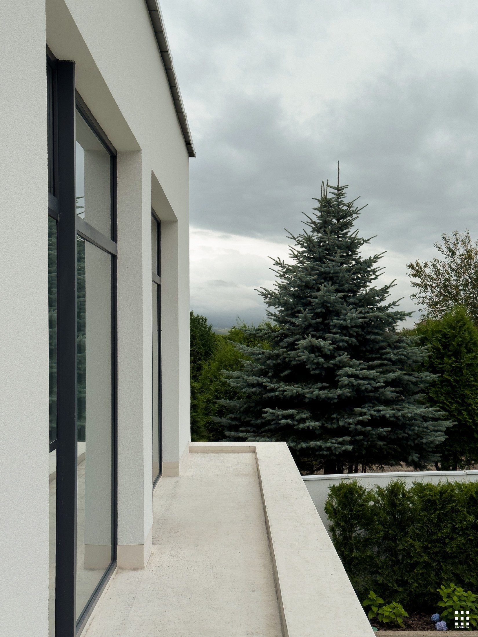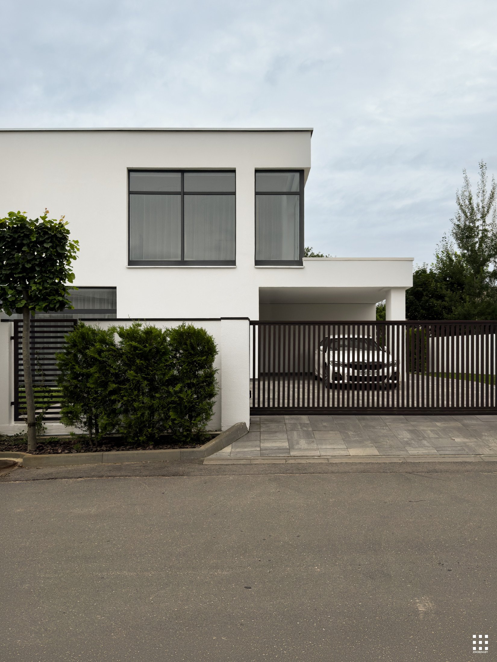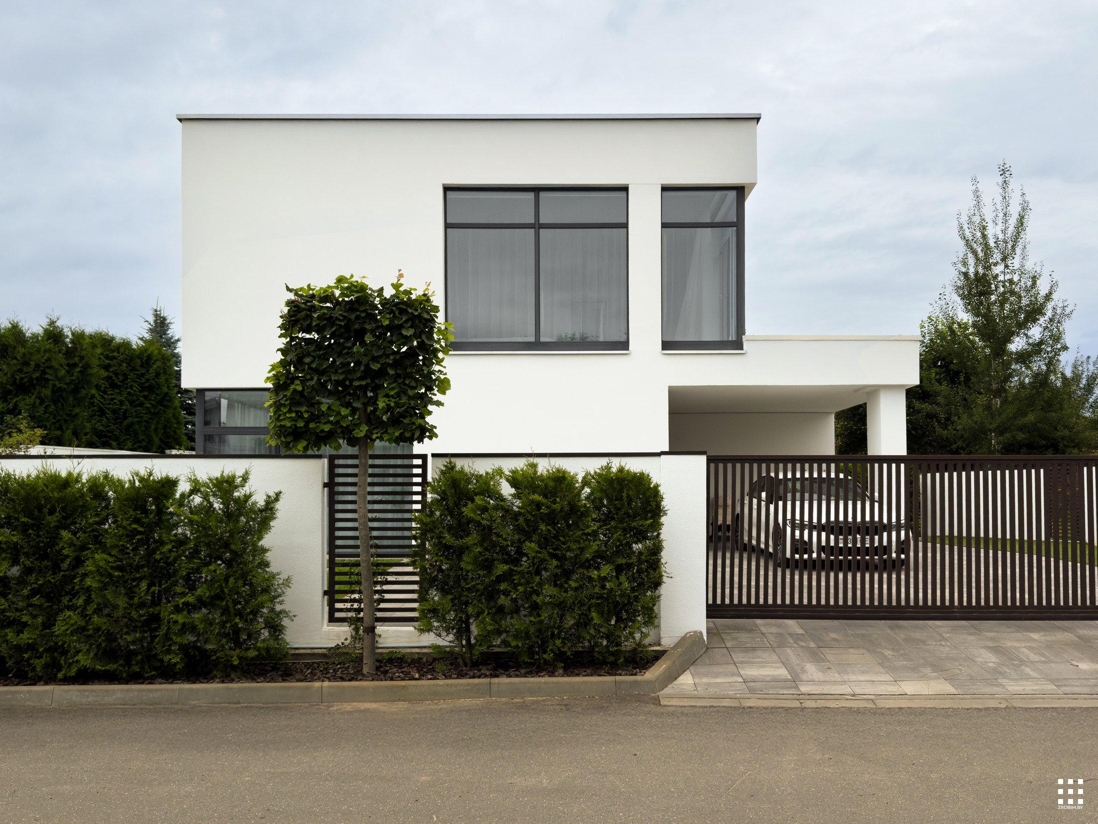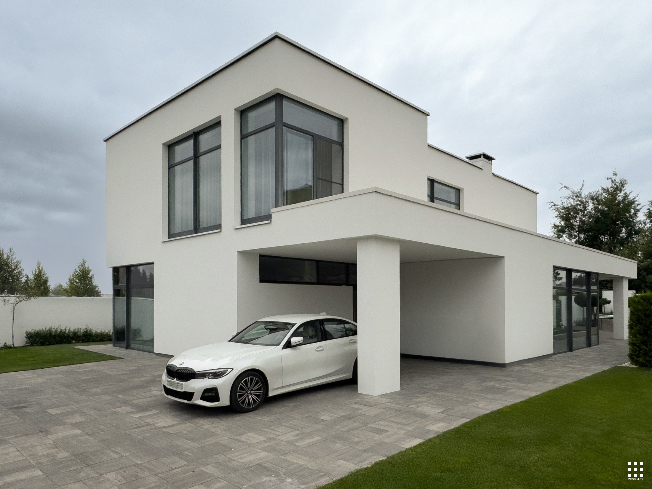 Сучасны дом з вітражным ашкляненнем, эксплуатуемым дахам і аздабленнем тонкім шыракафарматным керамагранітам.