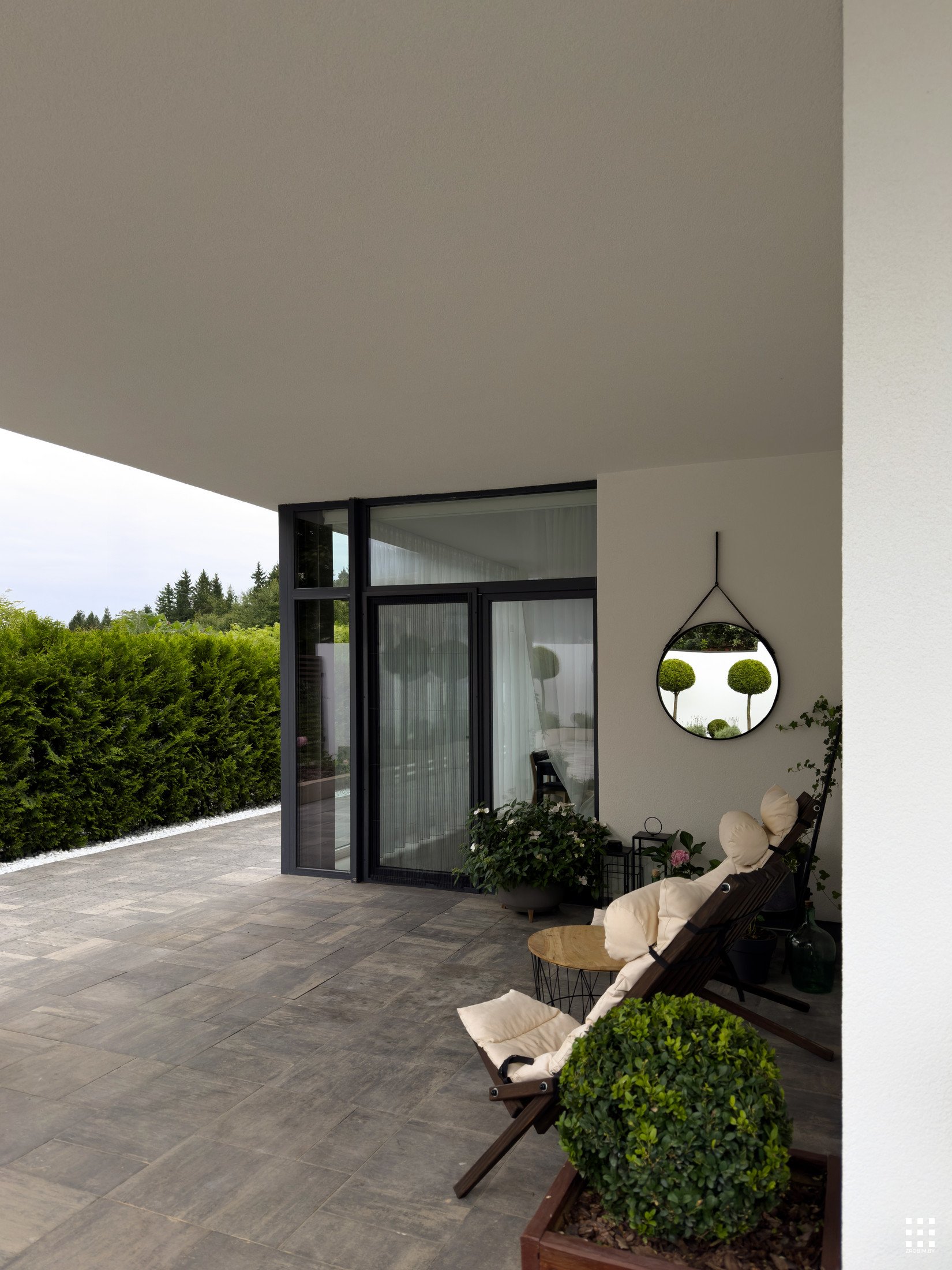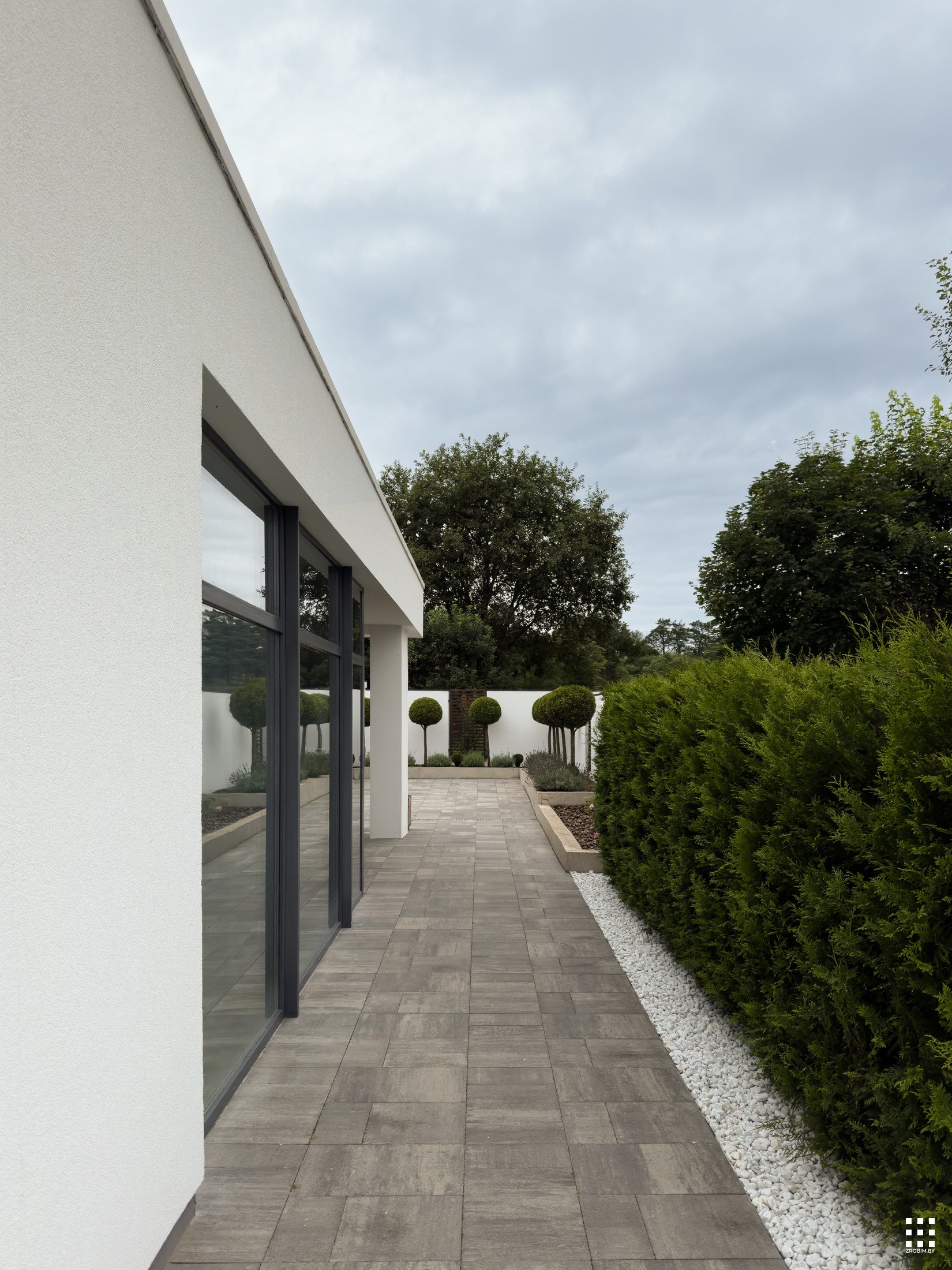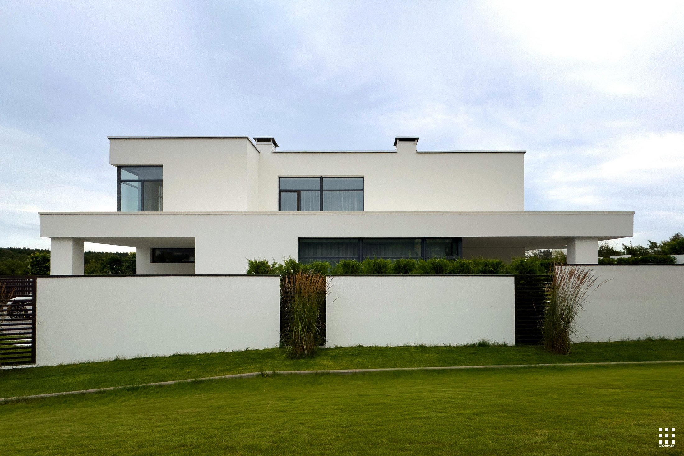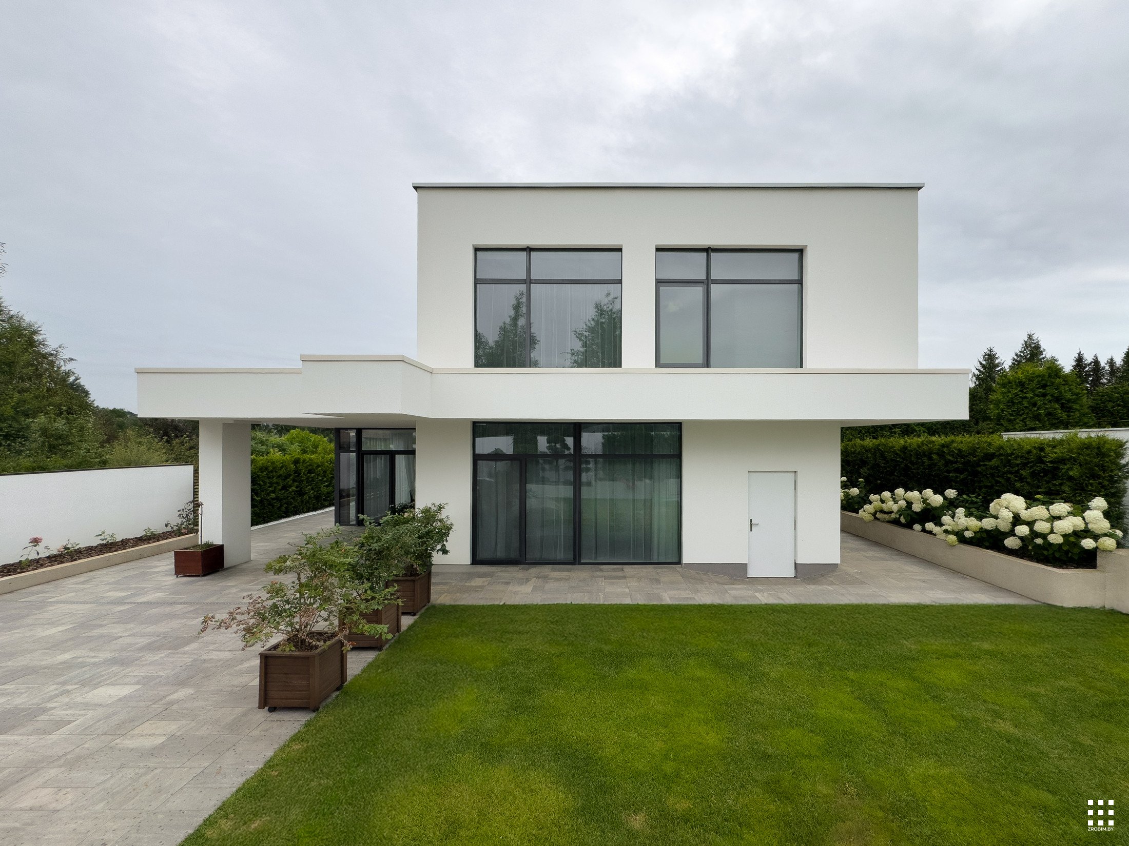 Сучасны дом з вітражным ашкляненнем, эксплуатуемым дахам і аздабленнем тонкім шыракафарматным керамагранітам.