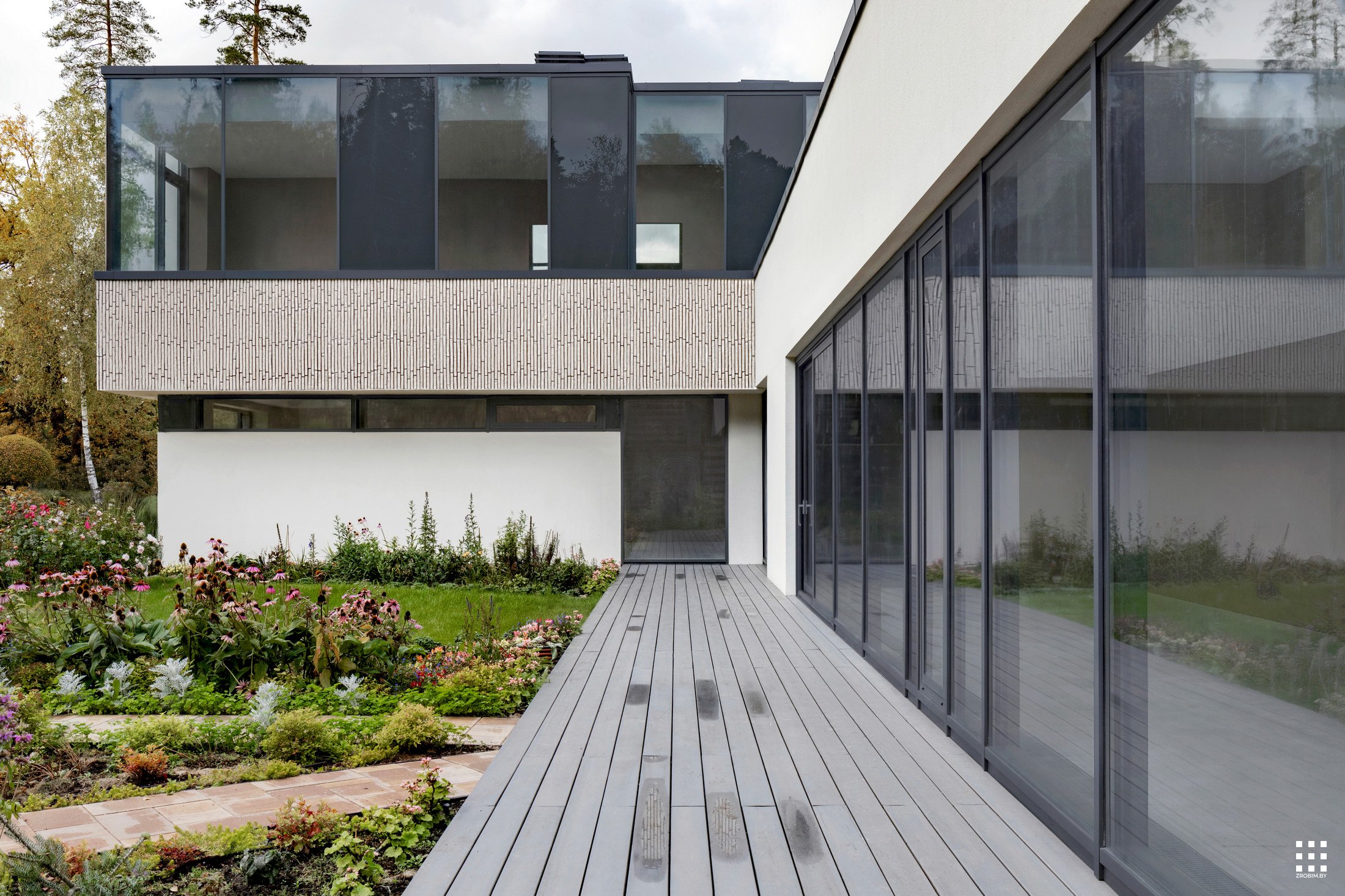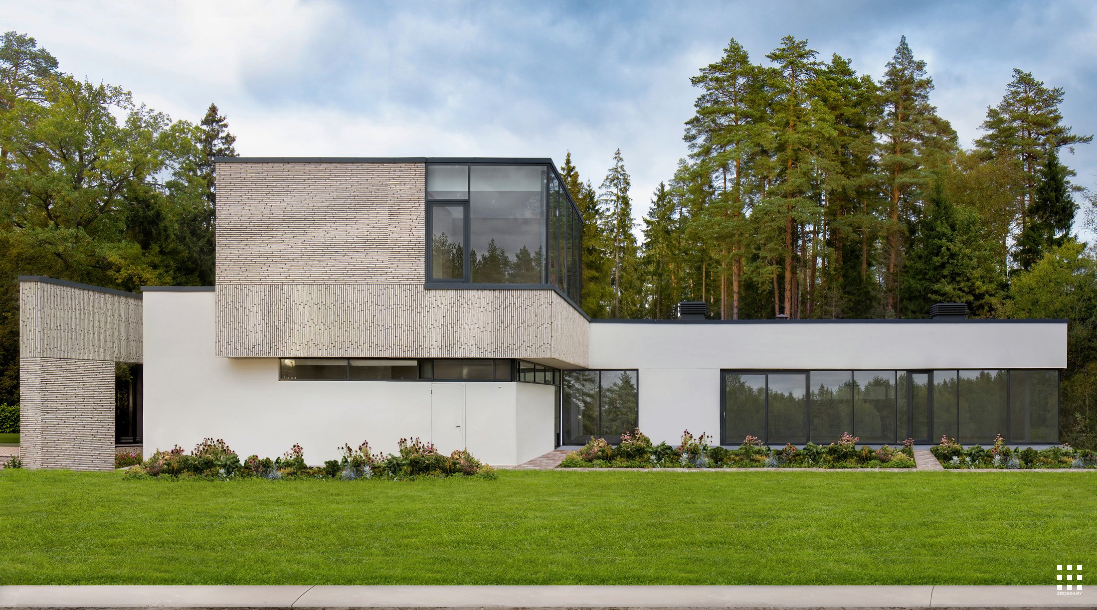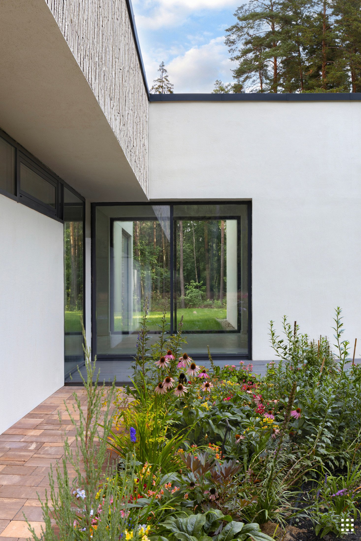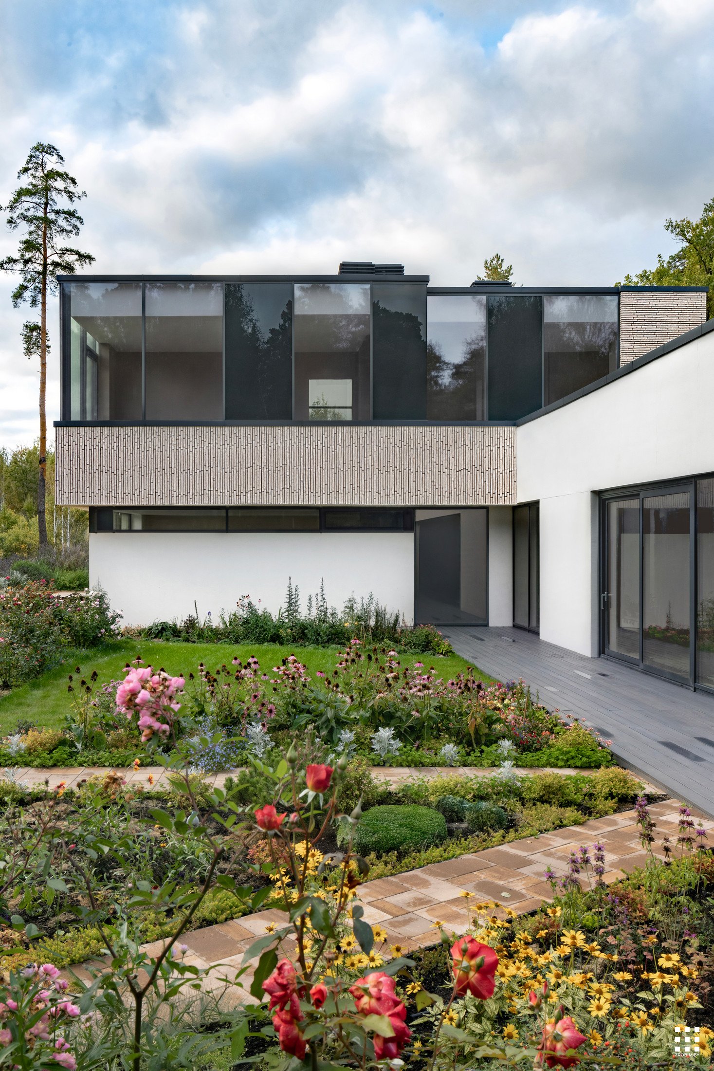 Дом быў спраектаваны для маладой сям'і і ўвасабляе ў сабе ўсе неабходныя ім функцыі. З-за розніцы паміж аб'ёмамі двух паверхаў была спраектаваны дзеючы дах з зелянінай. Мы змаглі інтэграваць прыроду ў архітэктуру з уласным дваром і зялёнай тэрасай. Што тычыцца візуальнага ладу, для фасадаў былі абраныя манахромныя матэрыялы, у прыватнасці пацеркага цэгла, які ўзбагаціў візуальнае ўспрыманне выразнага і лаканічнага дома.