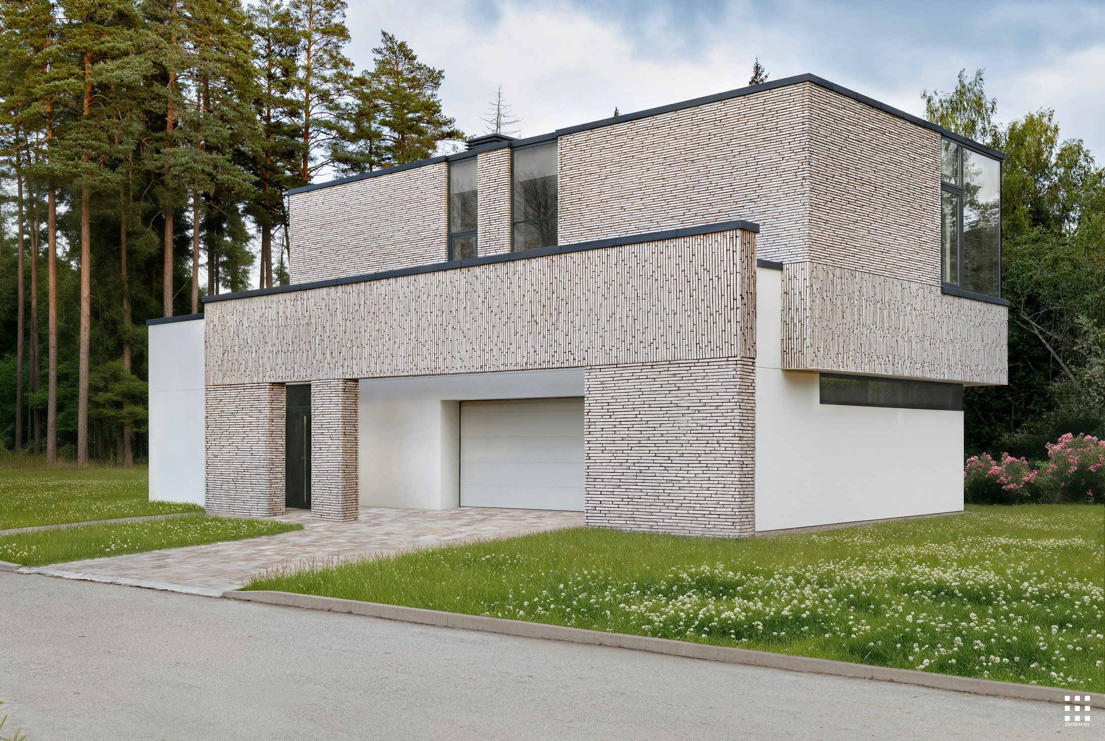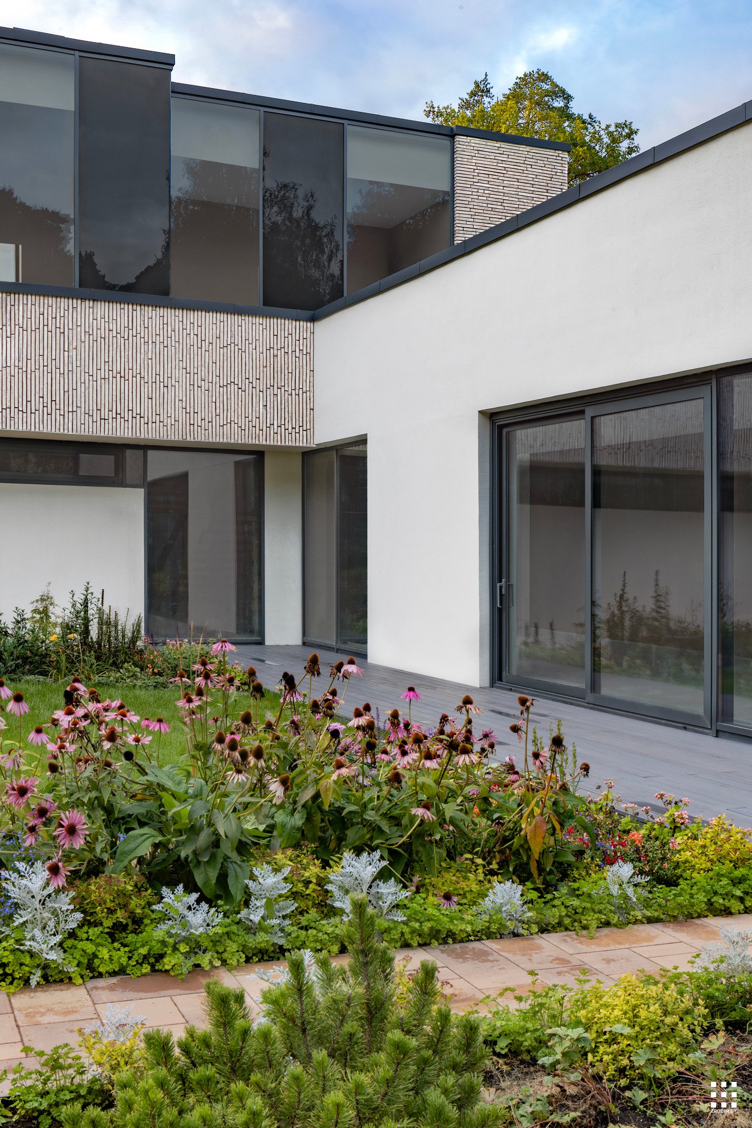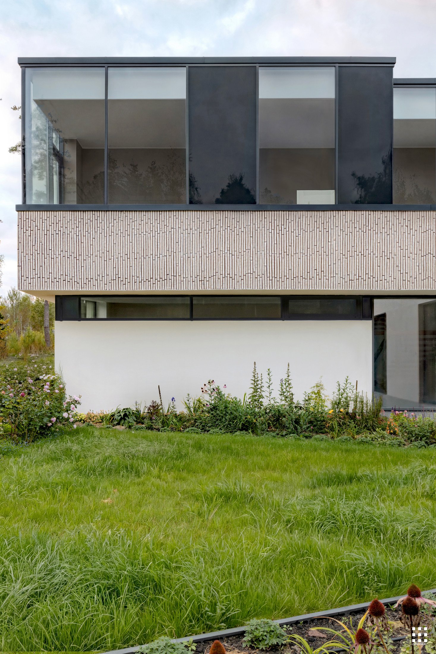 Дом быў спраектаваны для маладой сям'і і ўвасабляе ў сабе ўсе неабходныя ім функцыі. З-за розніцы паміж аб'ёмамі двух паверхаў была спраектаваны дзеючы дах з зелянінай. Мы змаглі інтэграваць прыроду ў архітэктуру з уласным дваром і зялёнай тэрасай. Што тычыцца візуальнага ладу, для фасадаў былі абраныя манахромныя матэрыялы, у прыватнасці пацеркага цэгла, які ўзбагаціў візуальнае ўспрыманне выразнага і лаканічнага дома.