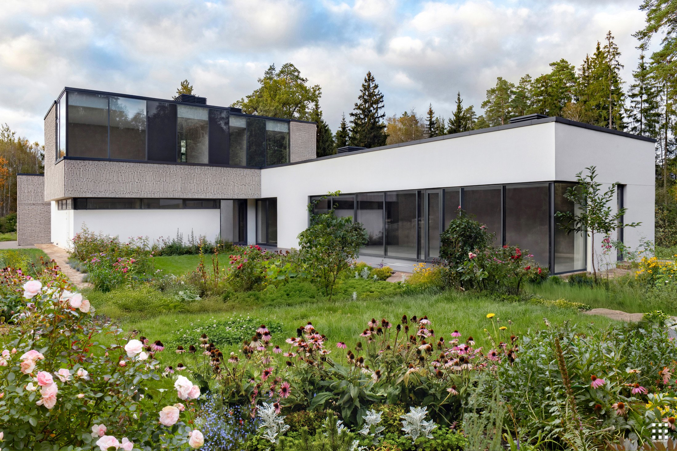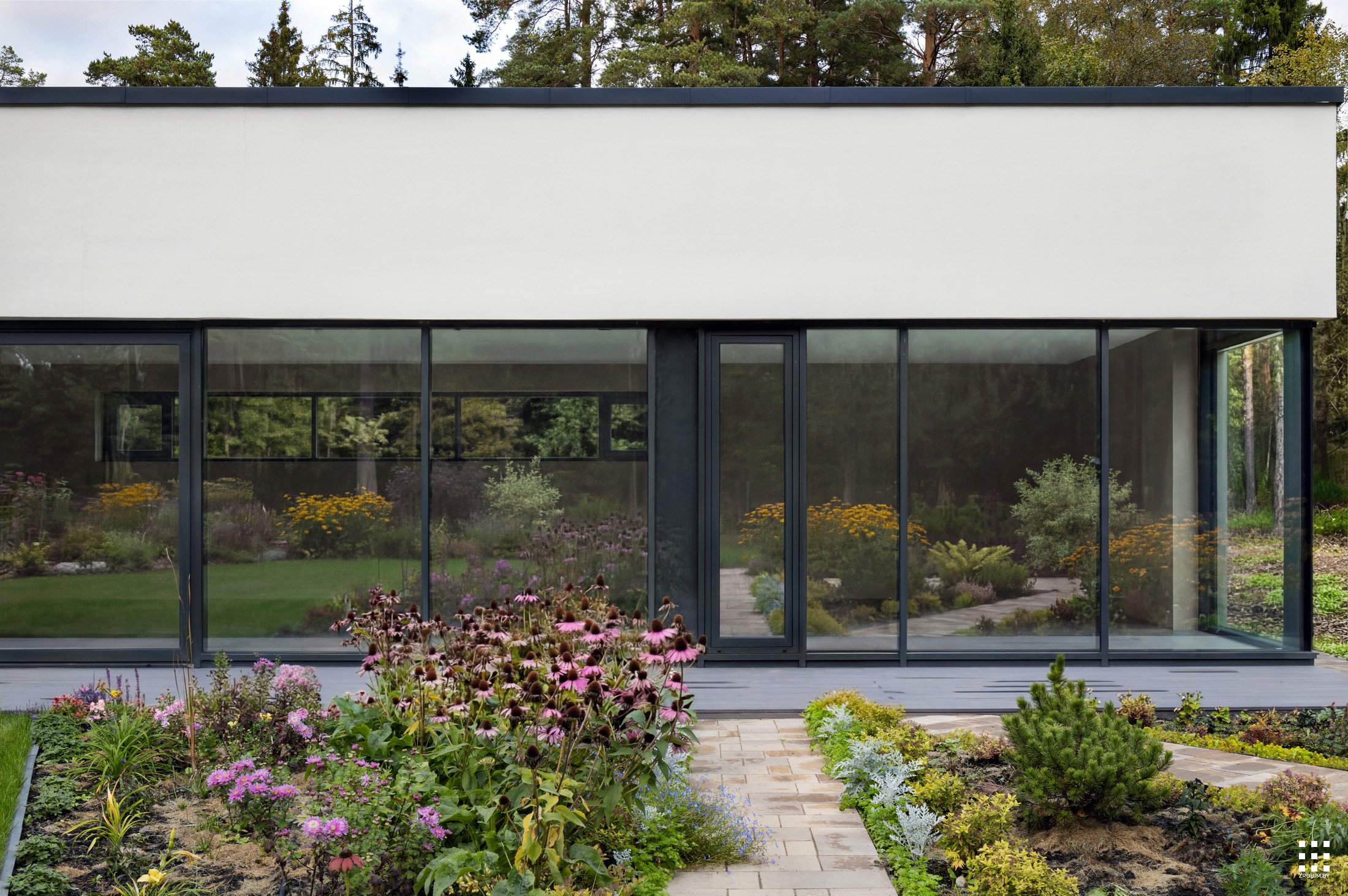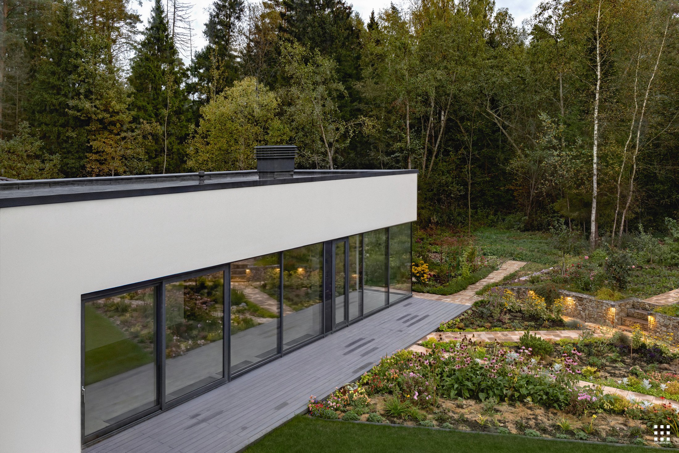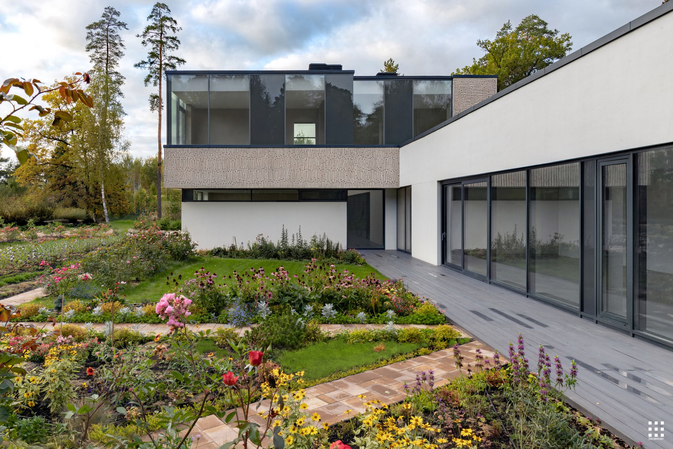 Дом быў спраектаваны для маладой сям'і і ўвасабляе ў сабе ўсе неабходныя ім функцыі. З-за розніцы паміж аб'ёмамі двух паверхаў была спраектаваны дзеючы дах з зелянінай. Мы змаглі інтэграваць прыроду ў архітэктуру з уласным дваром і зялёнай тэрасай. Што тычыцца візуальнага ладу, для фасадаў былі абраныя манахромныя матэрыялы, у прыватнасці пацеркага цэгла, які ўзбагаціў візуальнае ўспрыманне выразнага і лаканічнага дома.