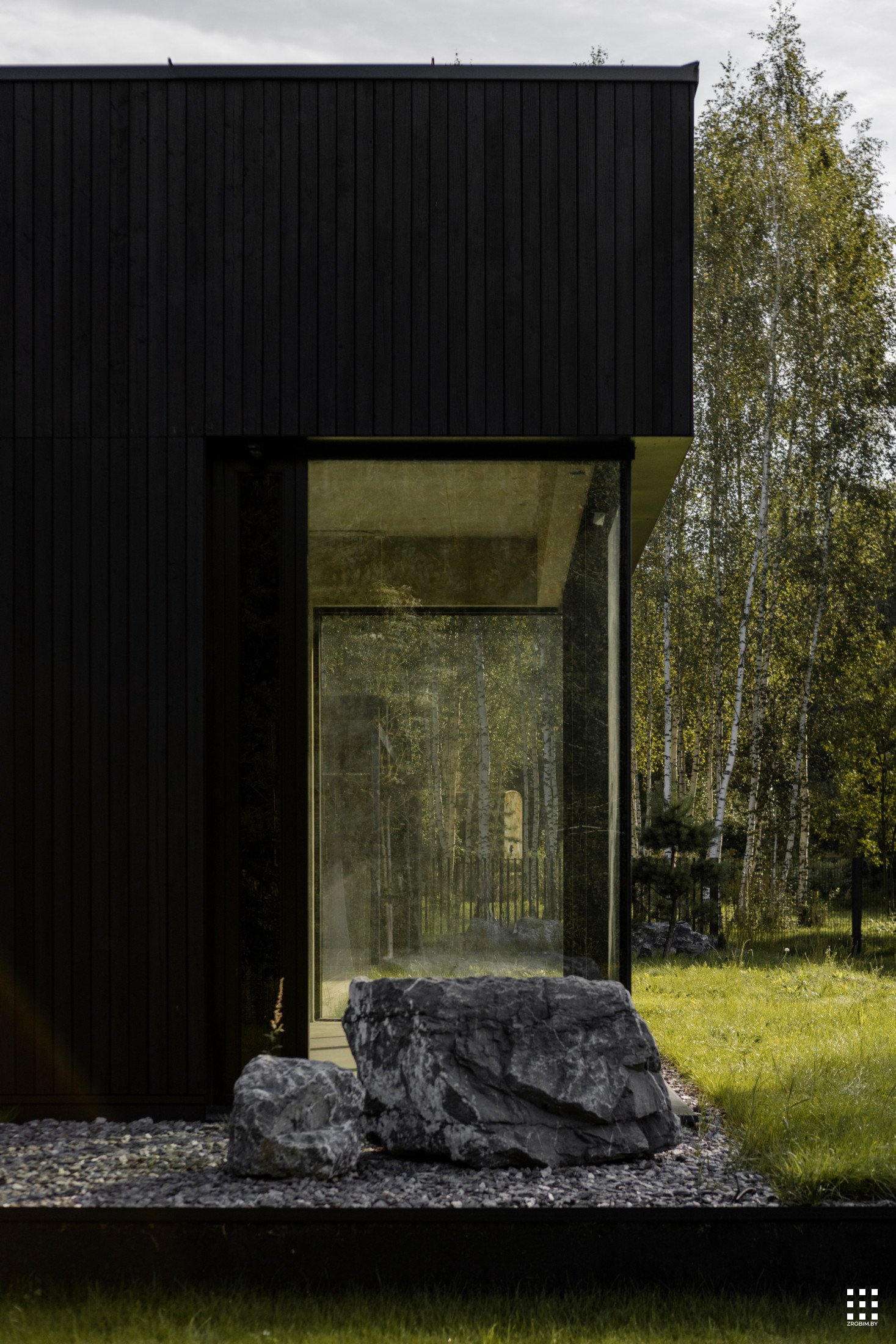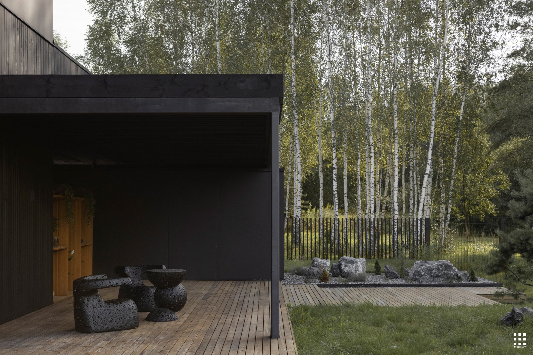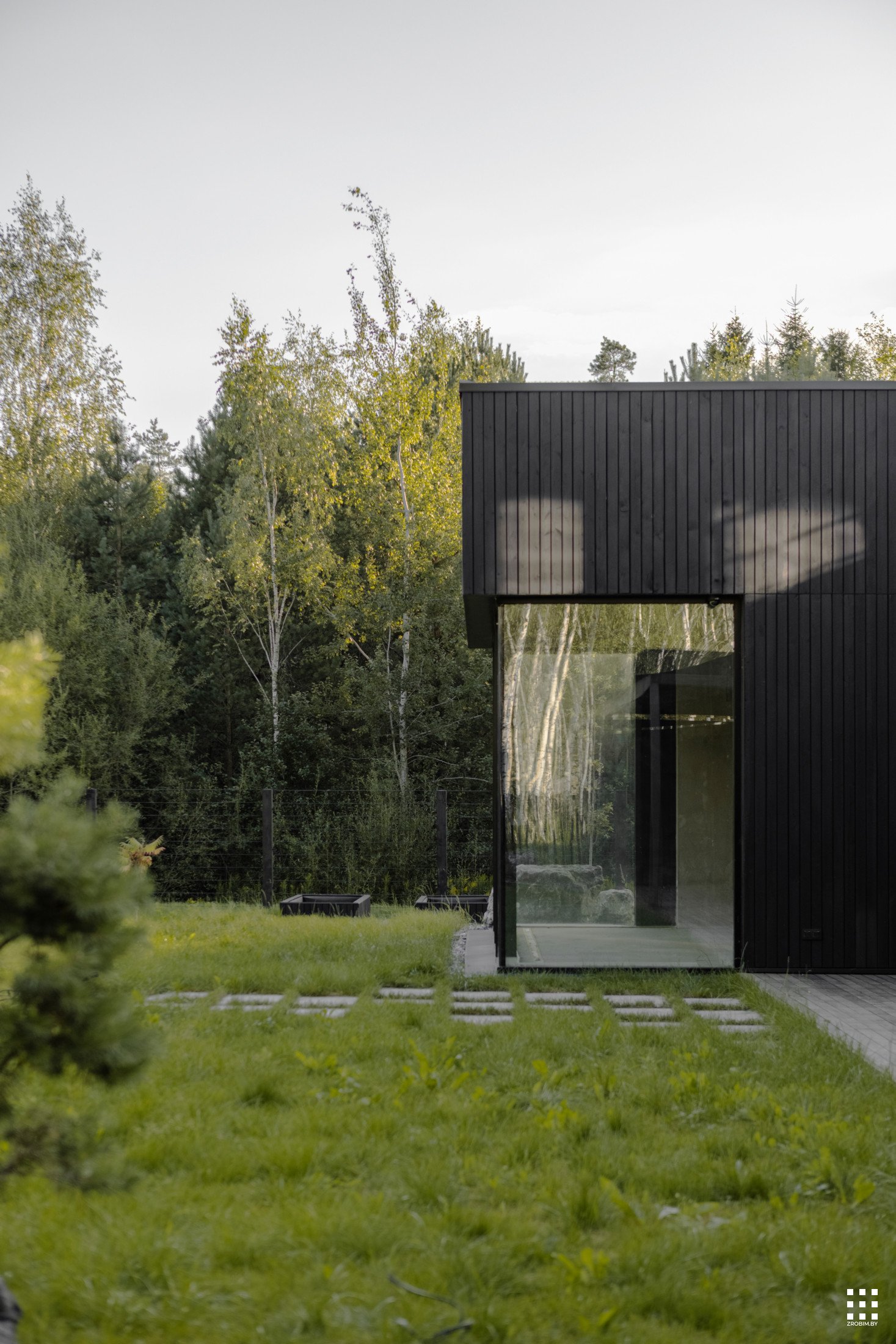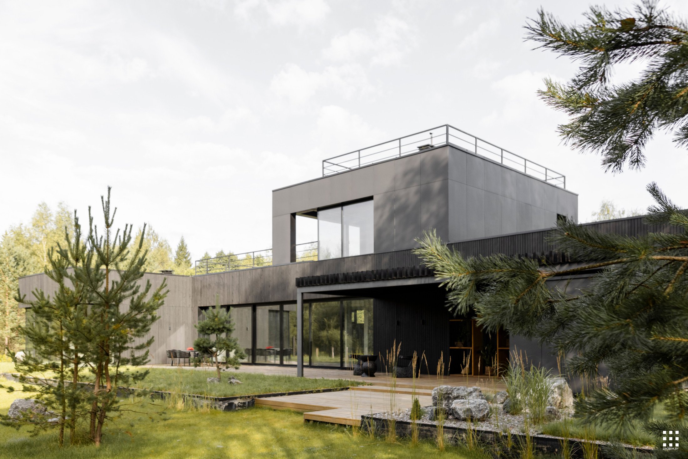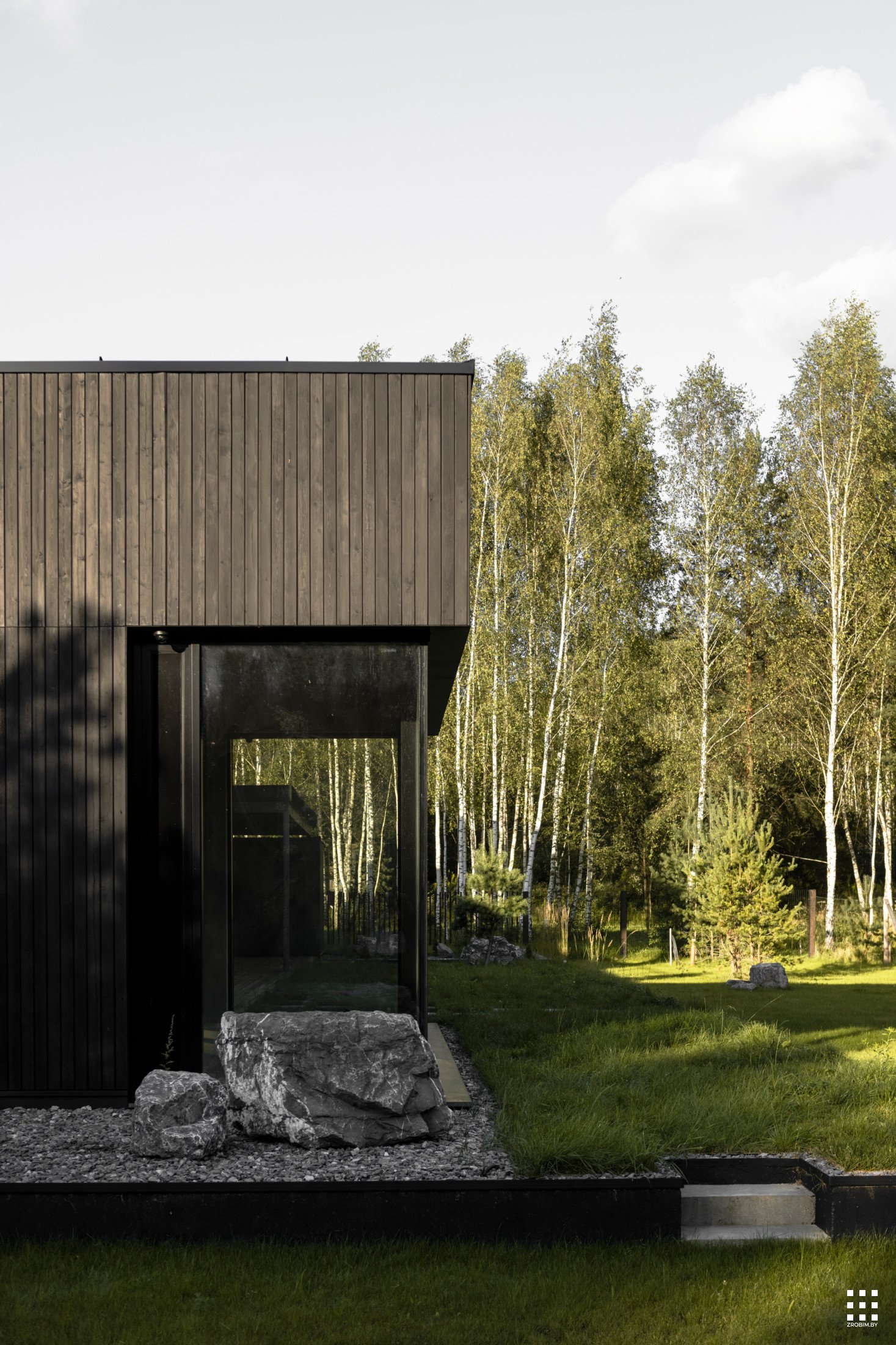 Паколькі ўчастак пераважна акружаны лесам, мы спецыяльна размясцілі дом на ўчастку там, каб стварыць прыватны ўнутраны двор, а з вялікіх панарамных вокнаў адкрываецца прыгожы від на лясны масіў.