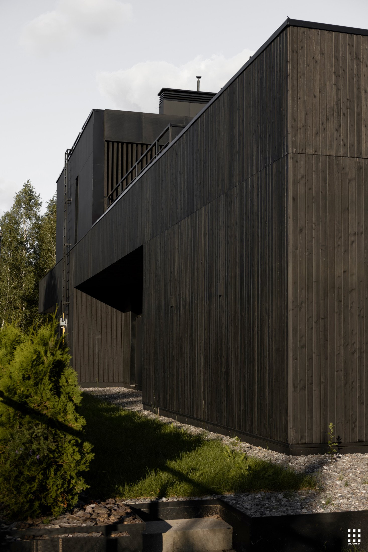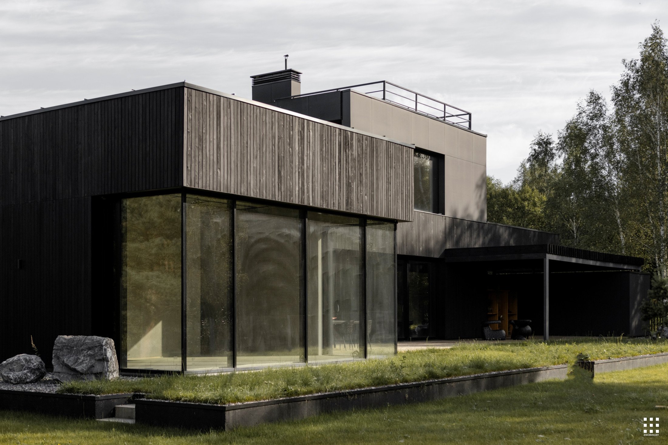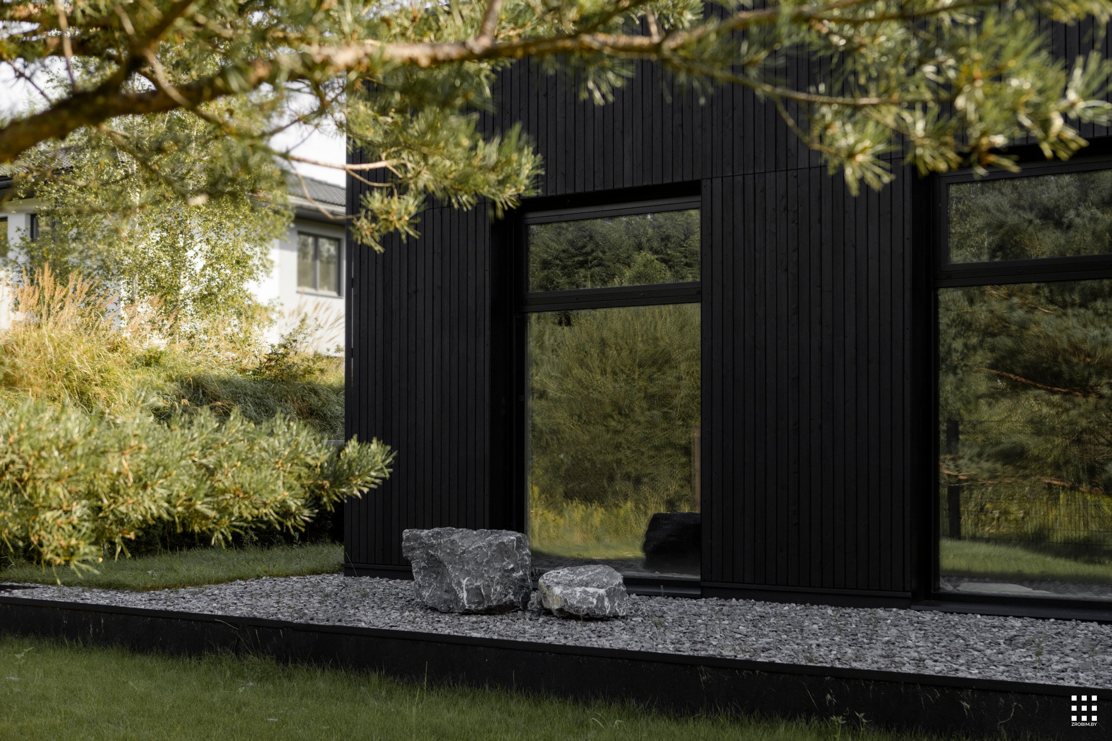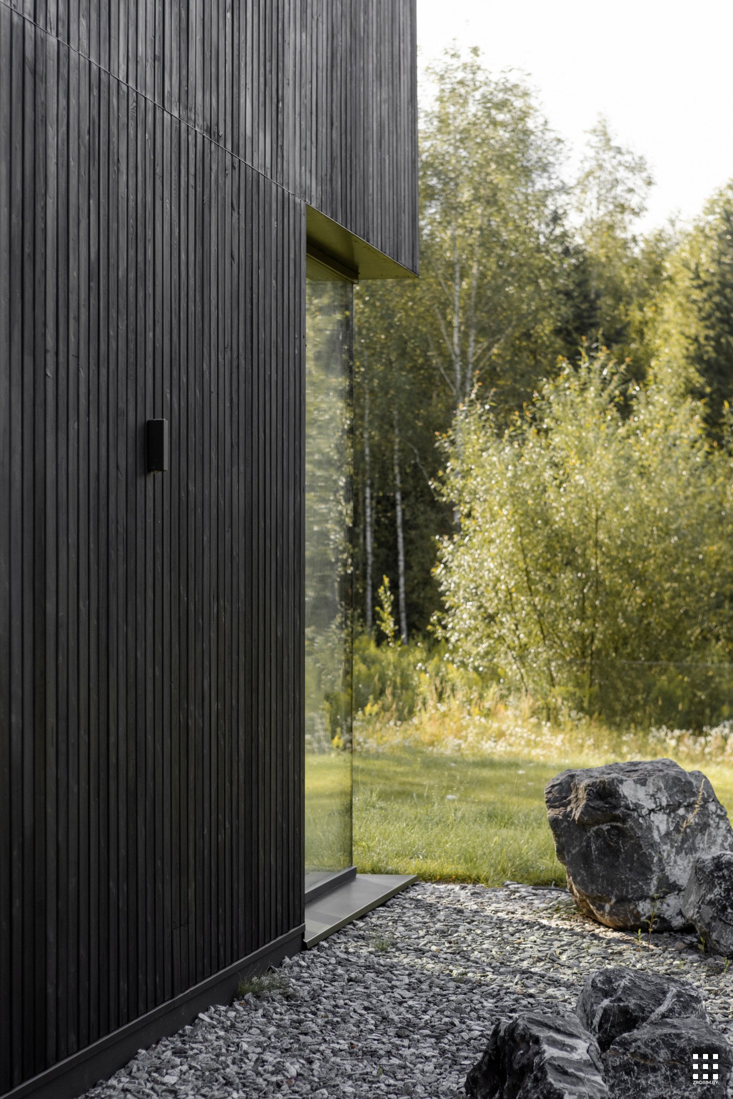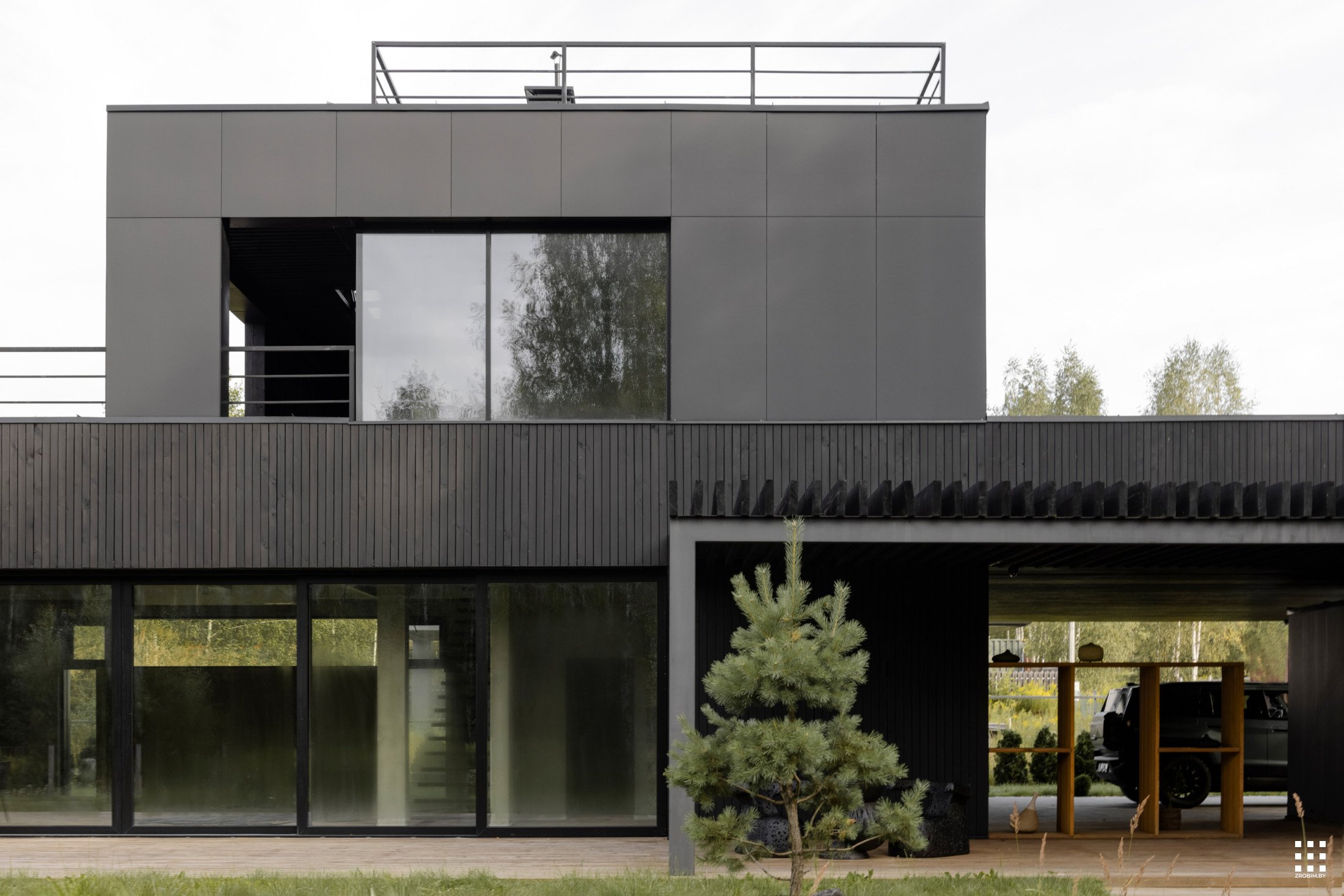 Паколькі ўчастак пераважна акружаны лесам, мы спецыяльна размясцілі дом на ўчастку там, каб стварыць прыватны ўнутраны двор, а з вялікіх панарамных вокнаў адкрываецца прыгожы від на лясны масіў.