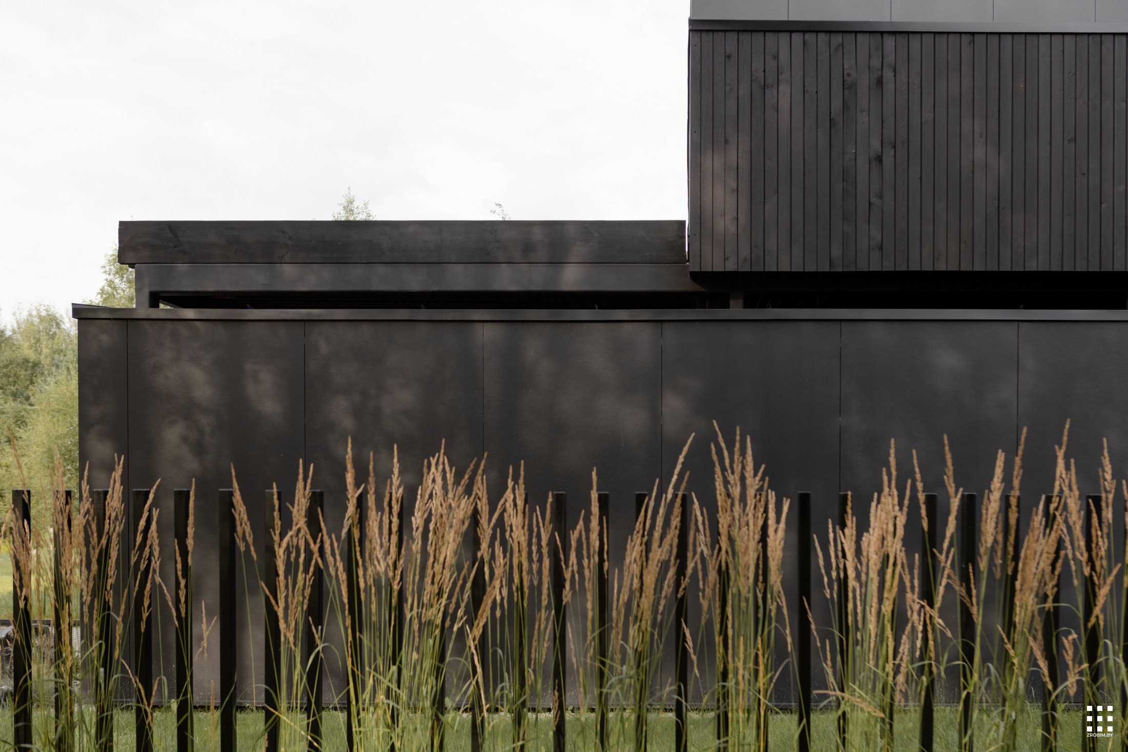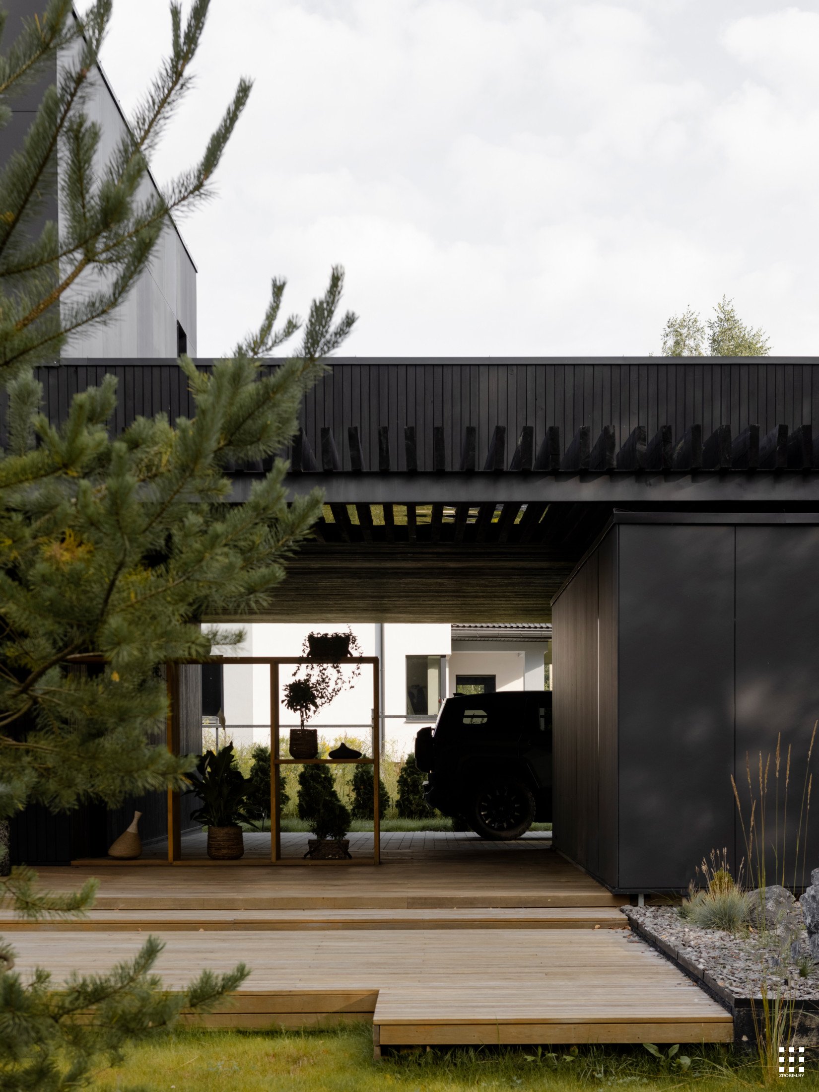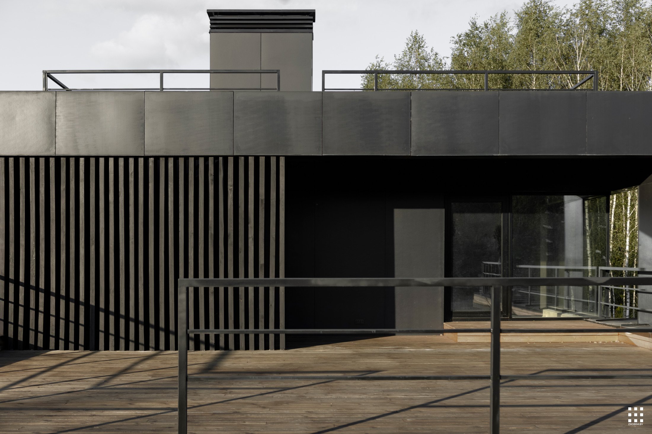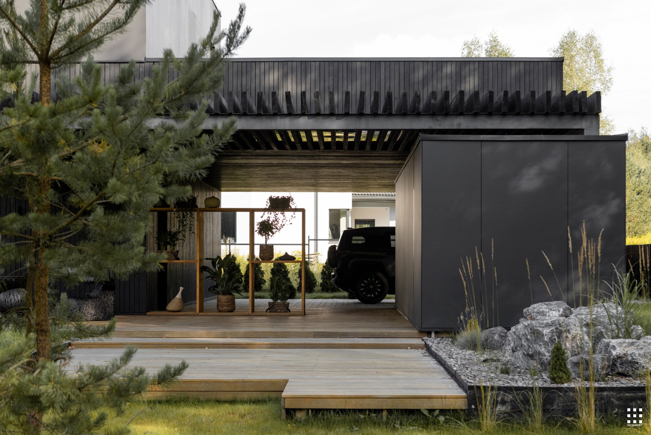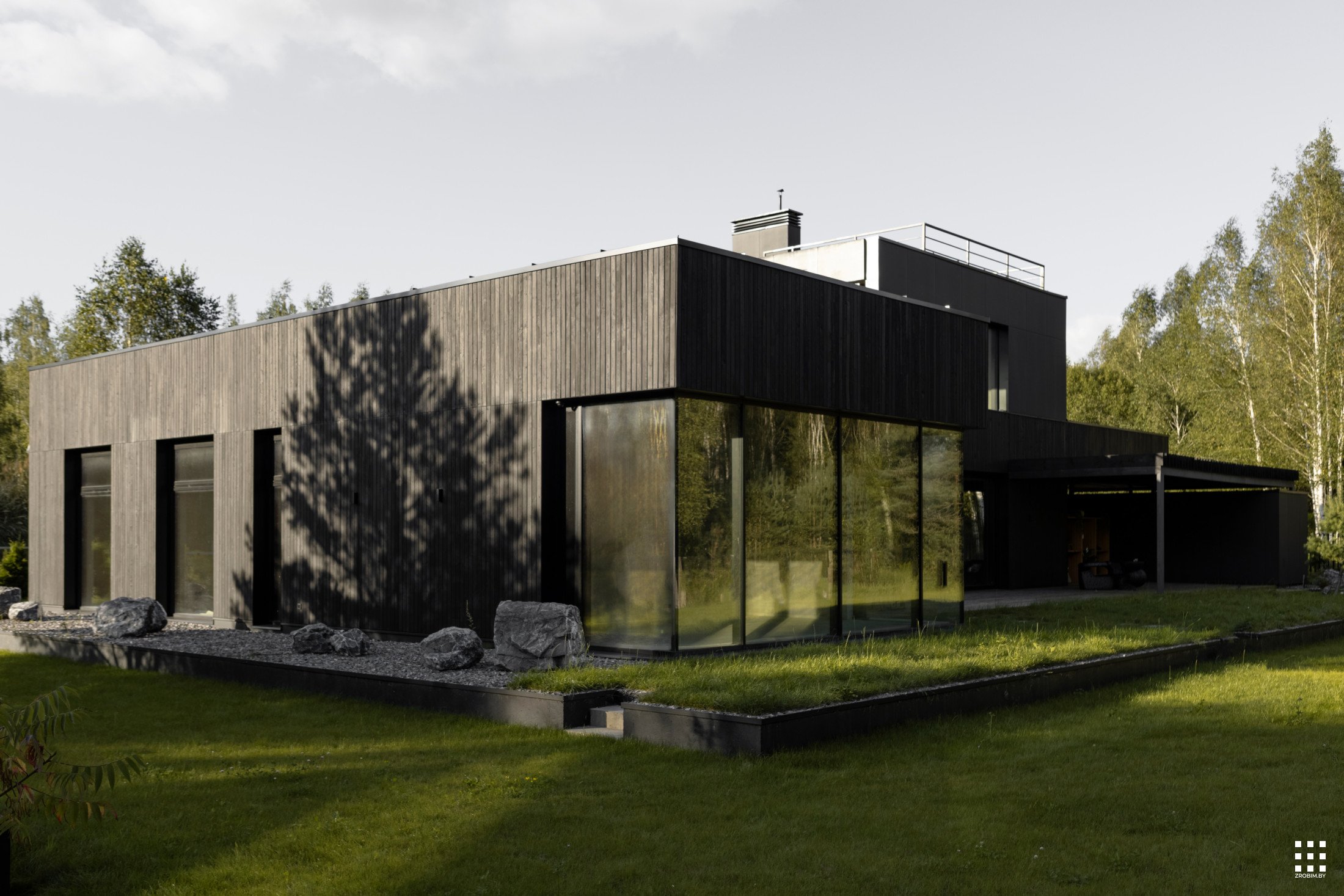Паколькі ўчастак пераважна акружаны лесам, мы спецыяльна размясцілі дом на ўчастку там, каб стварыць прыватны ўнутраны двор, а з вялікіх панарамных вокнаў адкрываецца прыгожы від на лясны масіў.