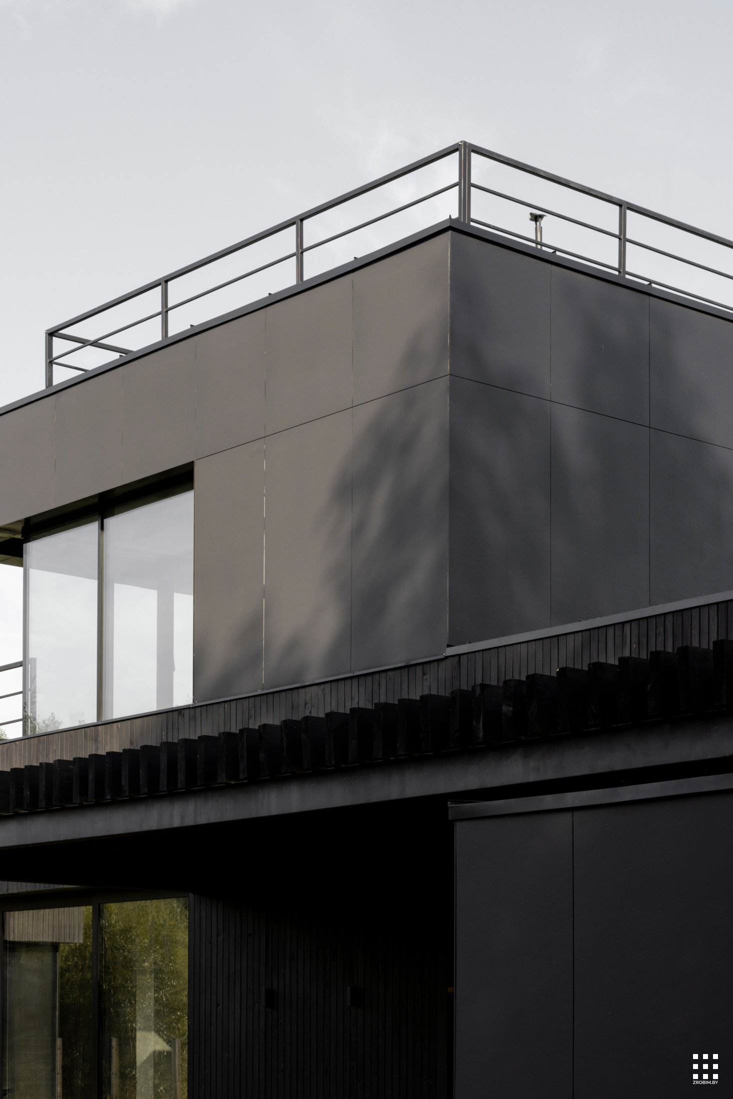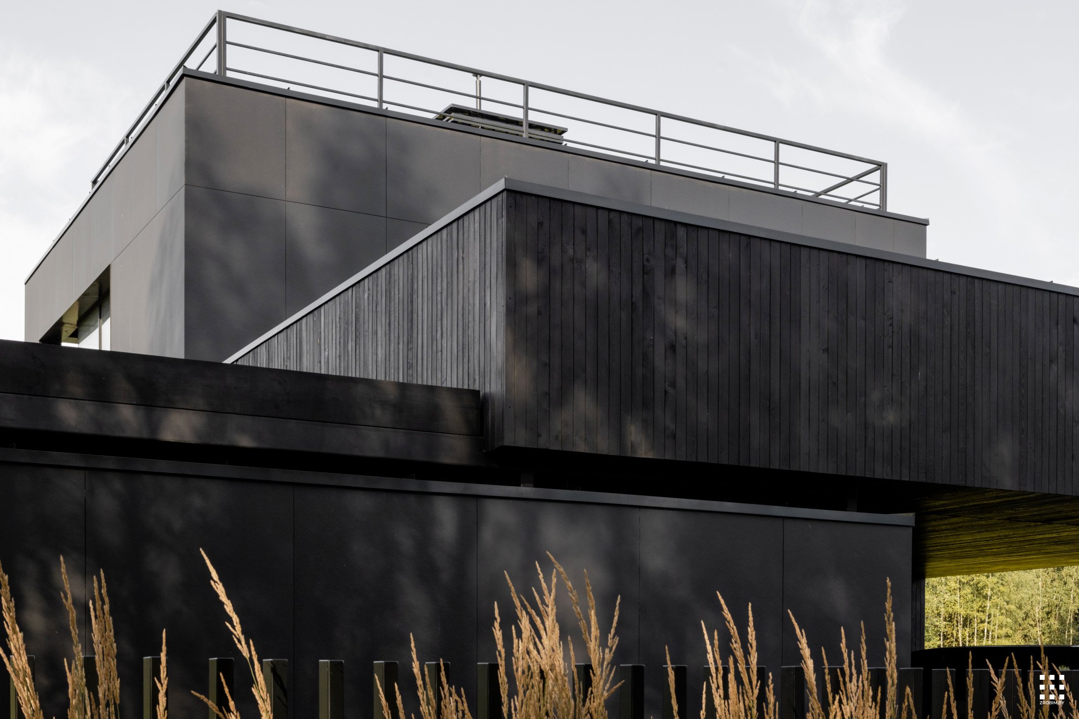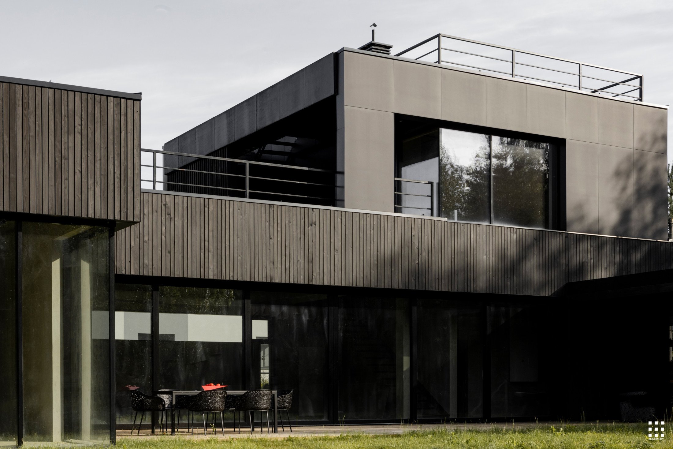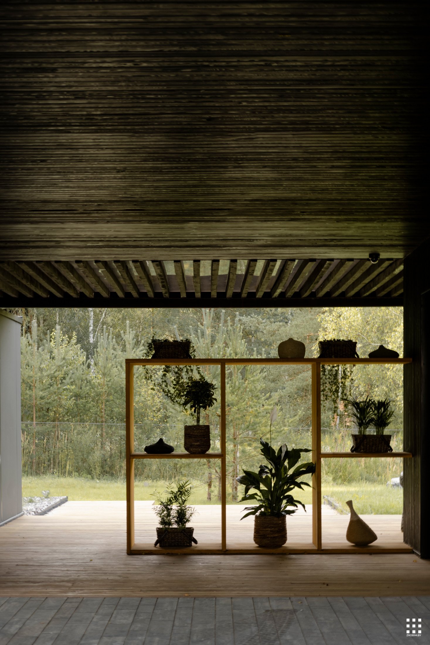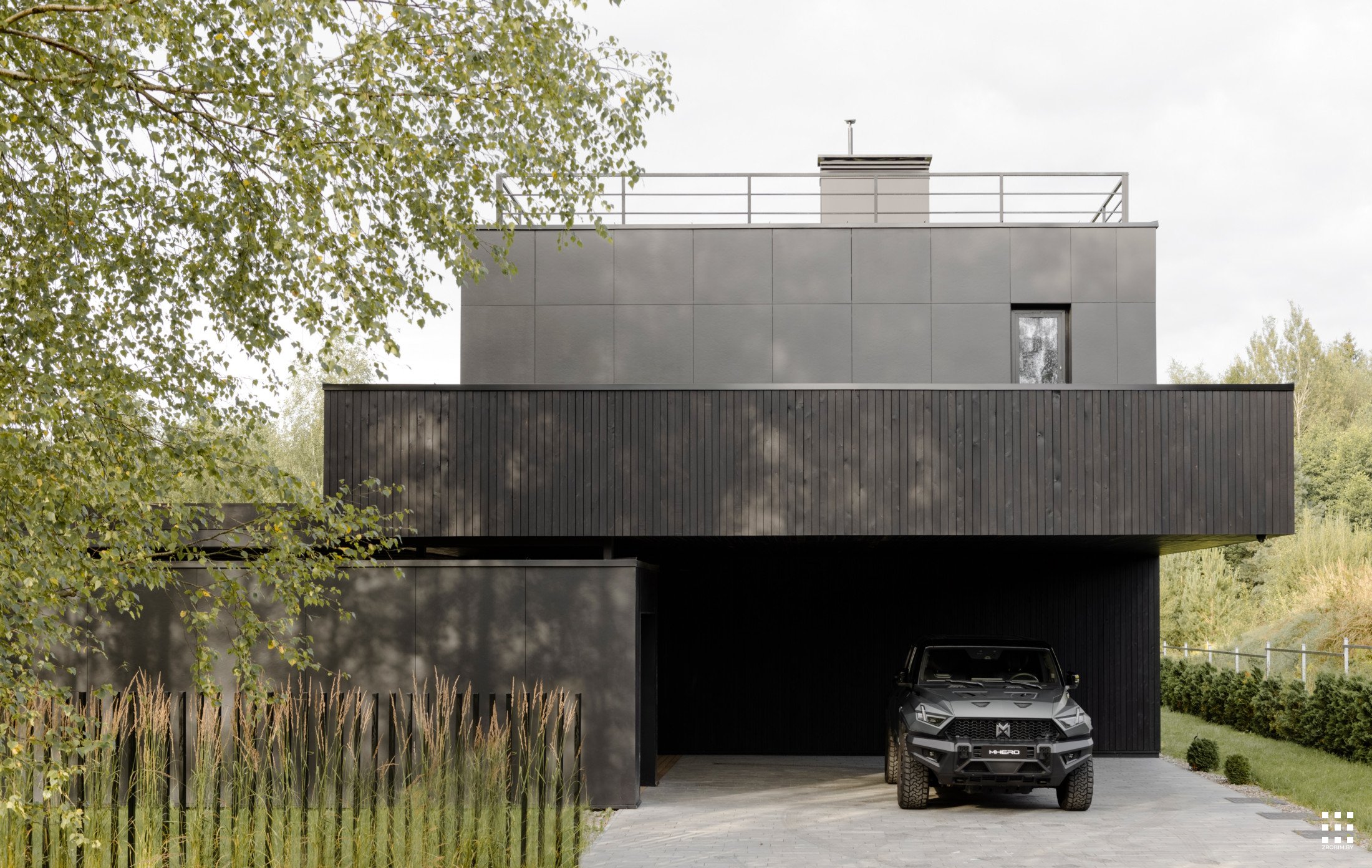 Паколькі ўчастак пераважна акружаны лесам, мы спецыяльна размясцілі дом на ўчастку там, каб стварыць прыватны ўнутраны двор, а з вялікіх панарамных вокнаў адкрываецца прыгожы від на лясны масіў.