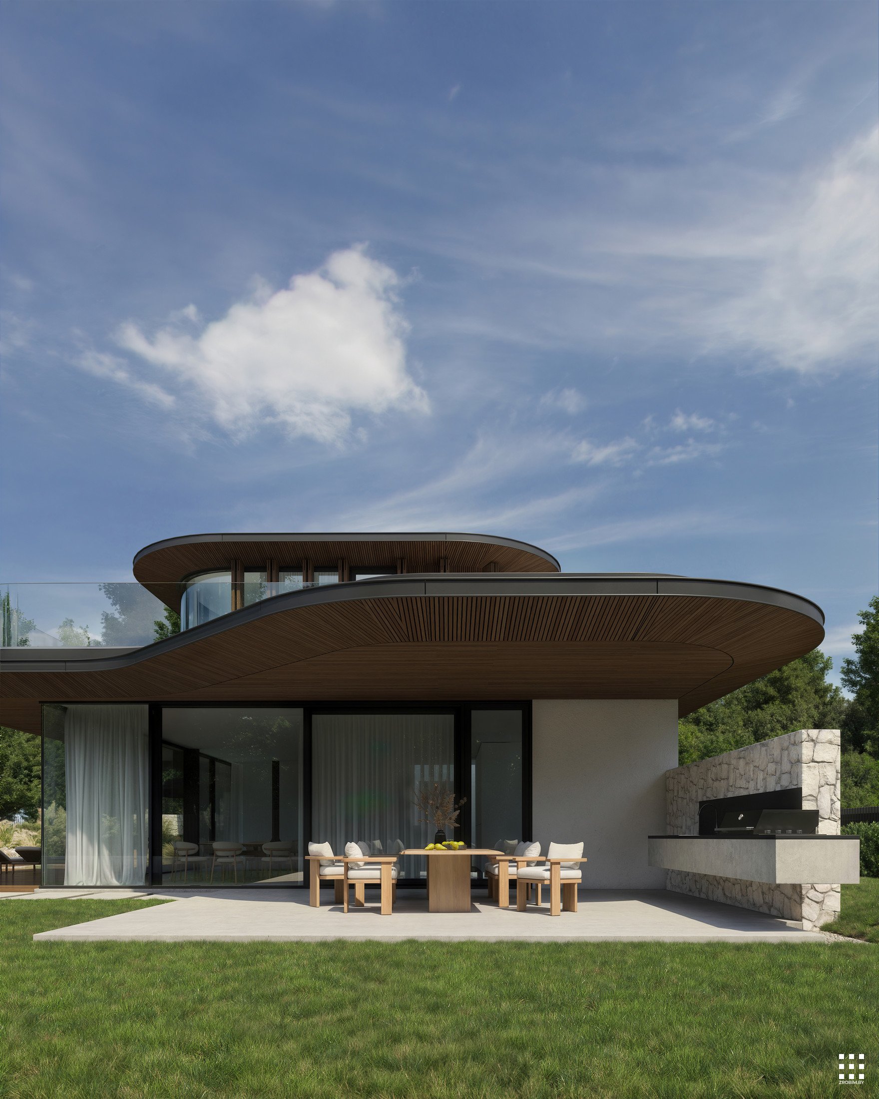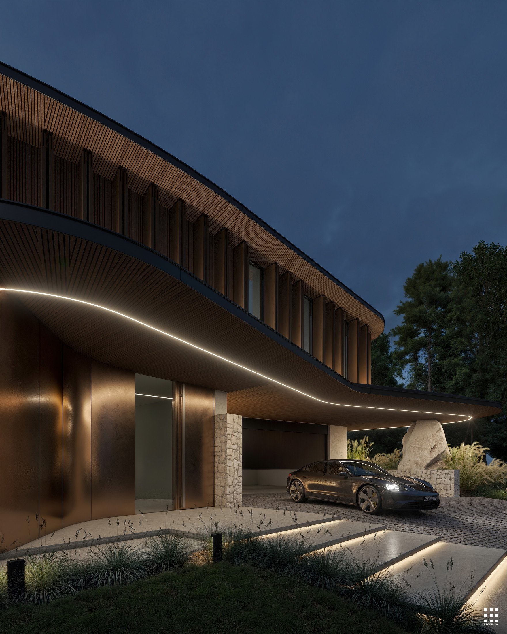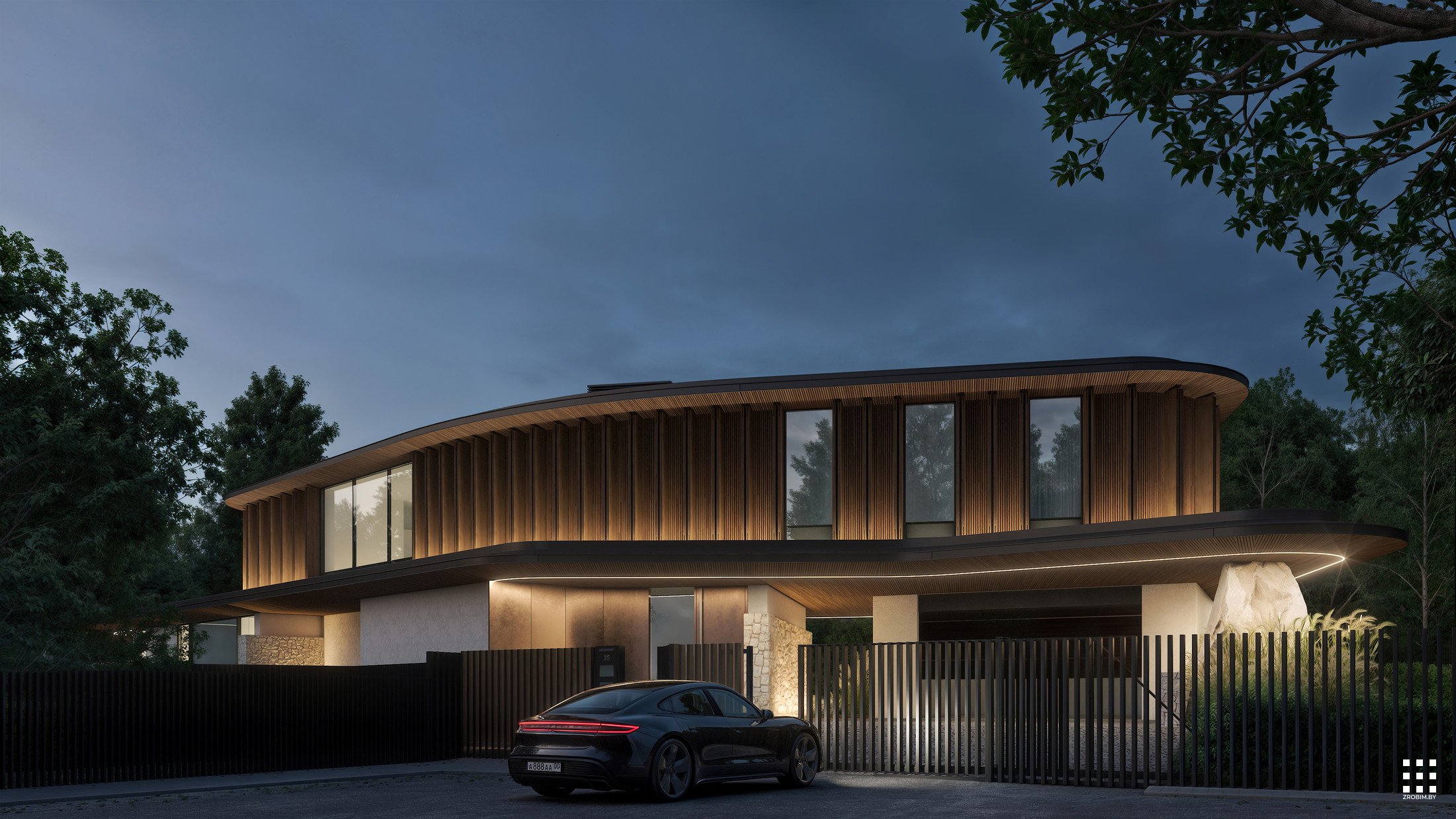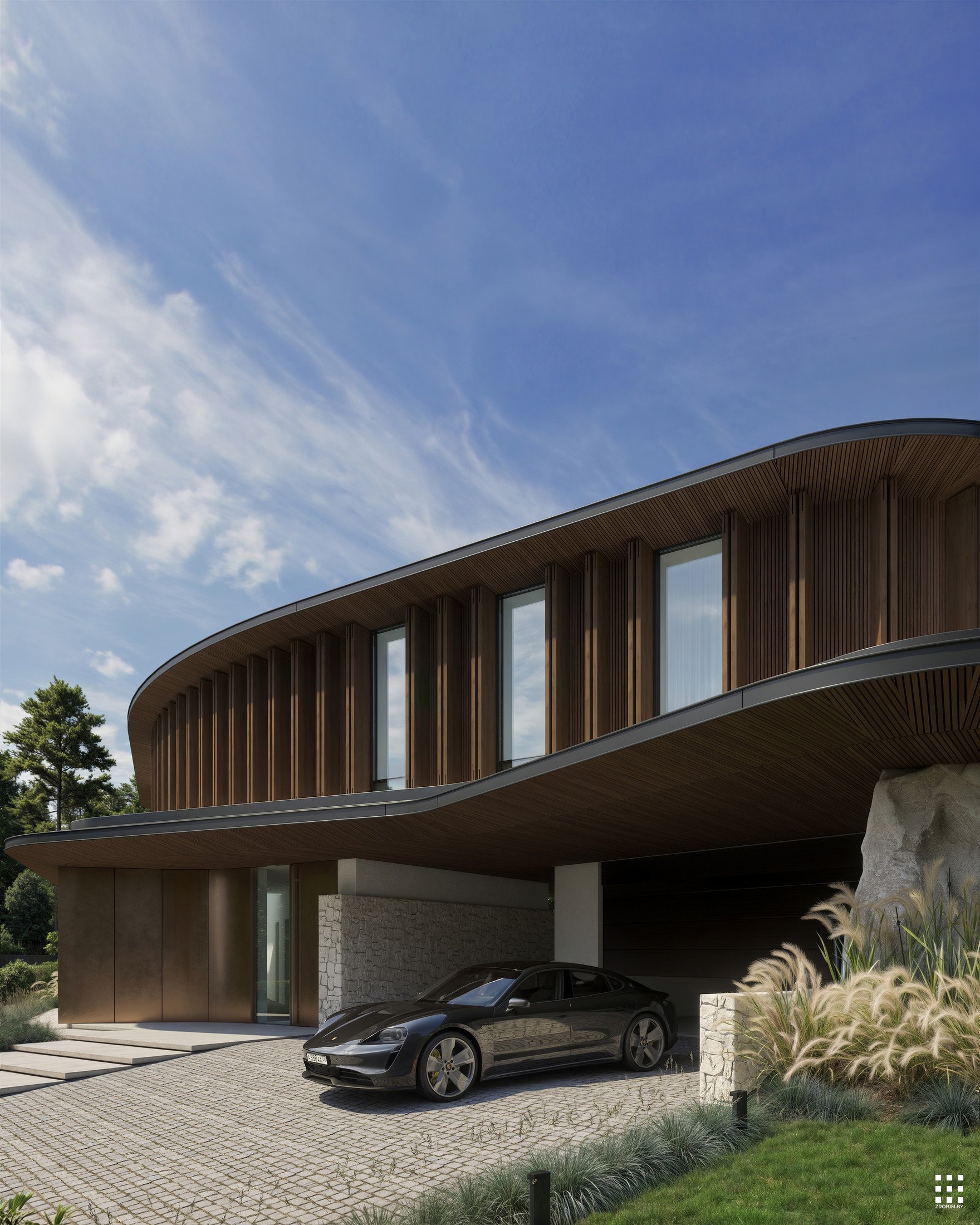 Галоўная мэта - злучыць архітэктуру з прыродай і стварыць просты і лаканічны вобраз з разыначкай. Кліентам не падабаліся прамыя формы і куты. Жадалася чагосьці больш прыроднага і натуральнага, біяморфнага, але на нюансах, у духу параметрыкі. Мы знайшлі рашэнне праз кантраст строгія шкляныя паверхні гармануюць з цёплым драўляным падстрэшкам, а кожны элемент фасада працуе на эфект лёгкасці і сучаснасці.