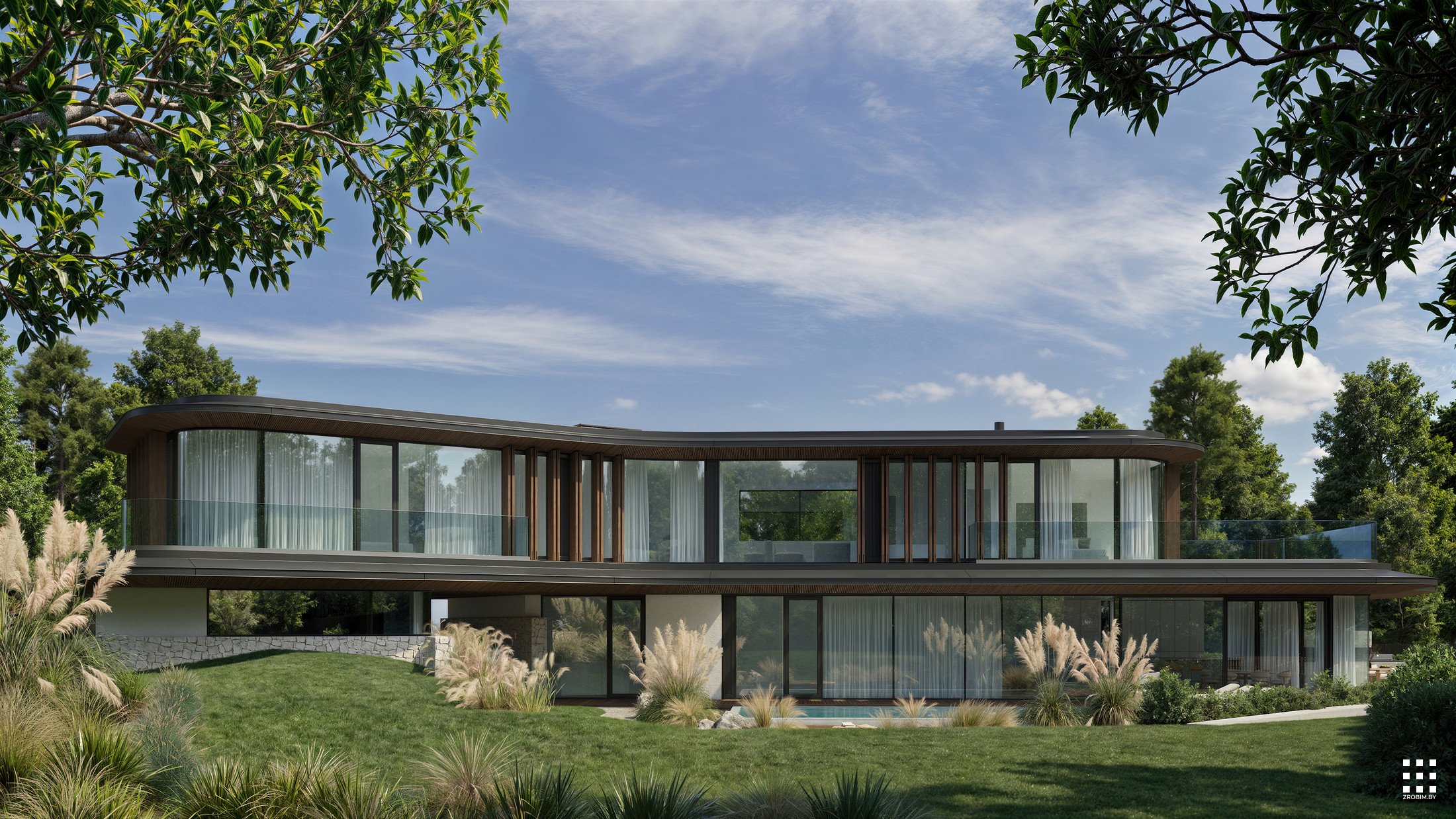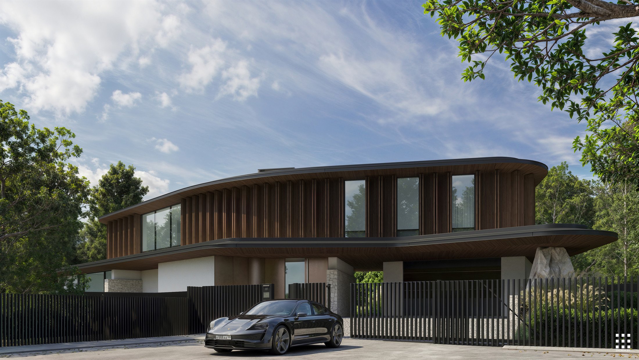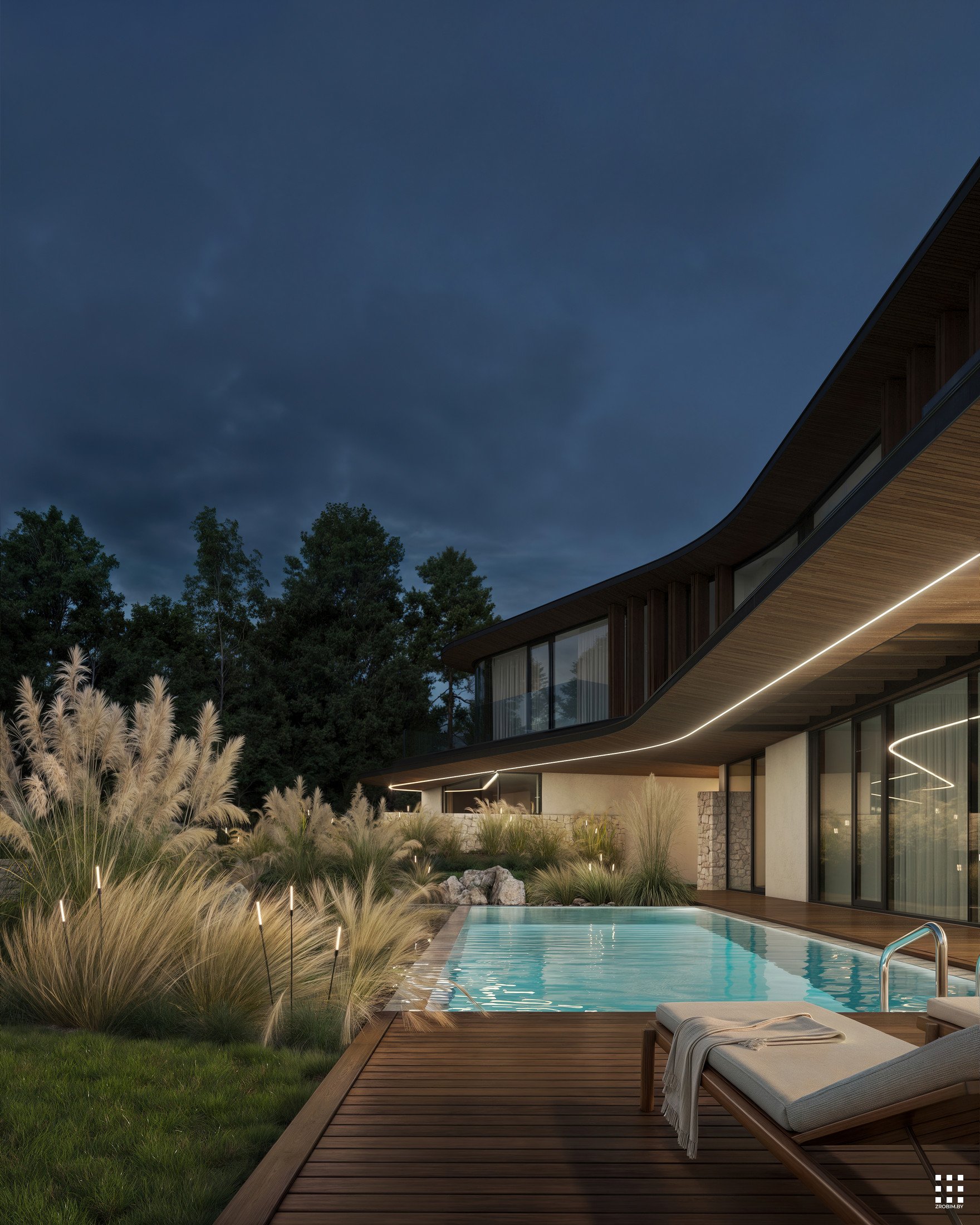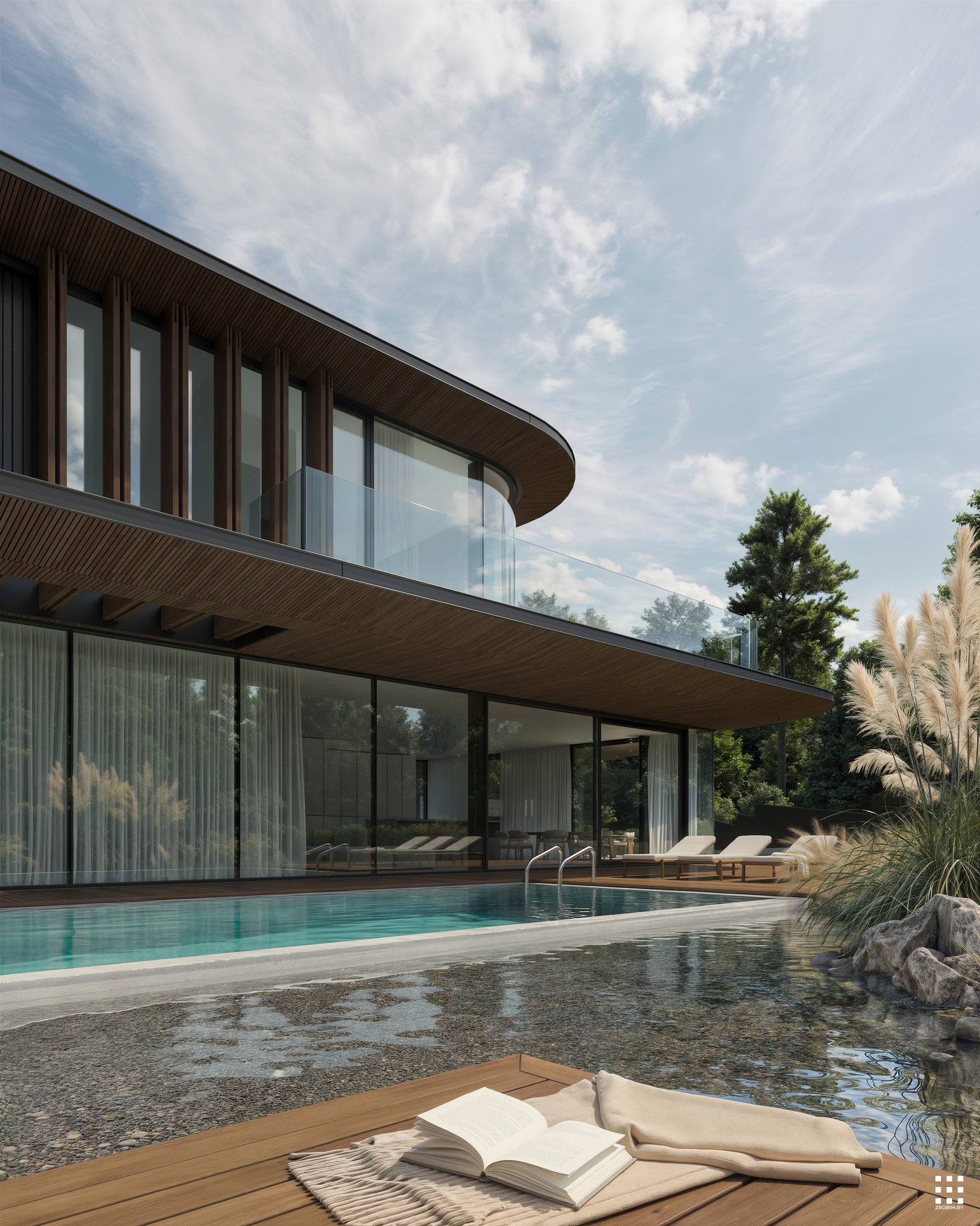 Галоўная мэта - злучыць архітэктуру з прыродай і стварыць просты і лаканічны вобраз з разыначкай. Кліентам не падабаліся прамыя формы і куты. Жадалася чагосьці больш прыроднага і натуральнага, біяморфнага, але на нюансах, у духу параметрыкі. Мы знайшлі рашэнне праз кантраст строгія шкляныя паверхні гармануюць з цёплым драўляным падстрэшкам, а кожны элемент фасада працуе на эфект лёгкасці і сучаснасці.