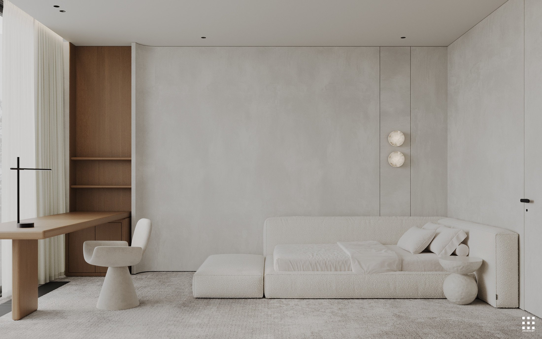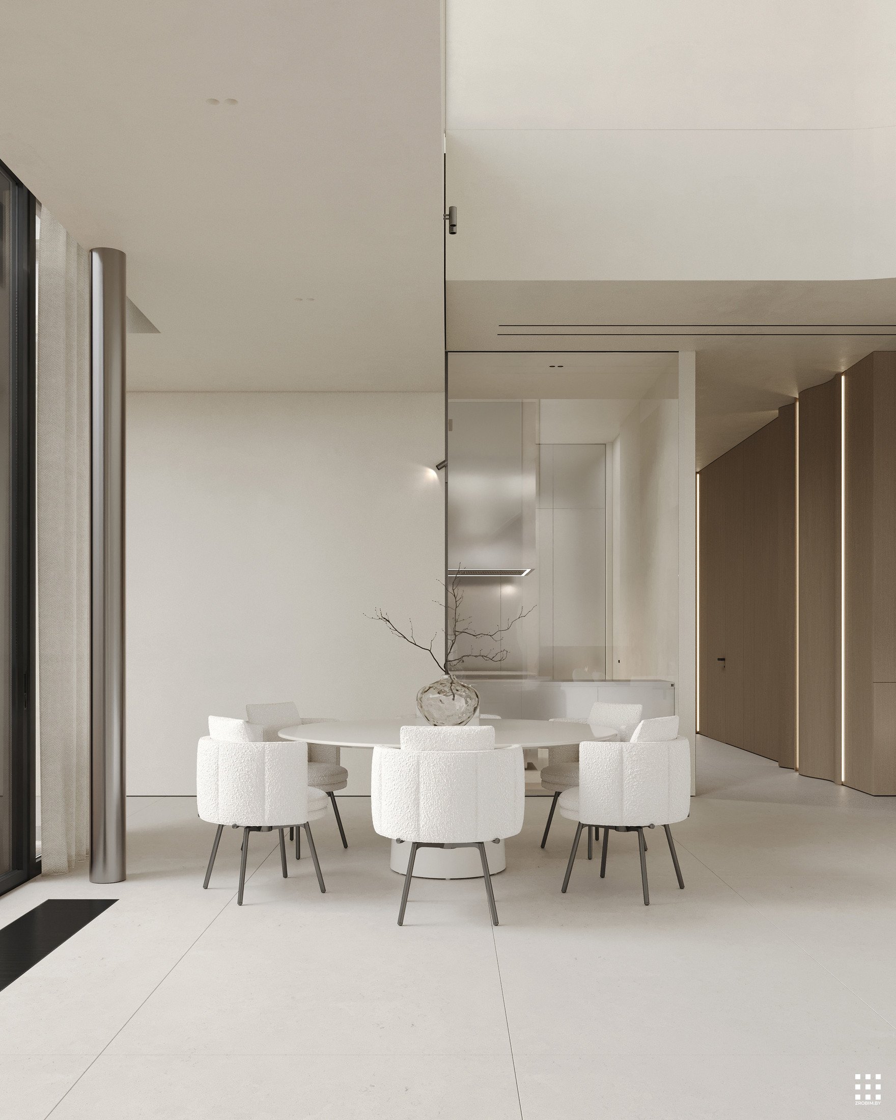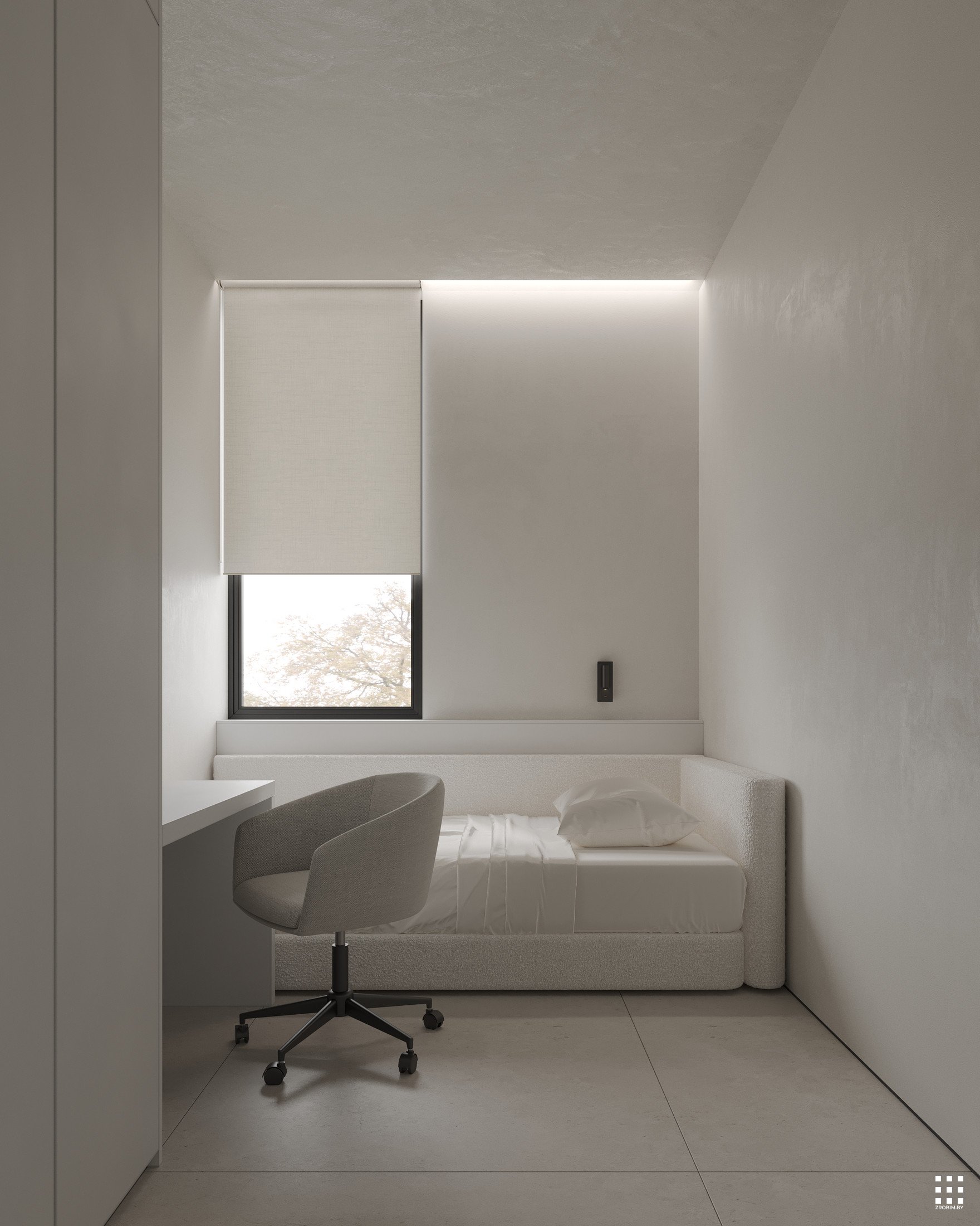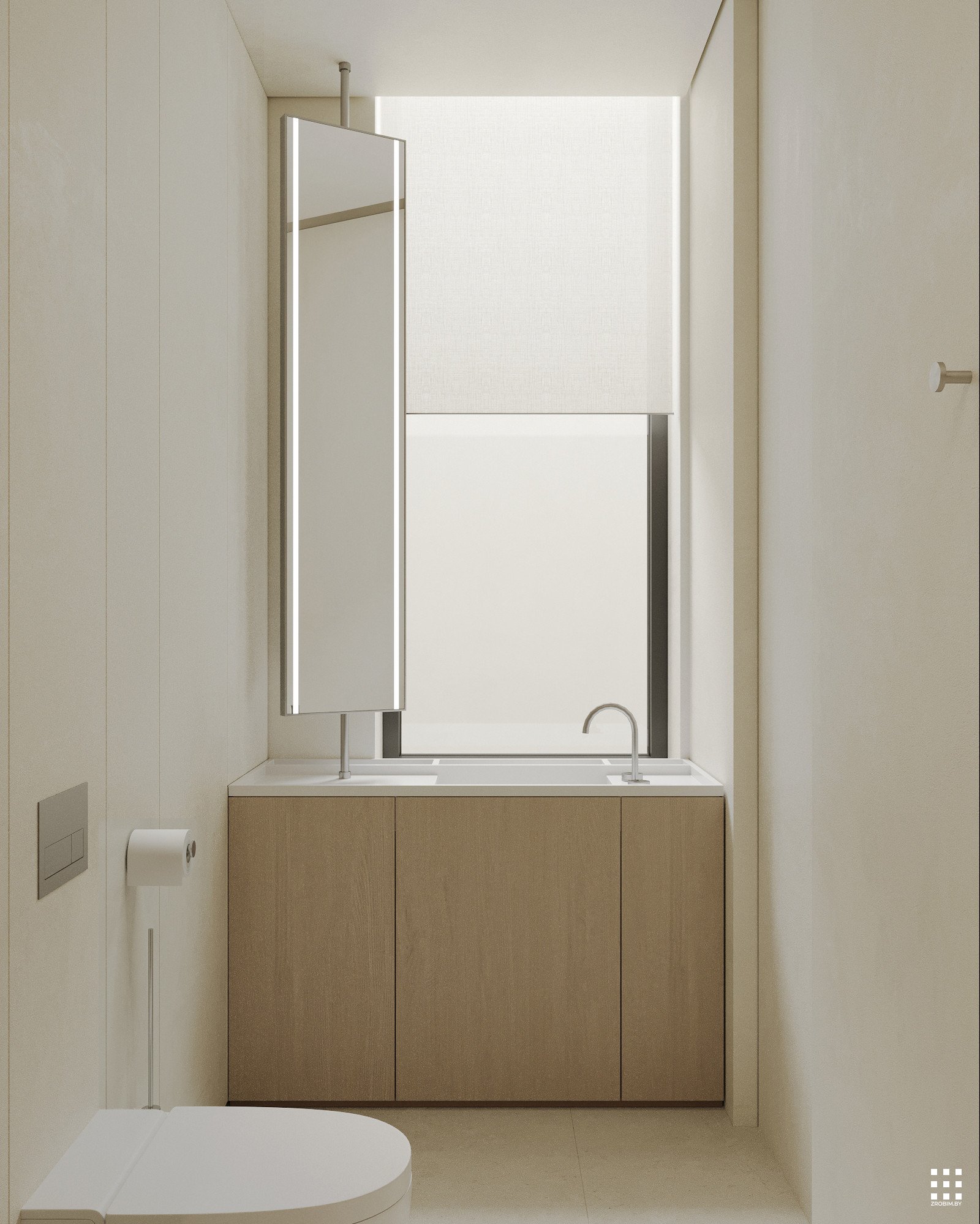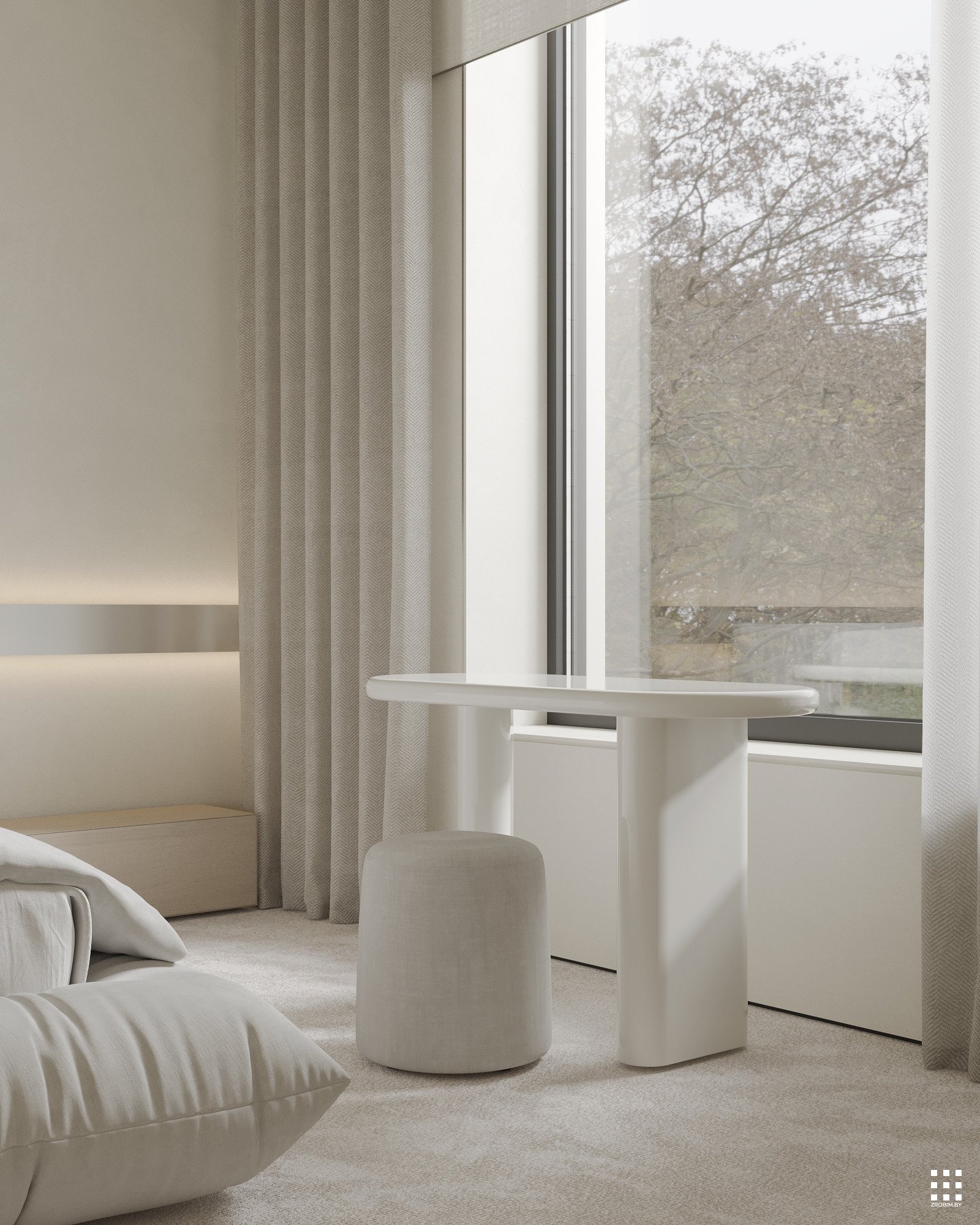 У гэтым праекце архітэктура мякка перацякае ў інтэр'ер, працягваючы сябе ў мінімалізме, цяпле і светла-бэжавой палітры. Для нас было важна стварыць спакойную, але выразную прастору, напоўненую натуральным святлом, з выверанай сістэмай штучнага асвятлення і кропкавымі акцэнтамі.