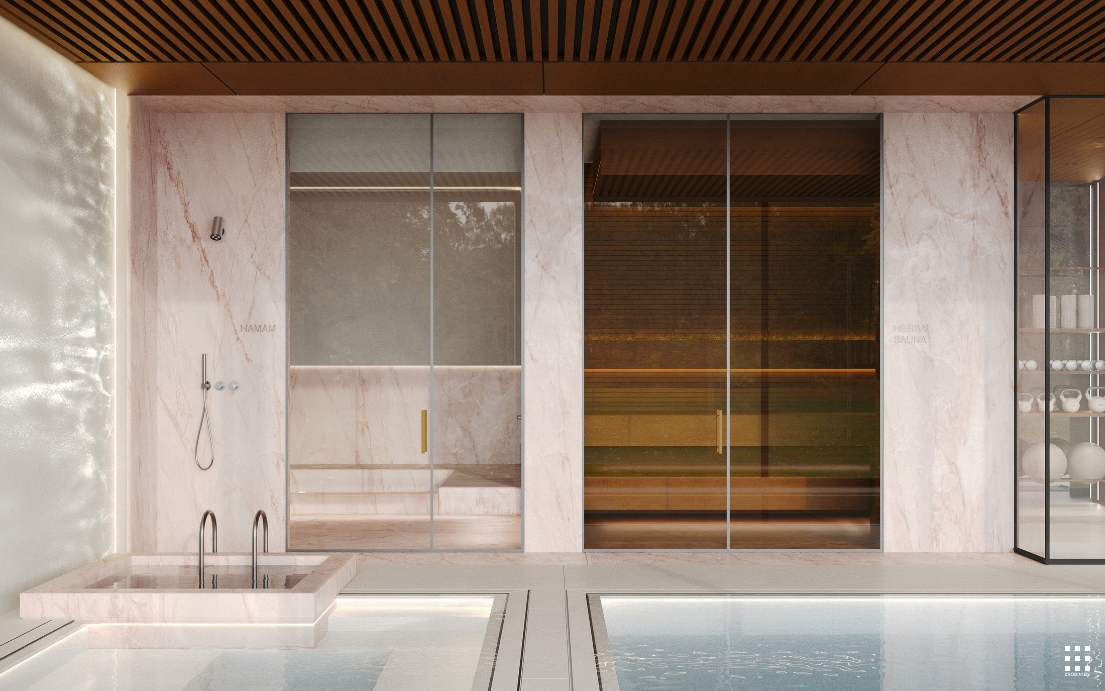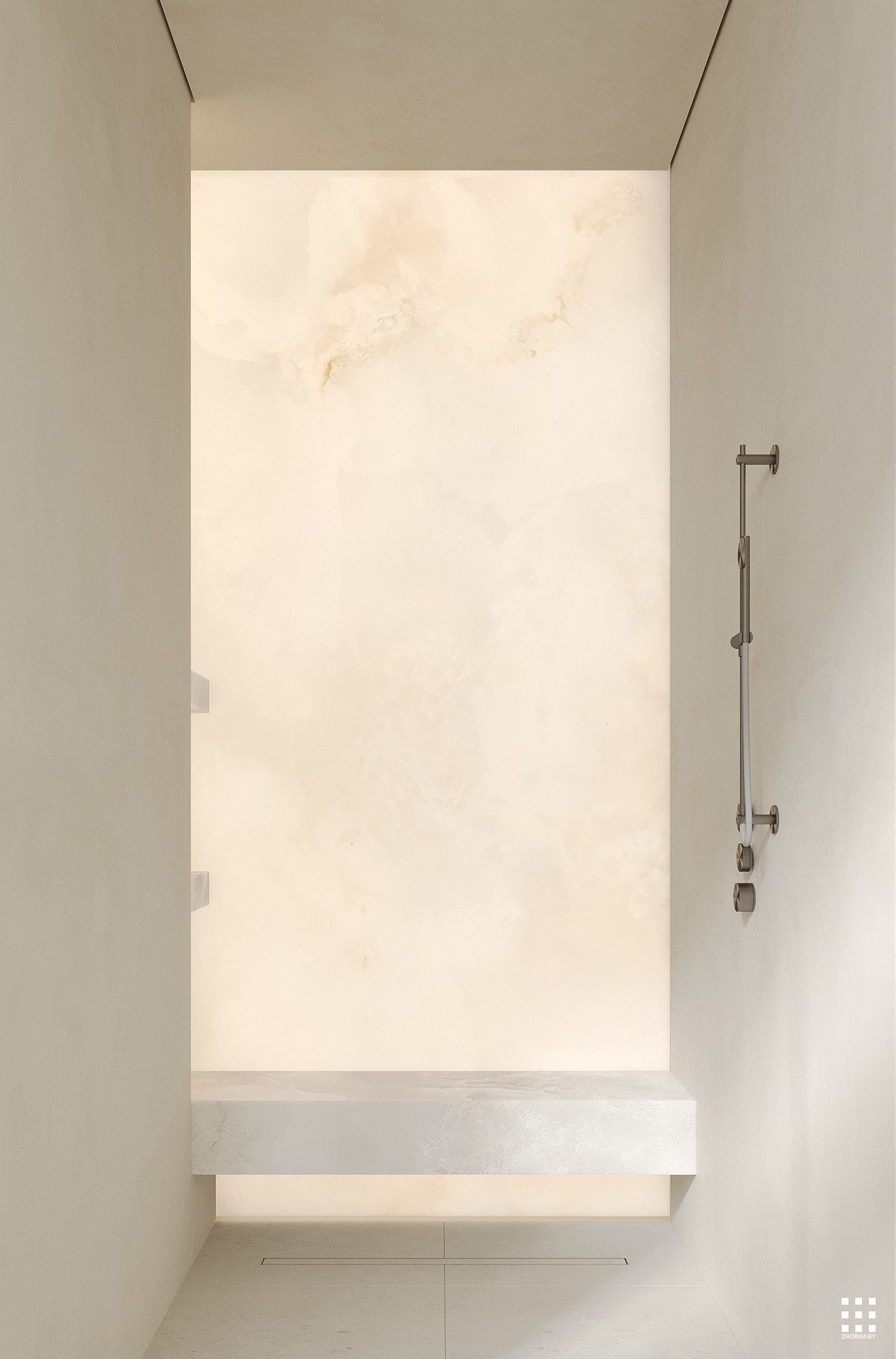 У якасці базавых матэрыялаў скарыстаны спакойныя, тактыльныя паверхні: керамаграніт і дэкаратыўная тынкоўка, якія ўраўнаважваюць бляск і дадаюць глыбіню прасторы.