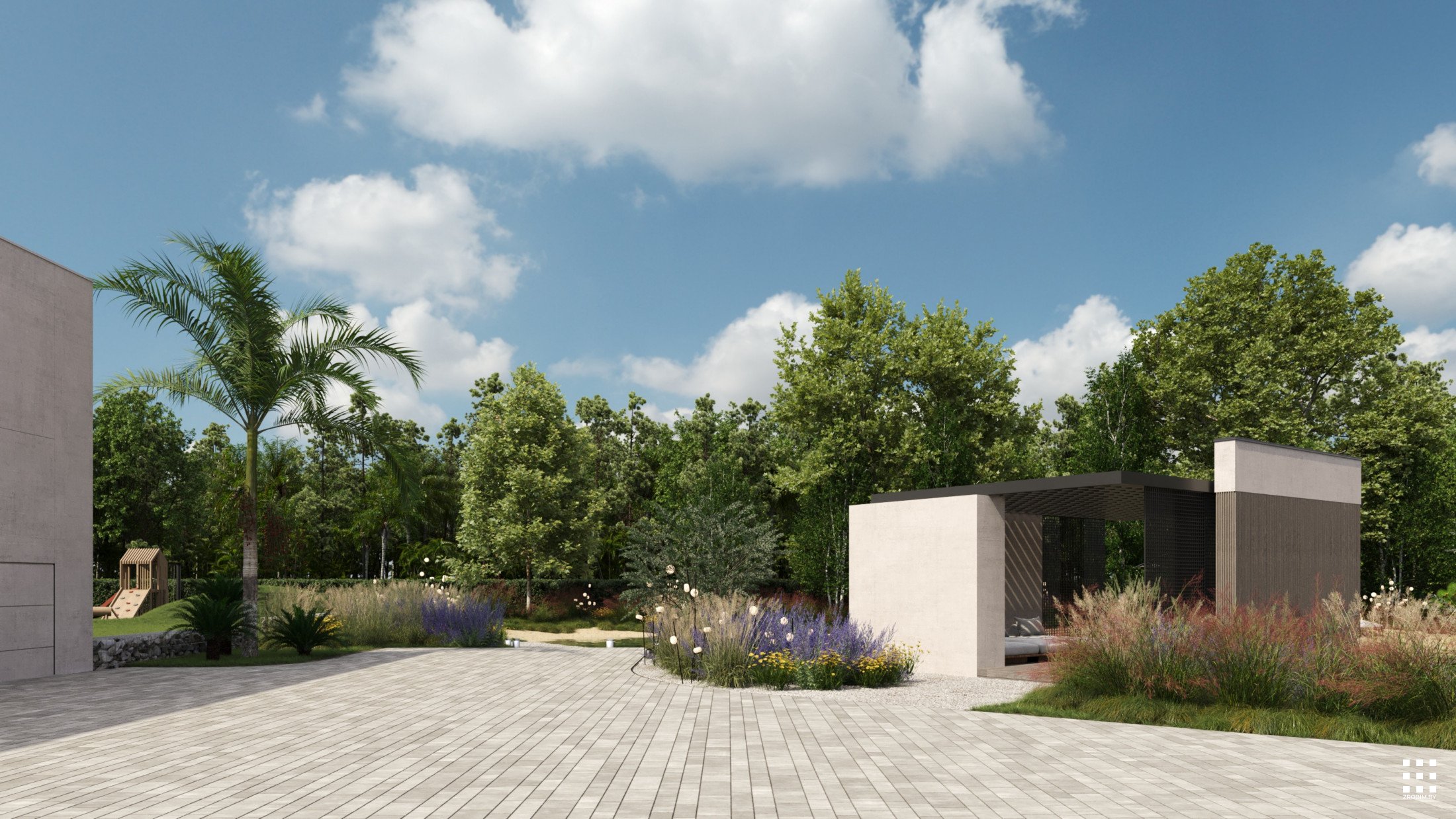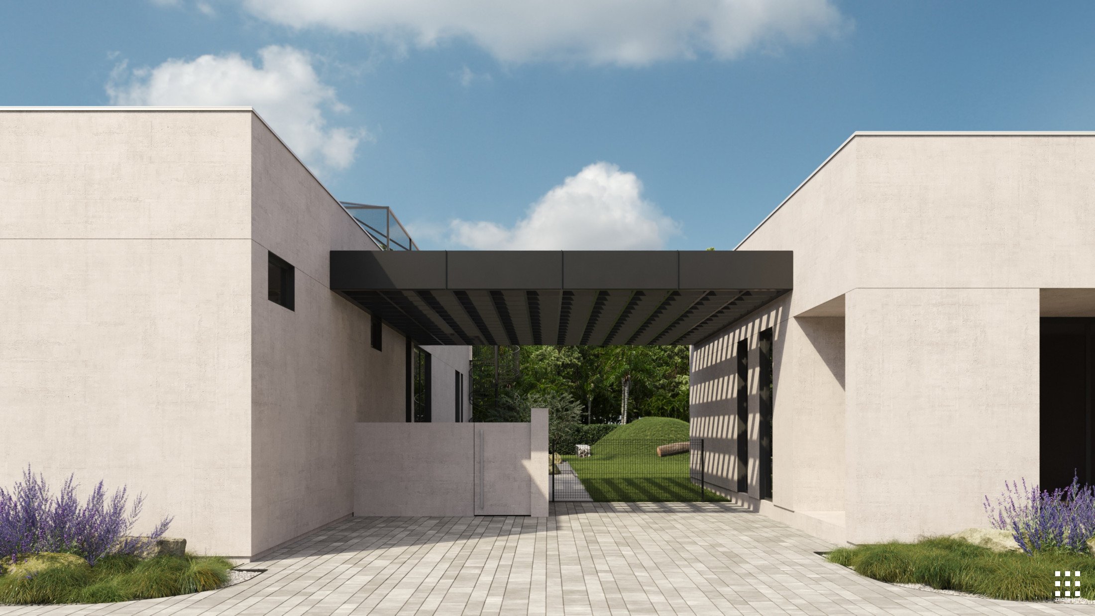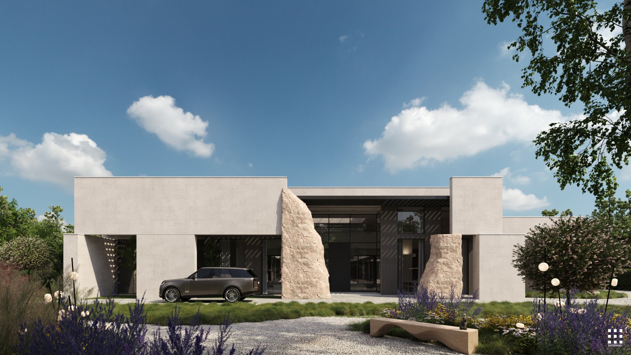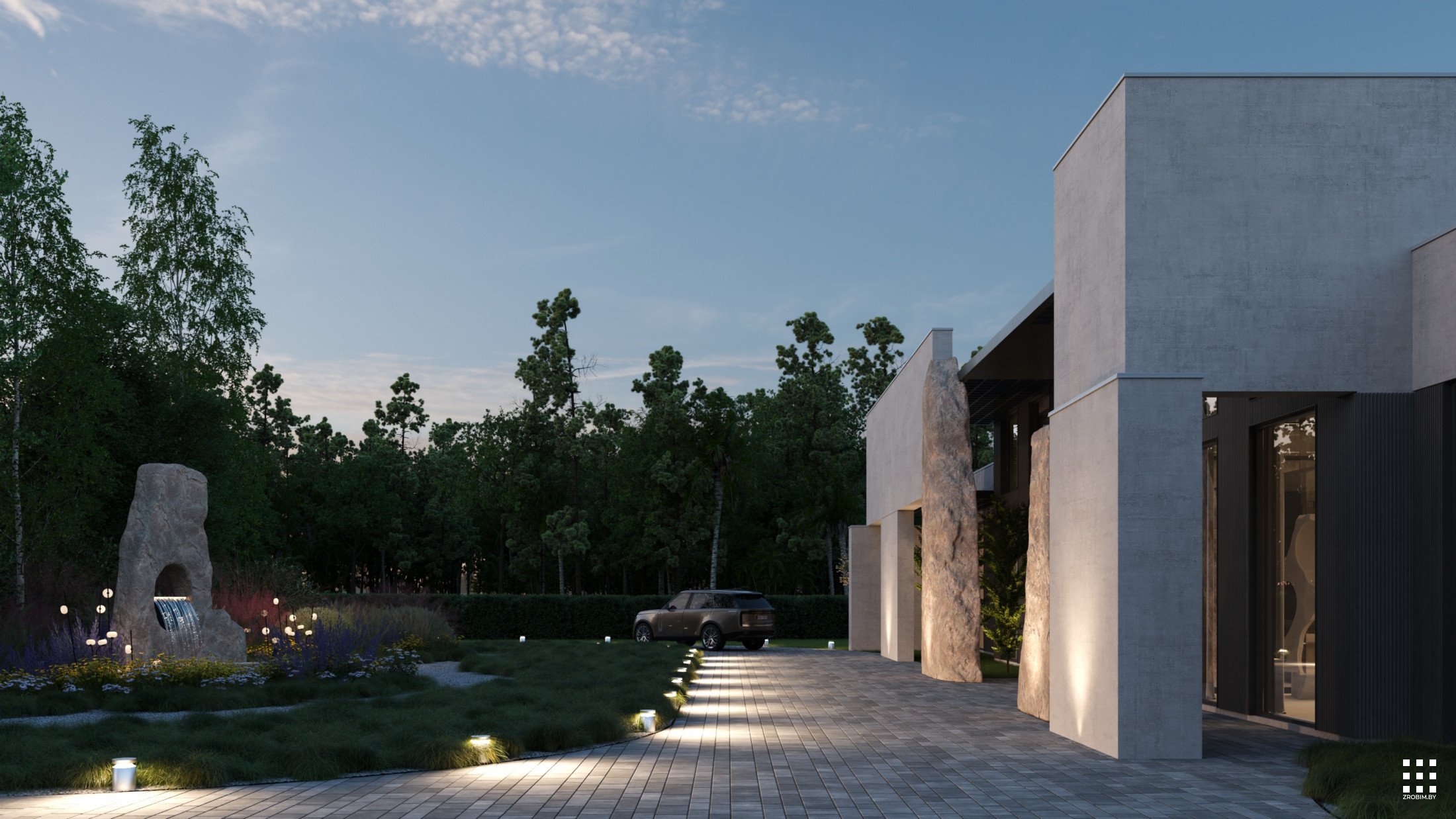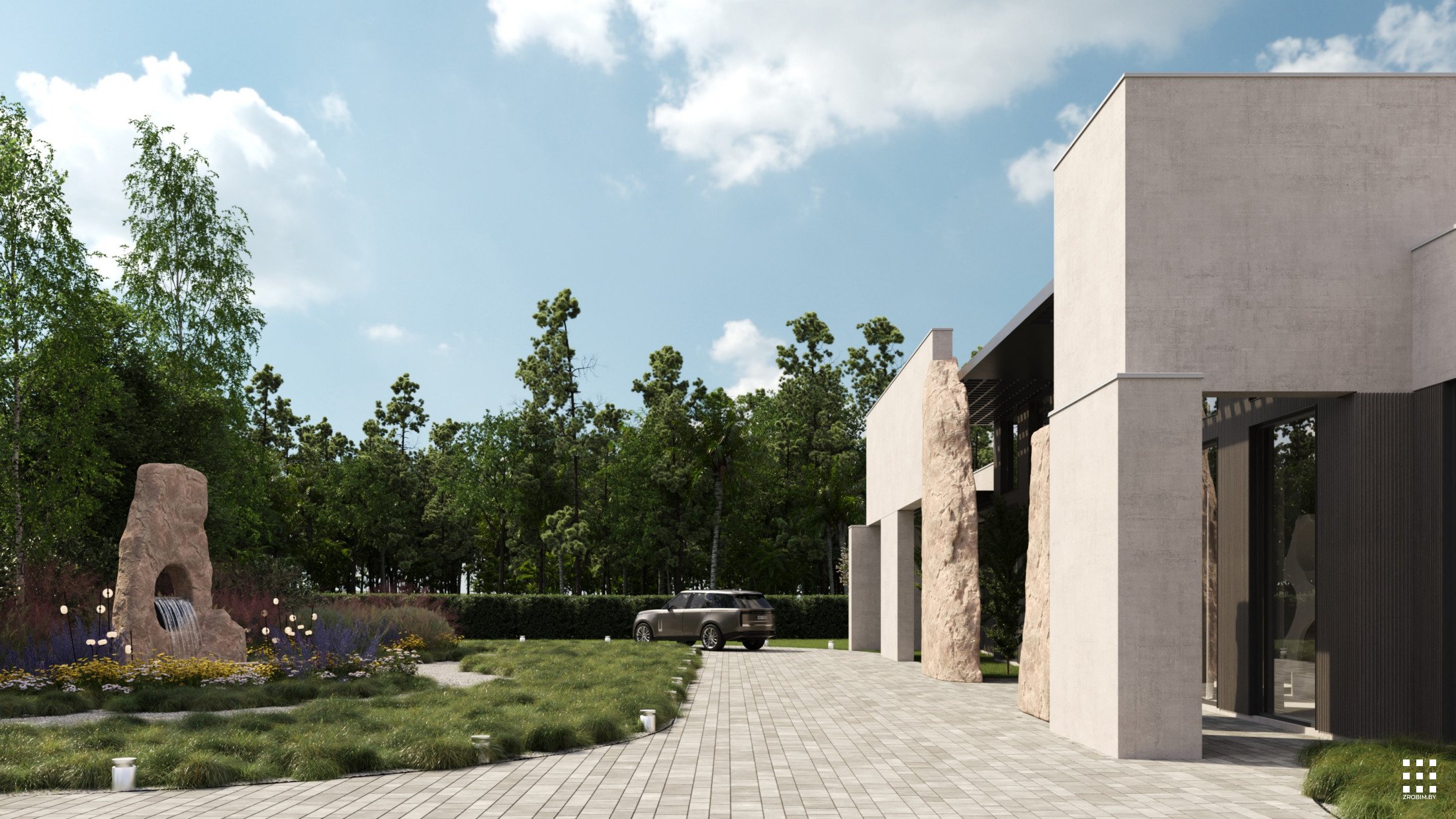The new concept introduces a distinct entrance composition that organizes the faсade and gives the house character. A vertical screen in front of the main volume provides shading and creates a strong architectural accent. Stone sculptures near the entrance form a sculptural landscape element that turns the entry into an art object. The adjacent stone fountain continues the material language and links the exterior spaces into a unified composition.