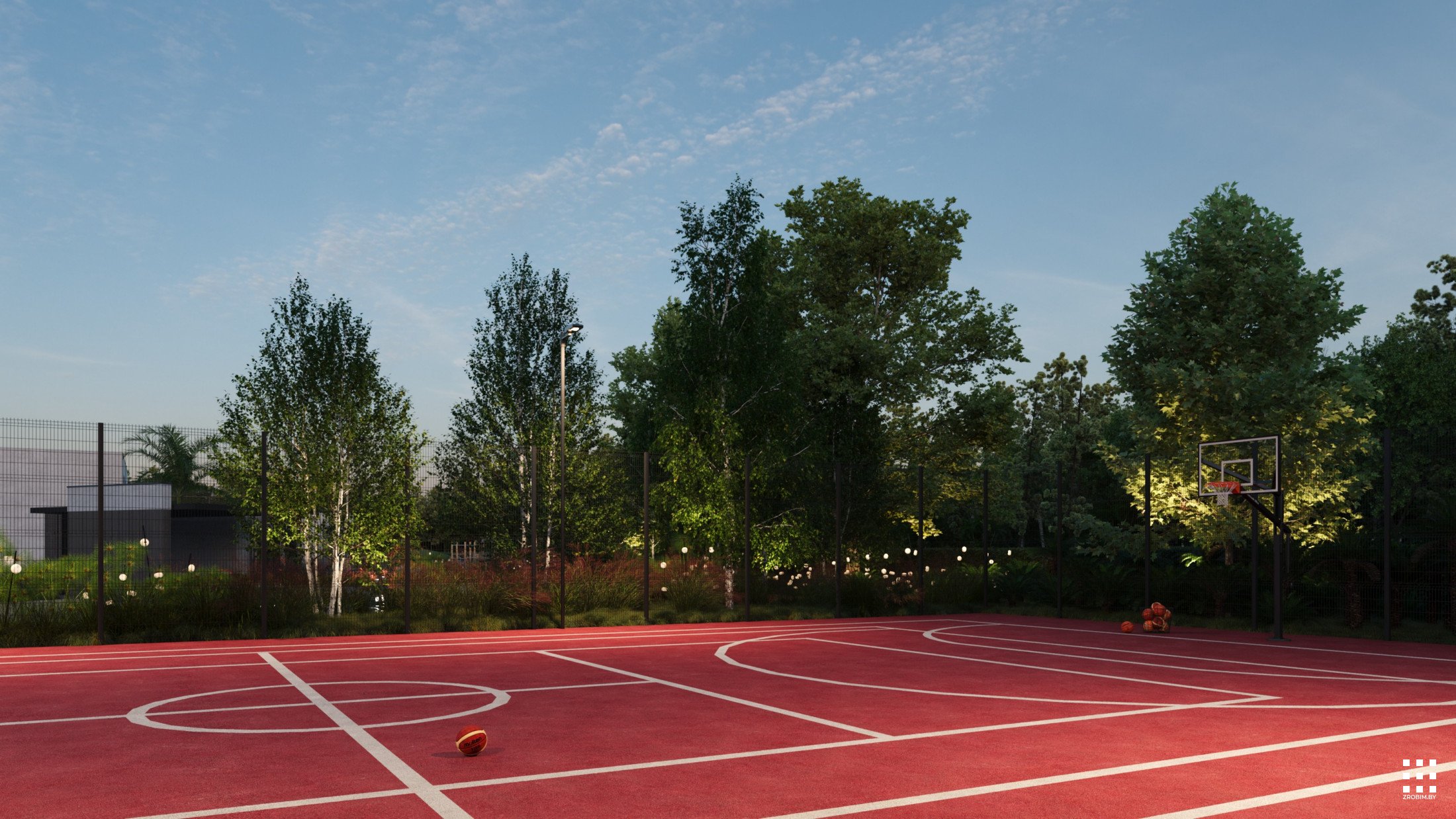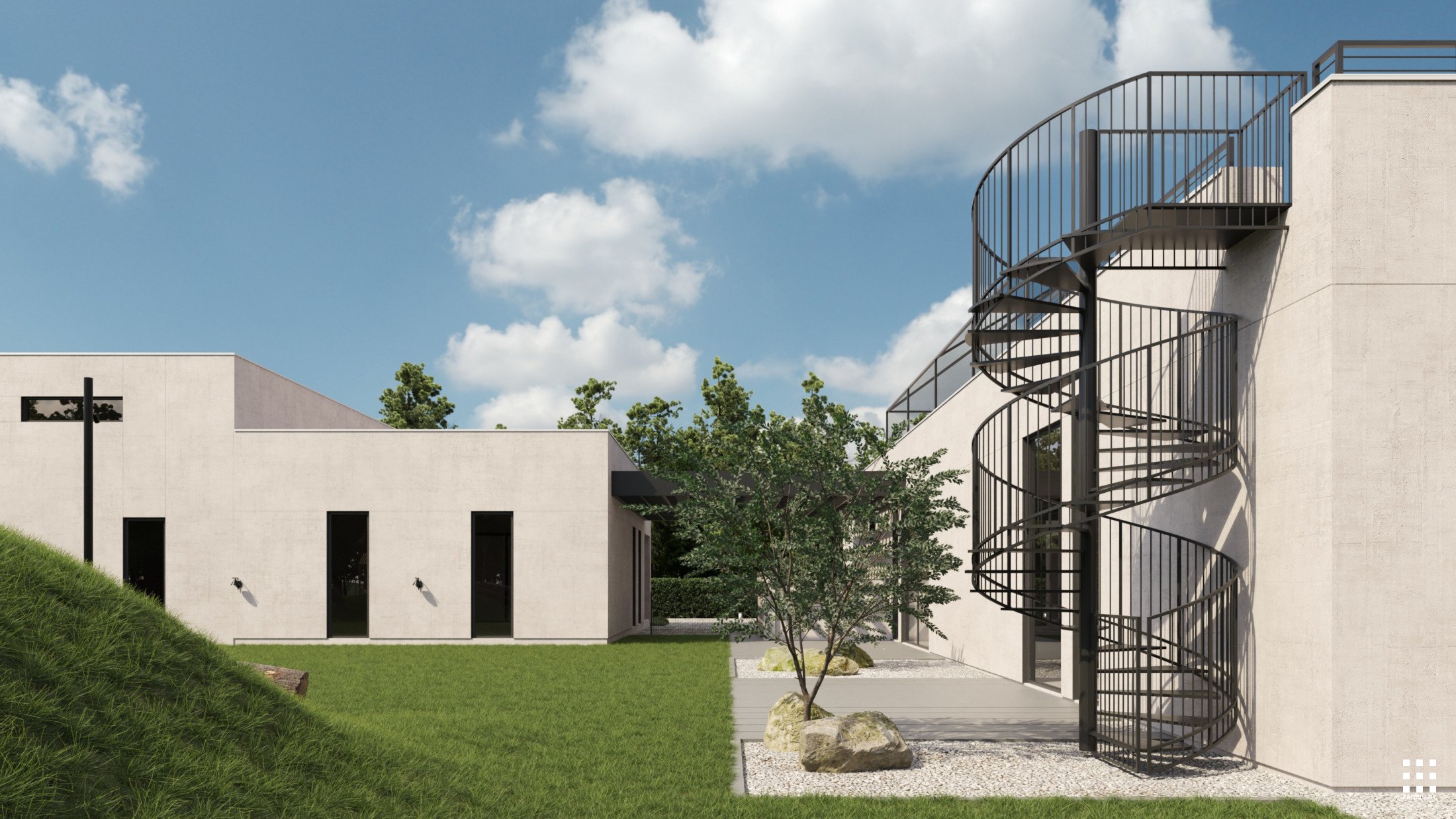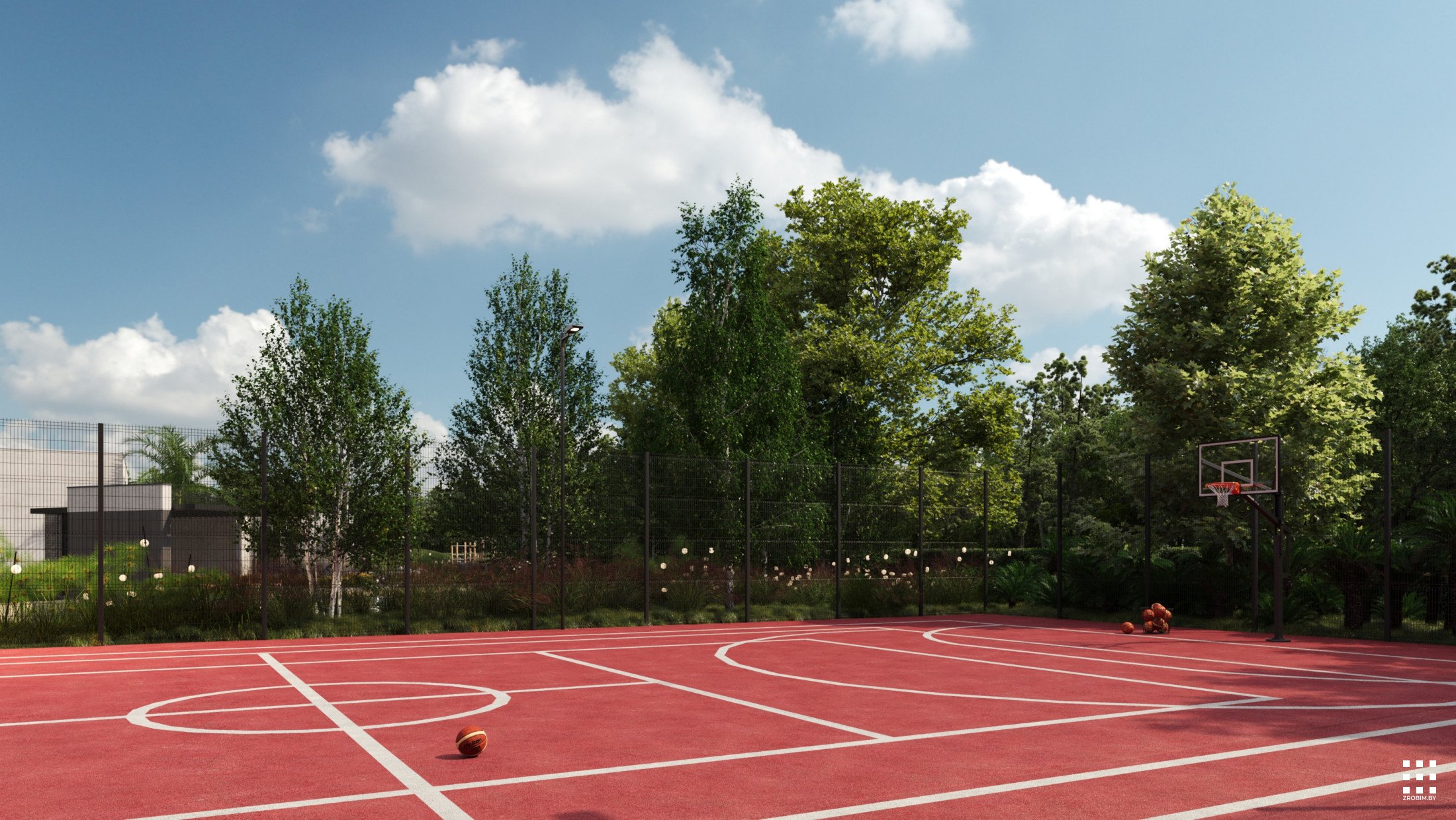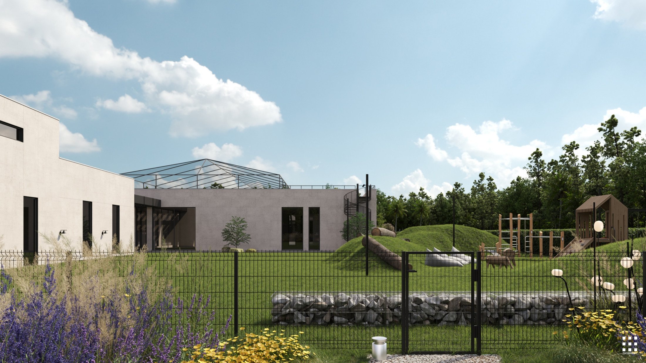 The site is structured into several private and public zones. The entrance area opens to landscaped courtyards with terraces extending from the bedrooms, featuring fire pits and gabion partitions for privacy. A separate recreation zone includes workout and play areas, a pond with a gazebo, and a small natural beach. A multifunctional sports court completes the composition, surrounded by gentle terrain and preserved vegetation.