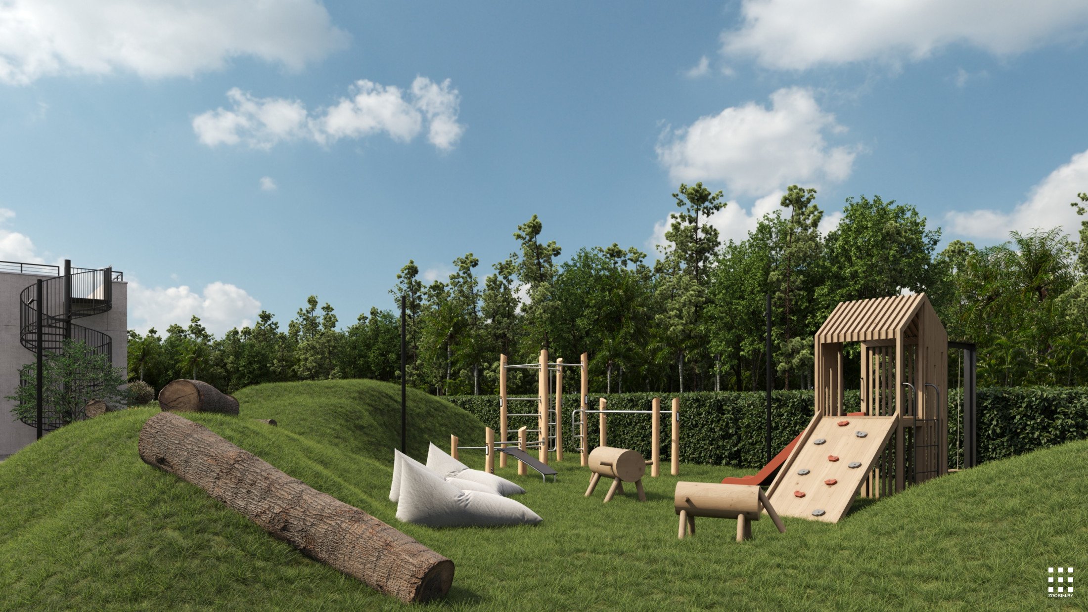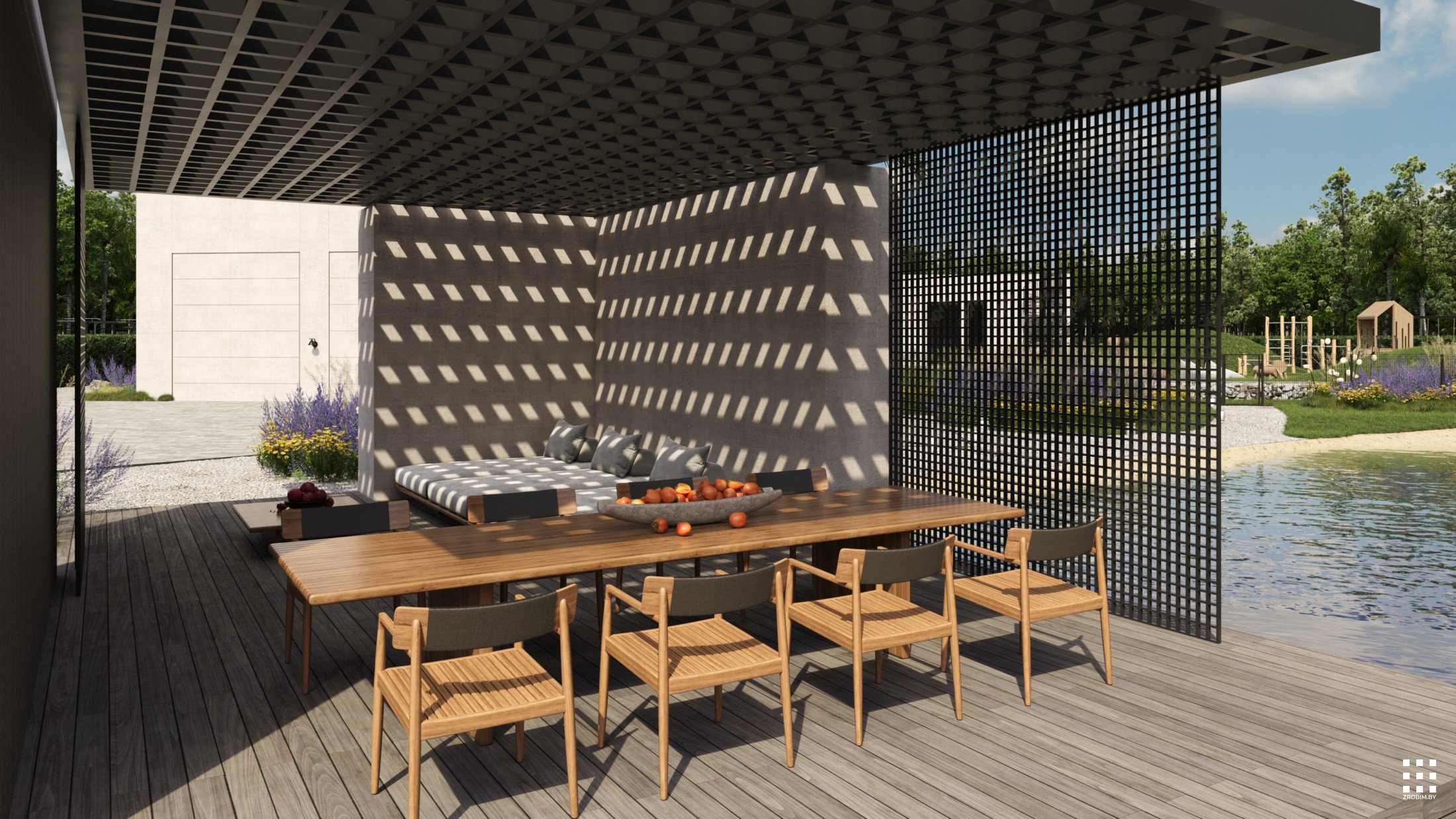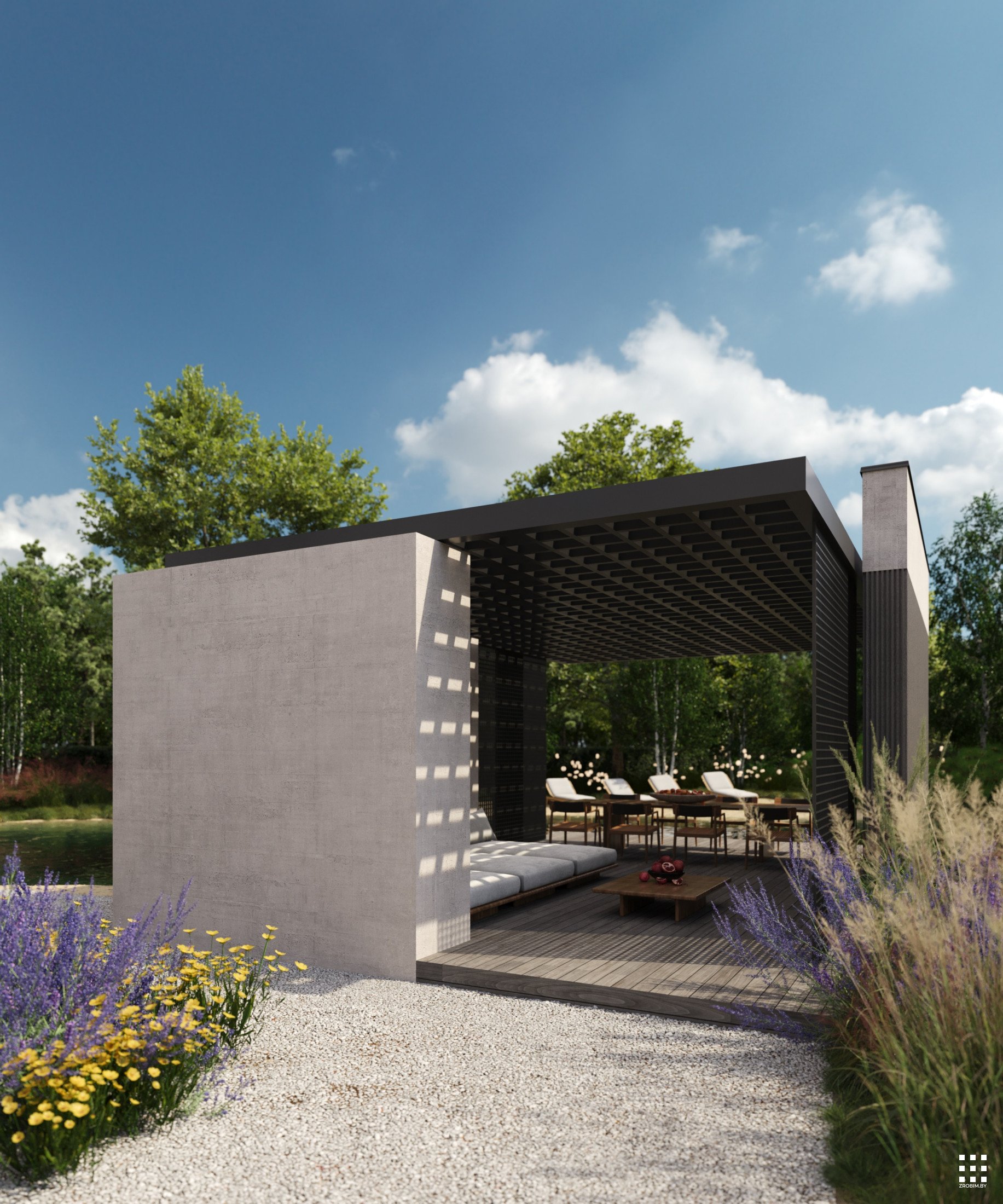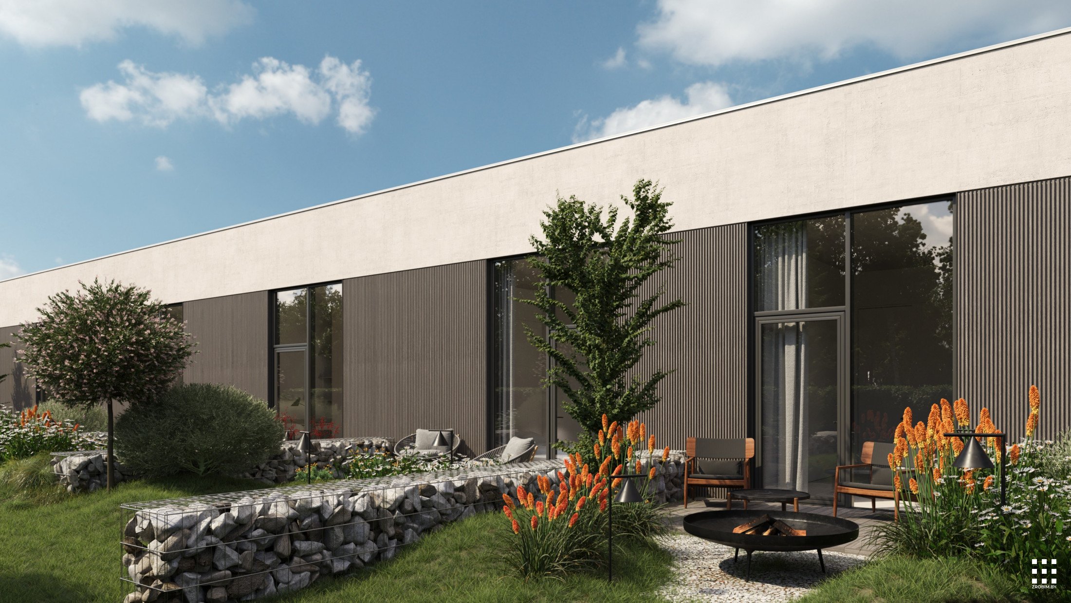The site is structured into several private and public zones. The entrance area opens to landscaped courtyards with terraces extending from the bedrooms, featuring fire pits and gabion partitions for privacy. A separate recreation zone includes workout and play areas, a pond with a gazebo, and a small natural beach. A multifunctional sports court completes the composition, surrounded by gentle terrain and preserved vegetation.