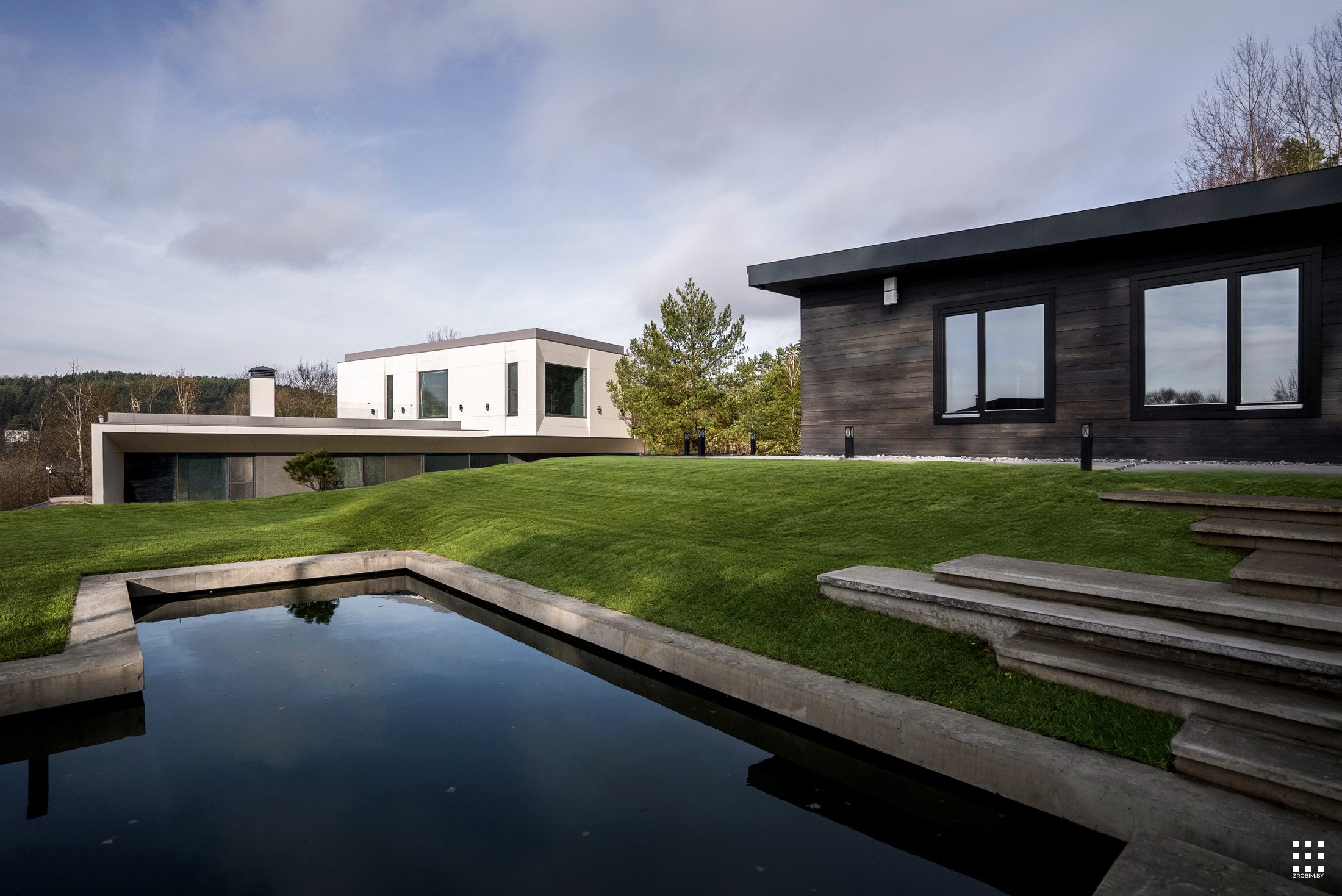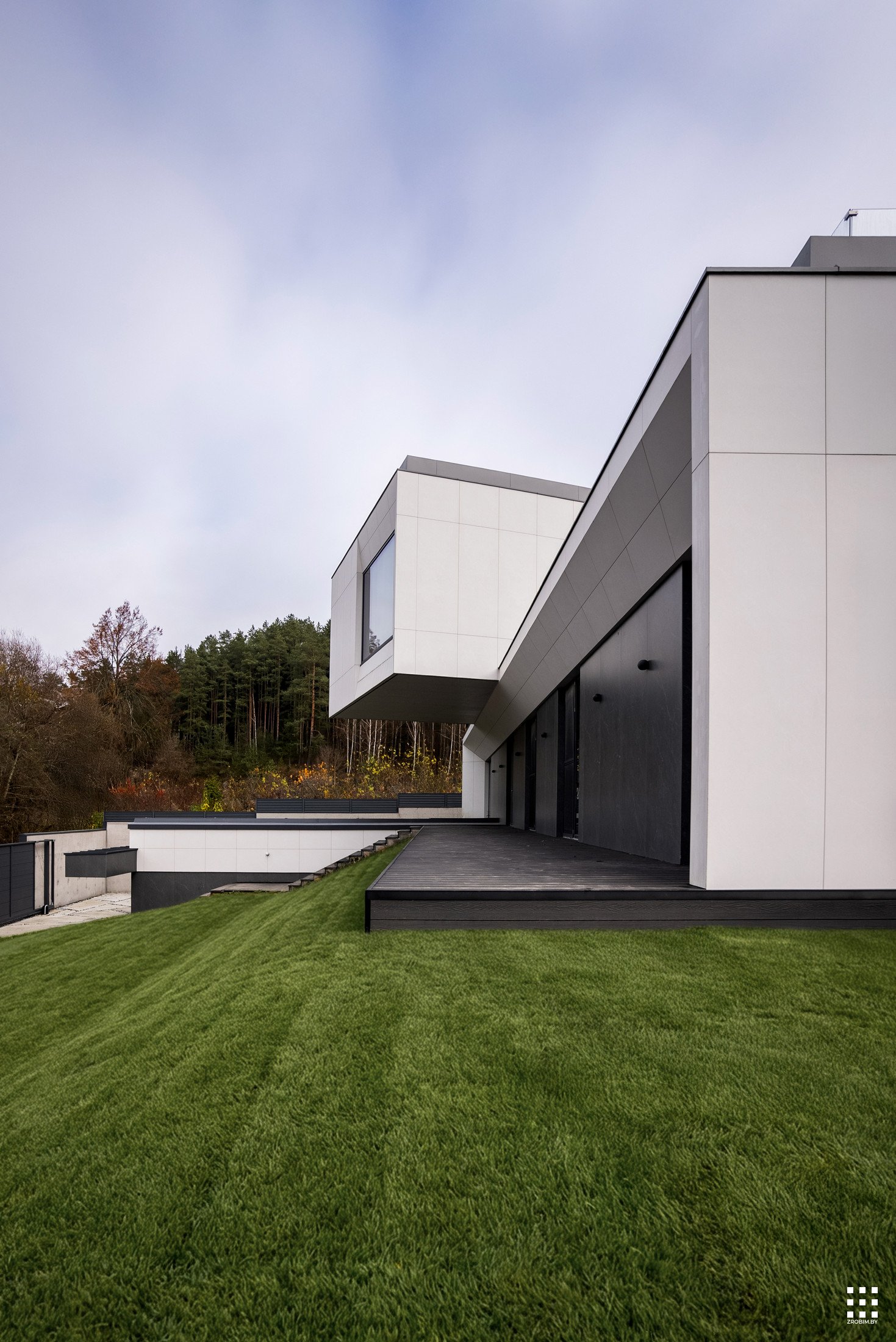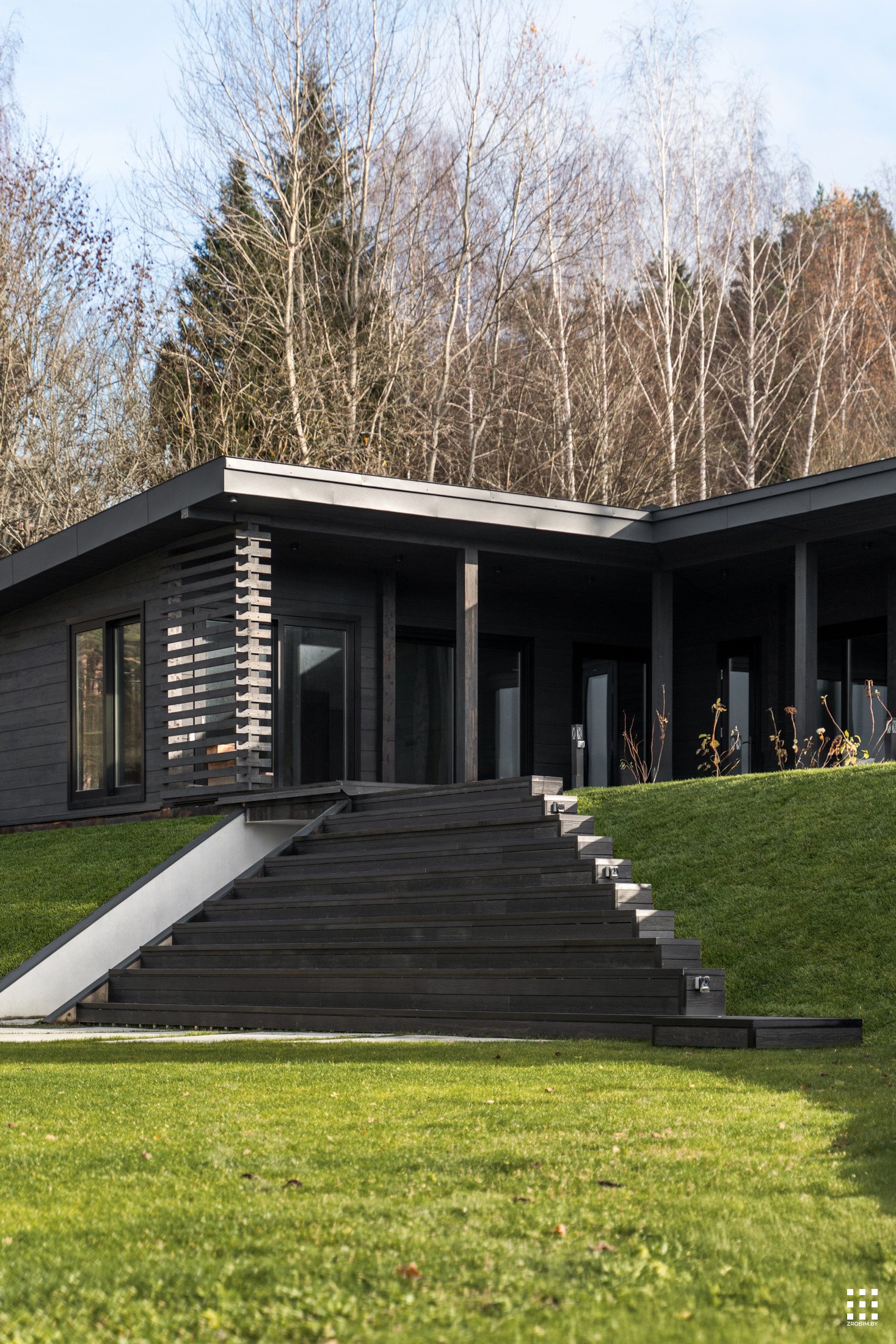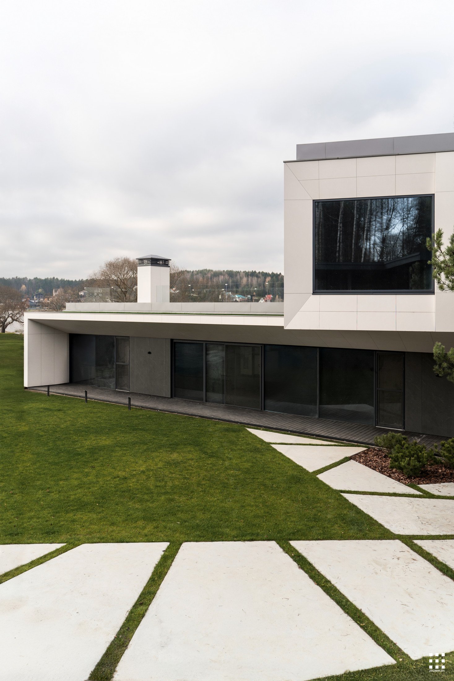 The first floor is located across the plot to create privacy and give a panorama from the house to the backyard. The angle of rotation of the second floor was significantly affected by the limitations of the view corridor due to vegetation and neighboring buildings. That's why we turned the floor so that the master bedroom had a beautiful view of the reservoir.