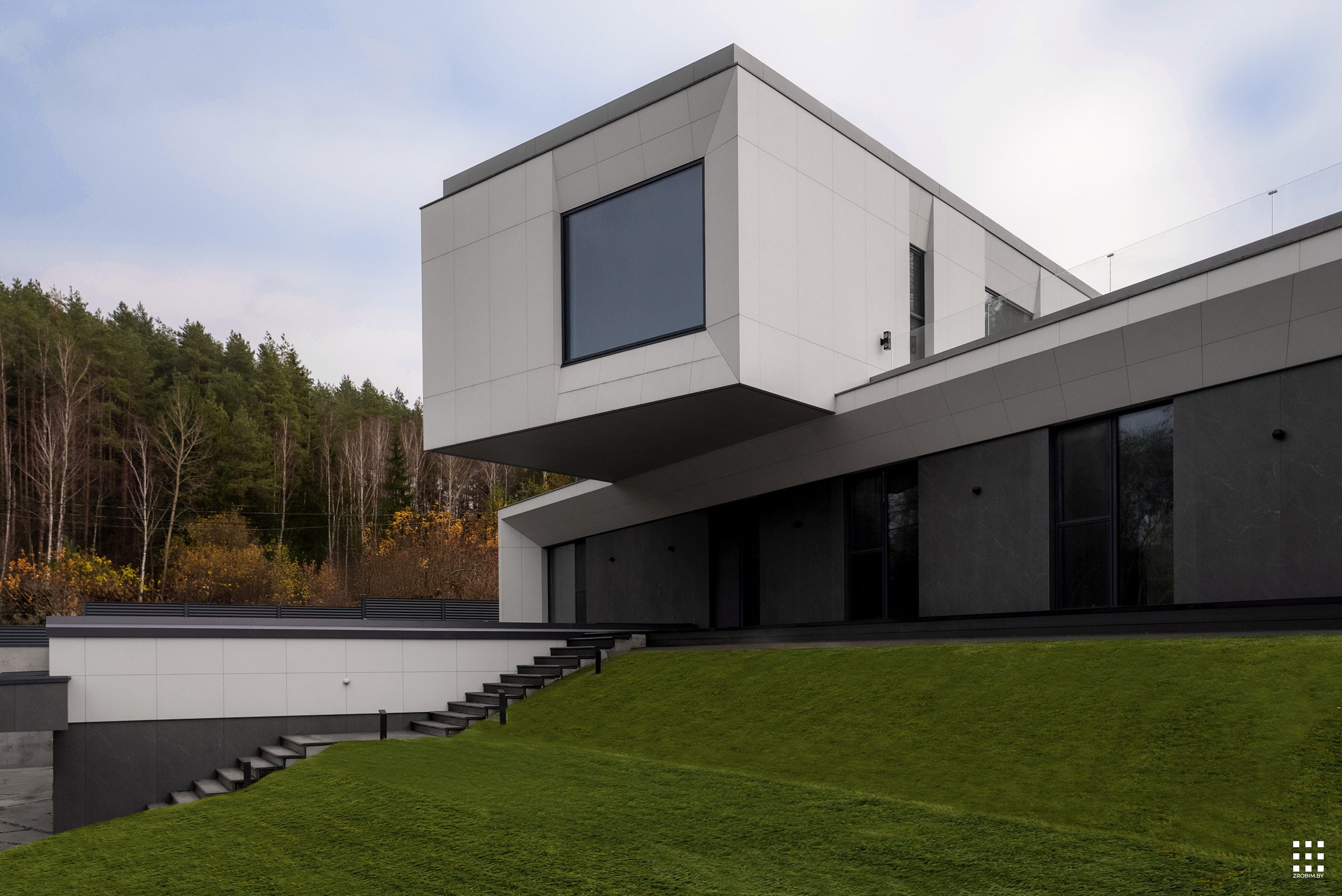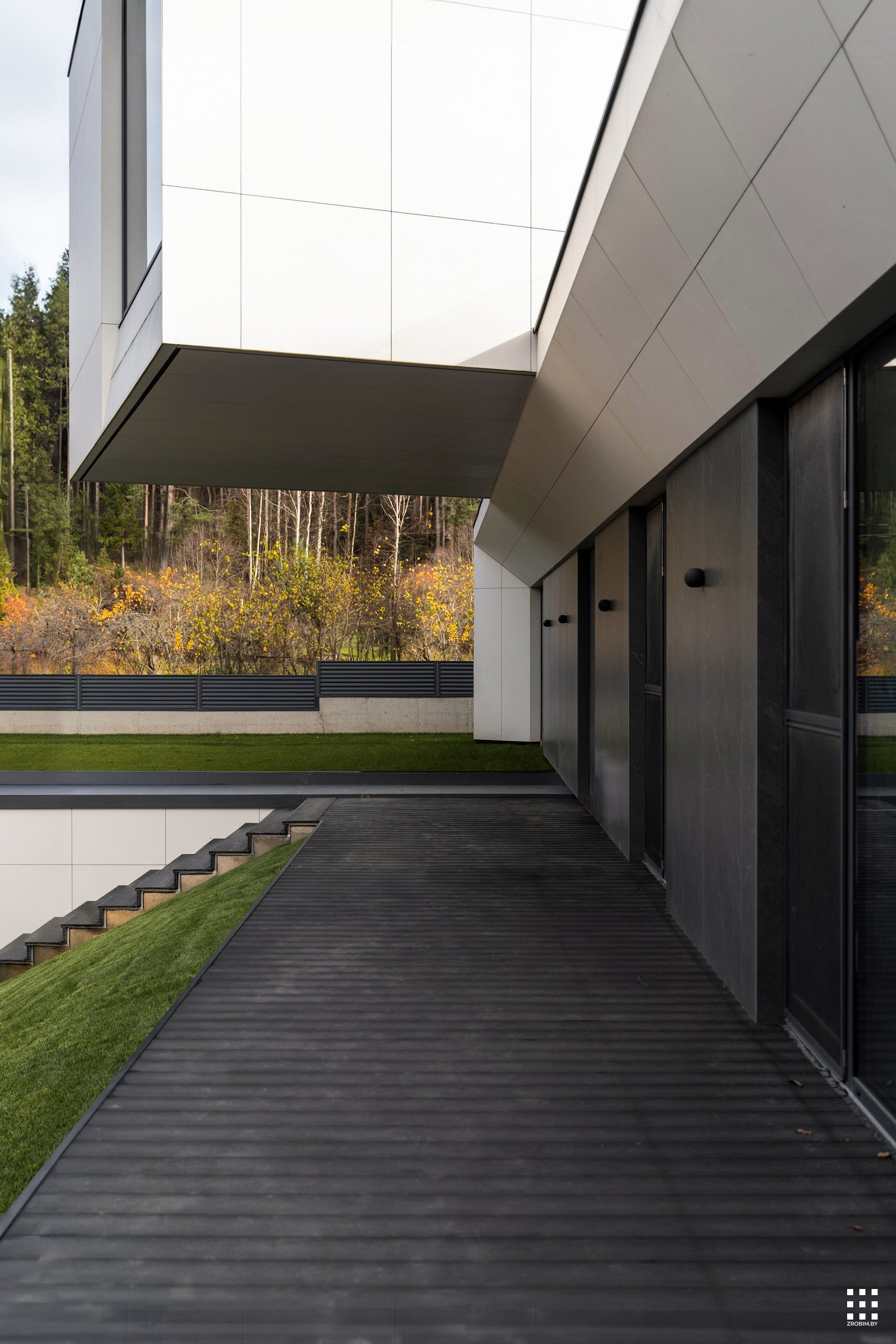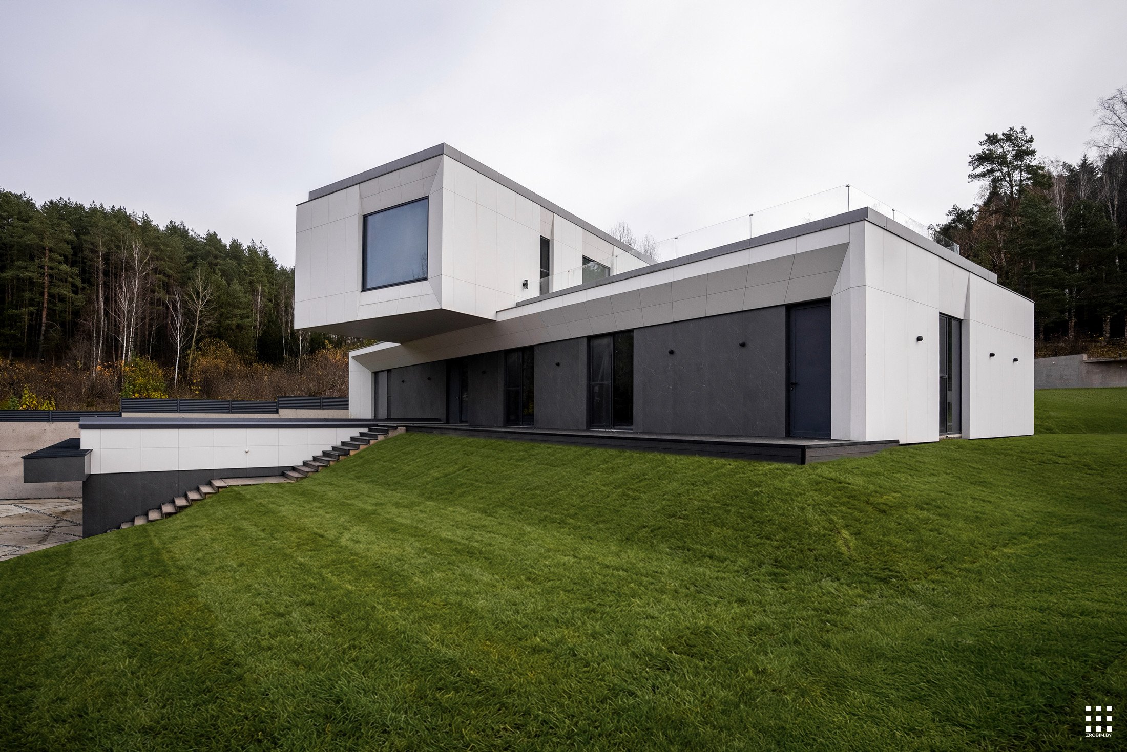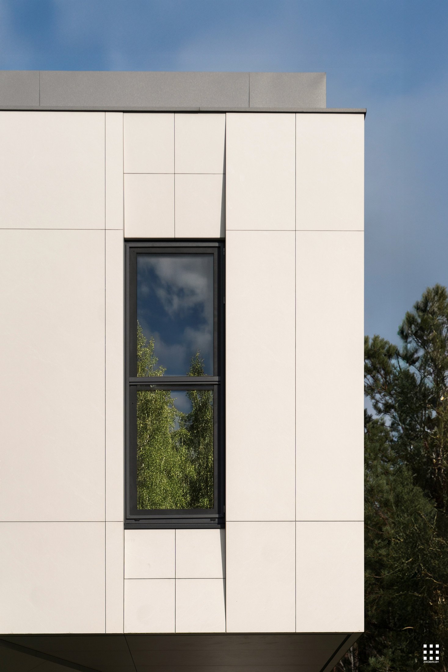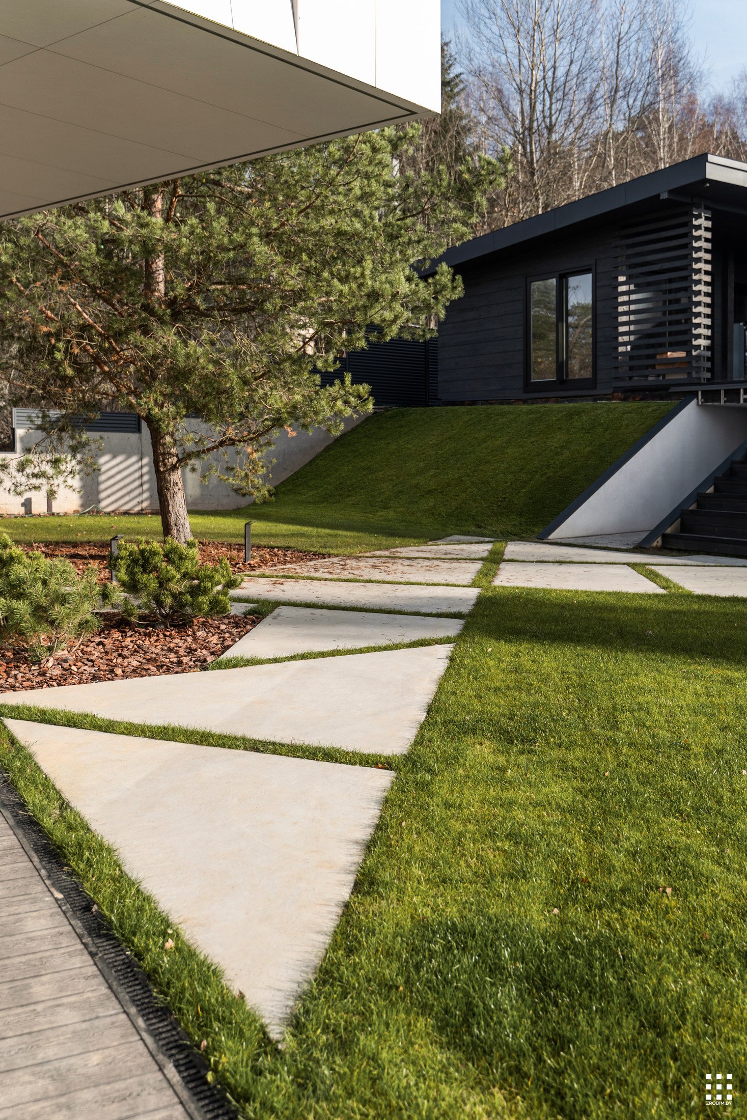 The first floor is located across the plot to create privacy and give a panorama from the house to the backyard. The angle of rotation of the second floor was significantly affected by the limitations of the view corridor due to vegetation and neighboring buildings. That's why we turned the floor so that the master bedroom had a beautiful view of the reservoir.