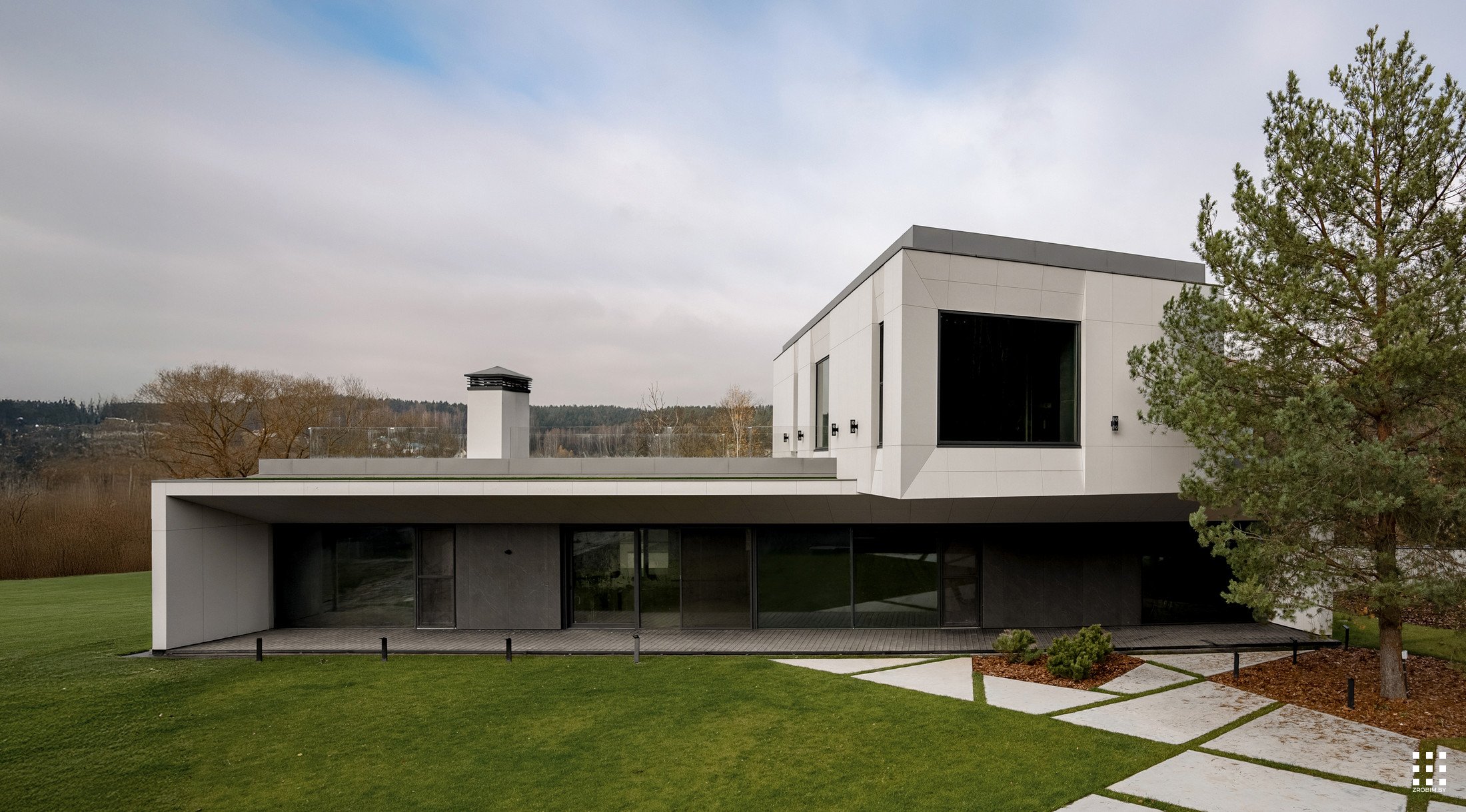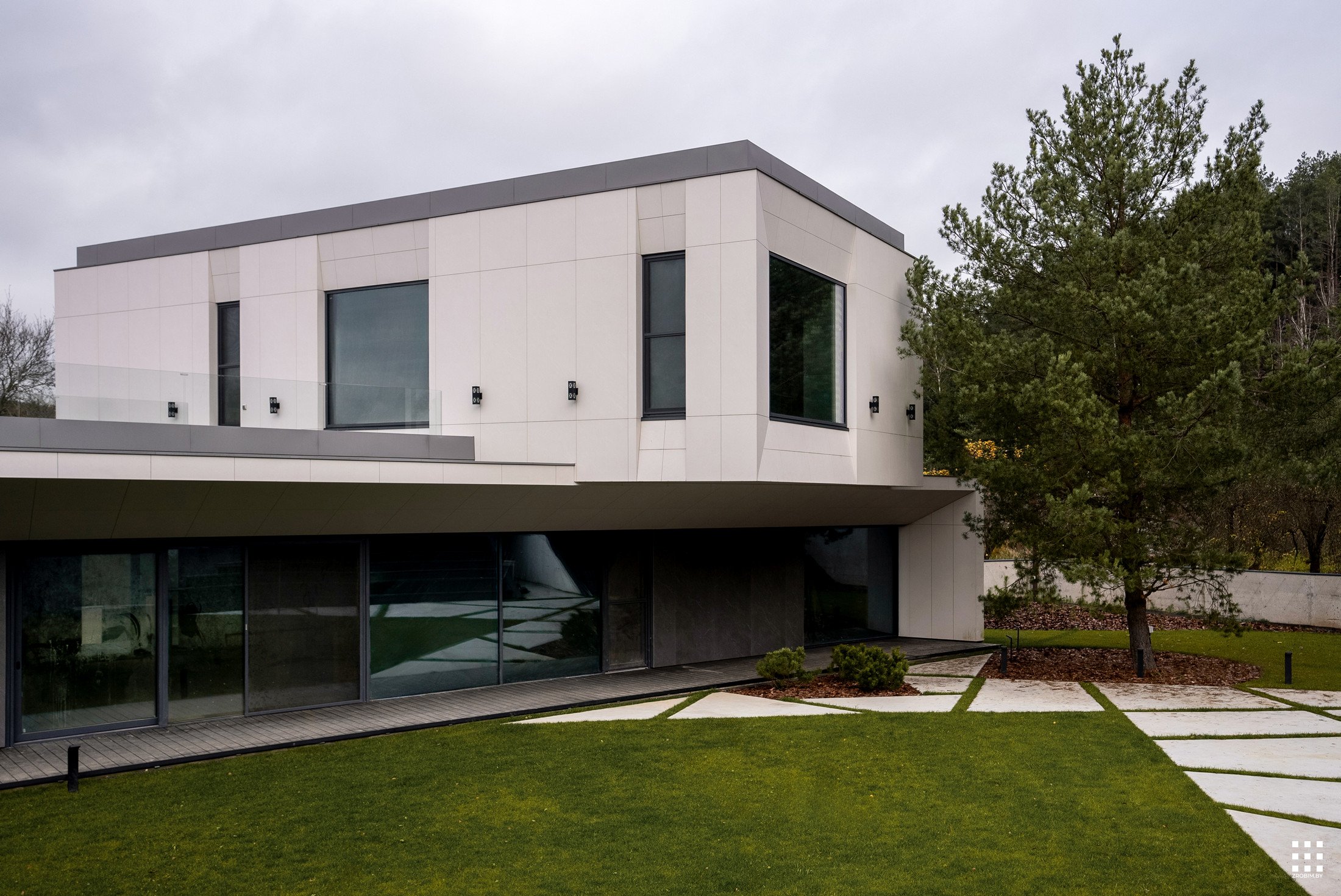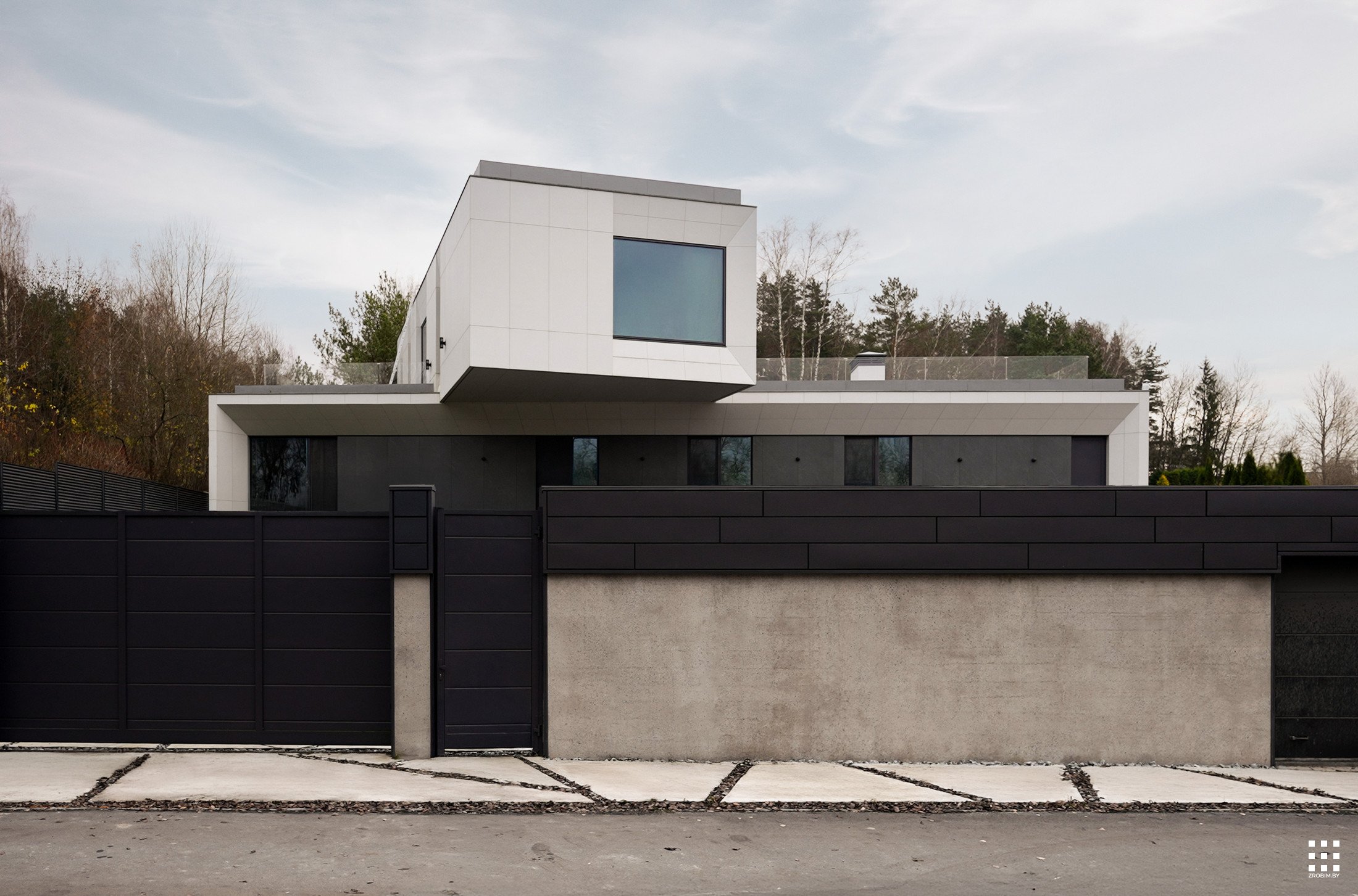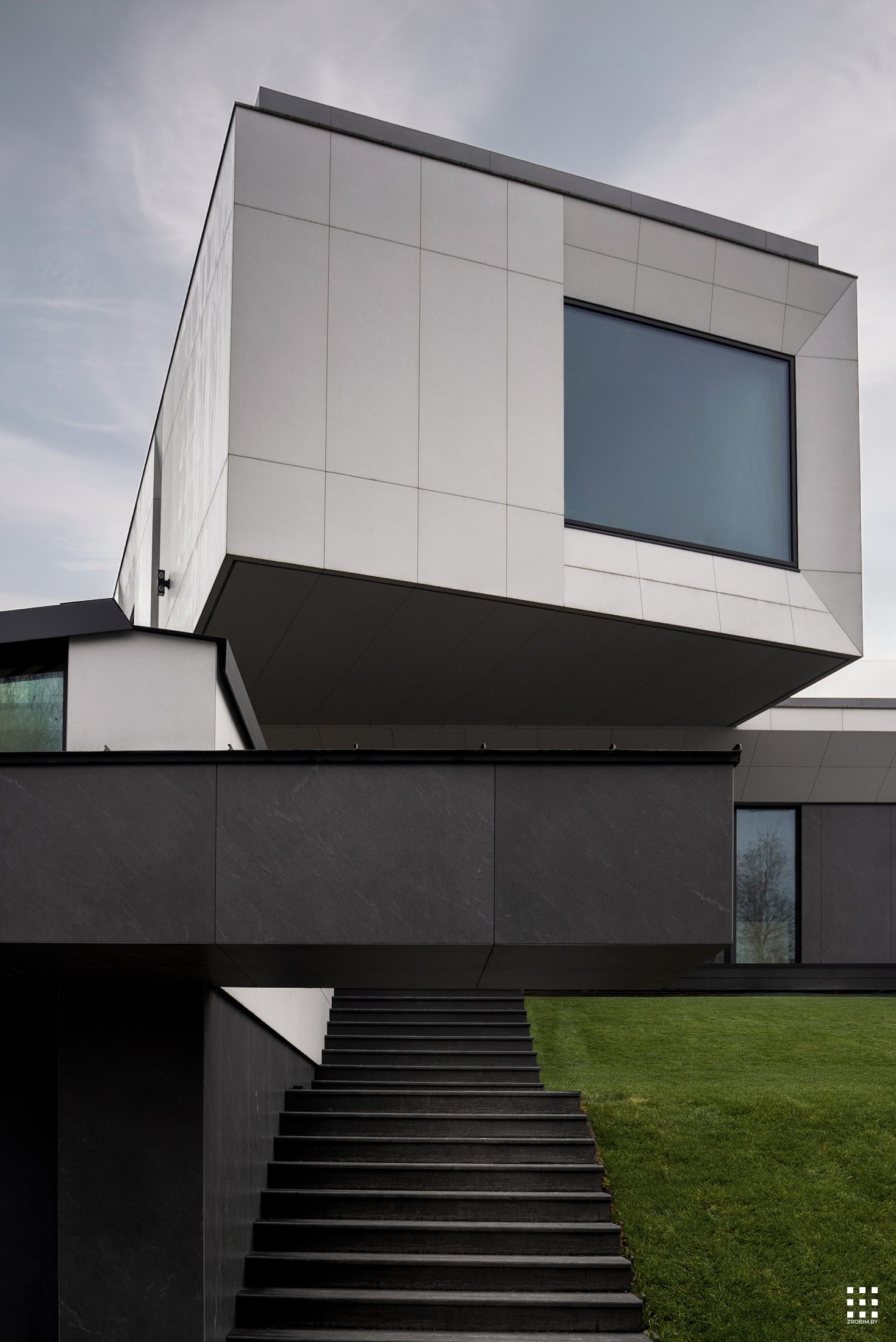 The first floor is located across the plot to create privacy and give a panorama from the house to the backyard. The angle of rotation of the second floor was significantly affected by the limitations of the view corridor due to vegetation and neighboring buildings. That's why we turned the floor so that the master bedroom had a beautiful view of the reservoir.