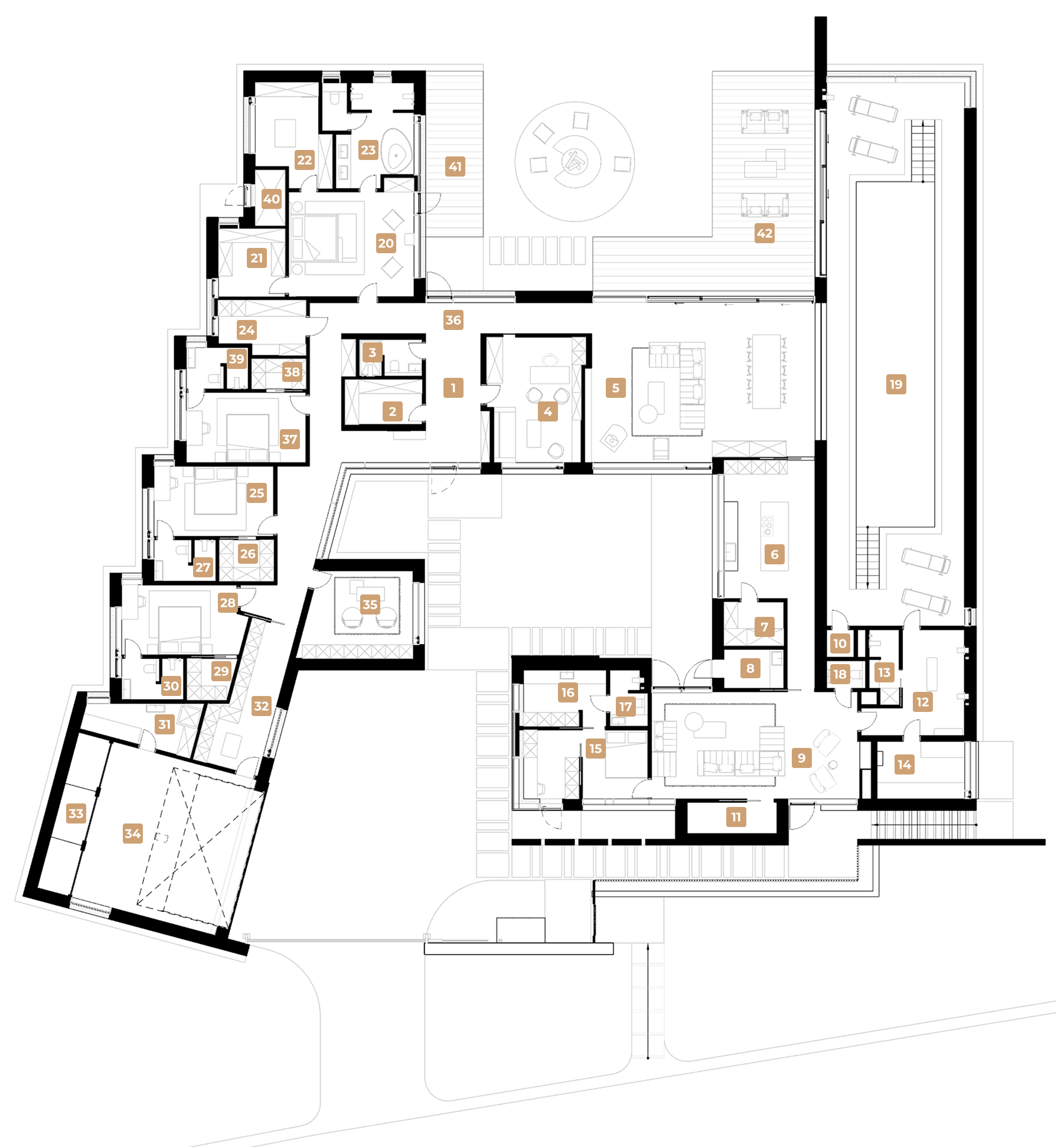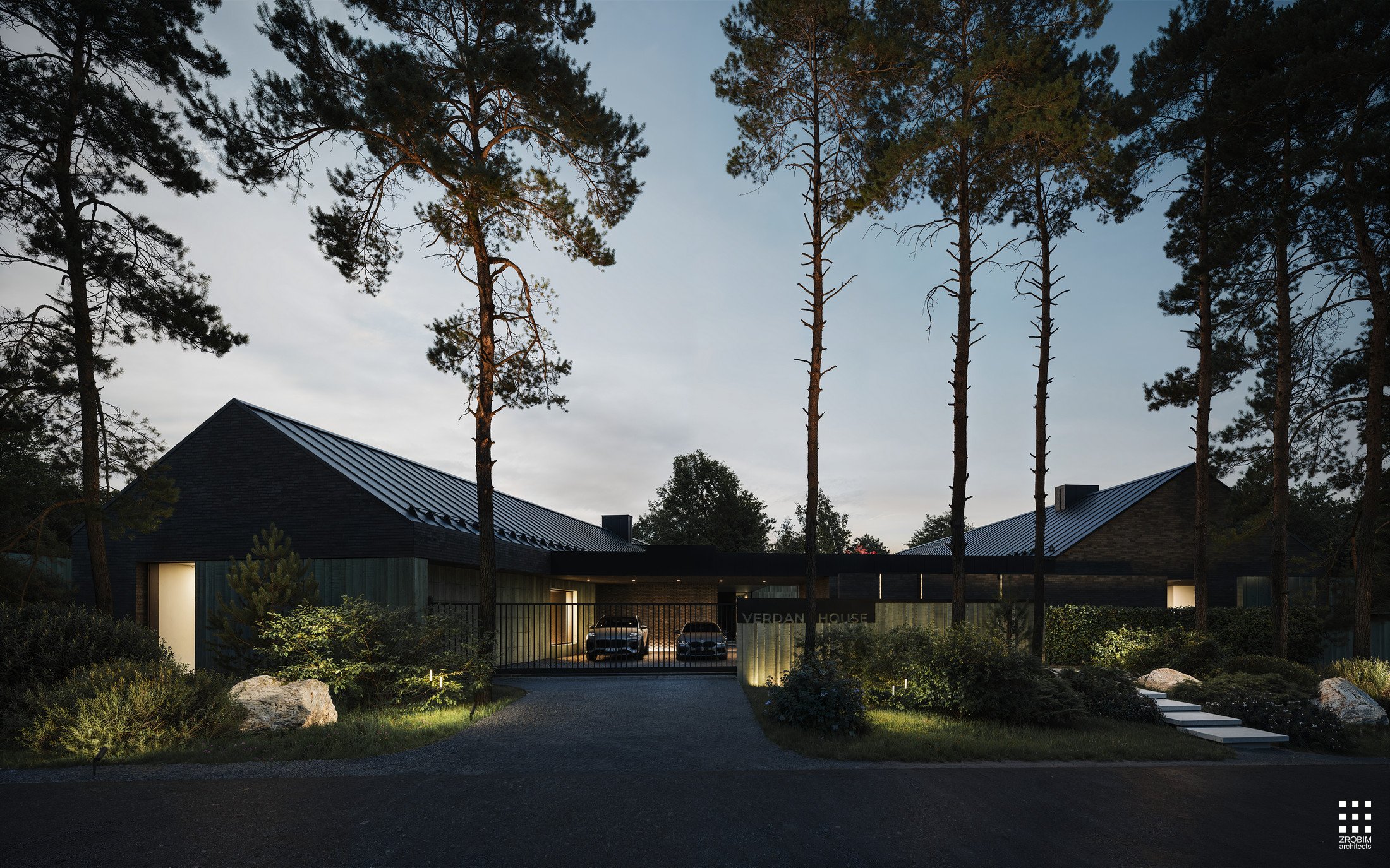 At the center of the composition is the courtyard, the "safe" core of the house around which all life is built. With an area of approximately 800 m² and a complex floor plan, the volume was divided into two barns. This approach allowed us to avoid a heavy monolithic roof, maintain a clean silhouette, and let in more sunlight. The broken plane of the roofs not only creates visual lightness, but also a feeling of airiness and freedom inside.