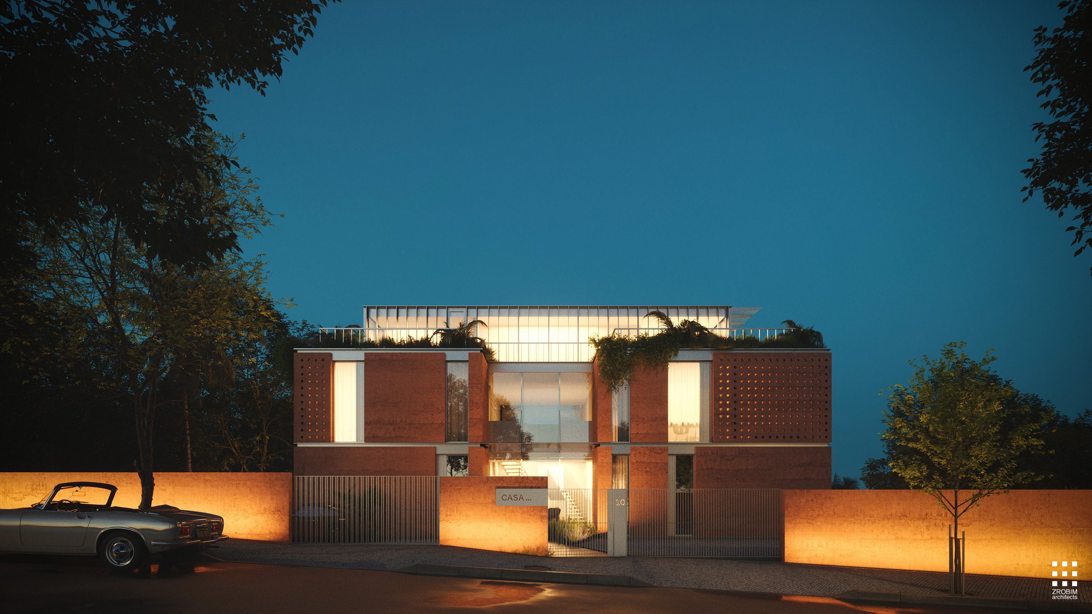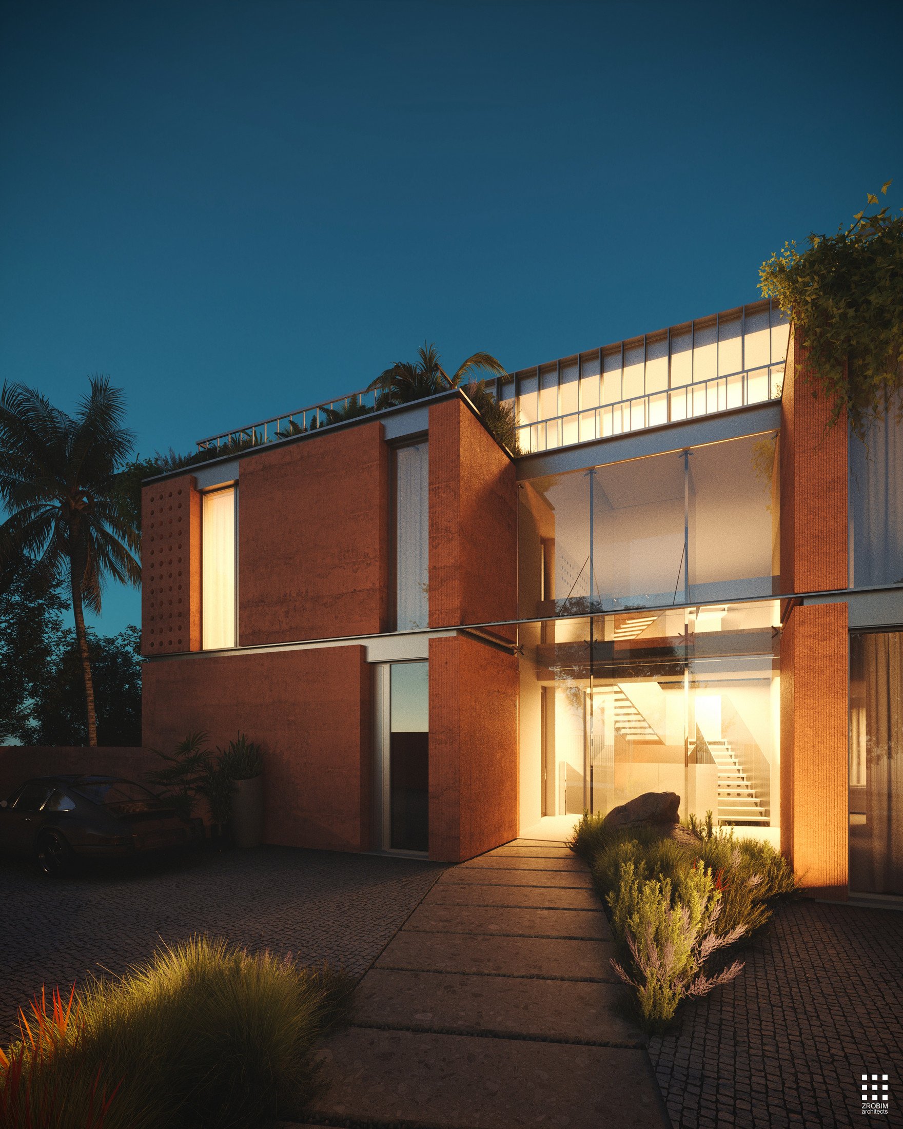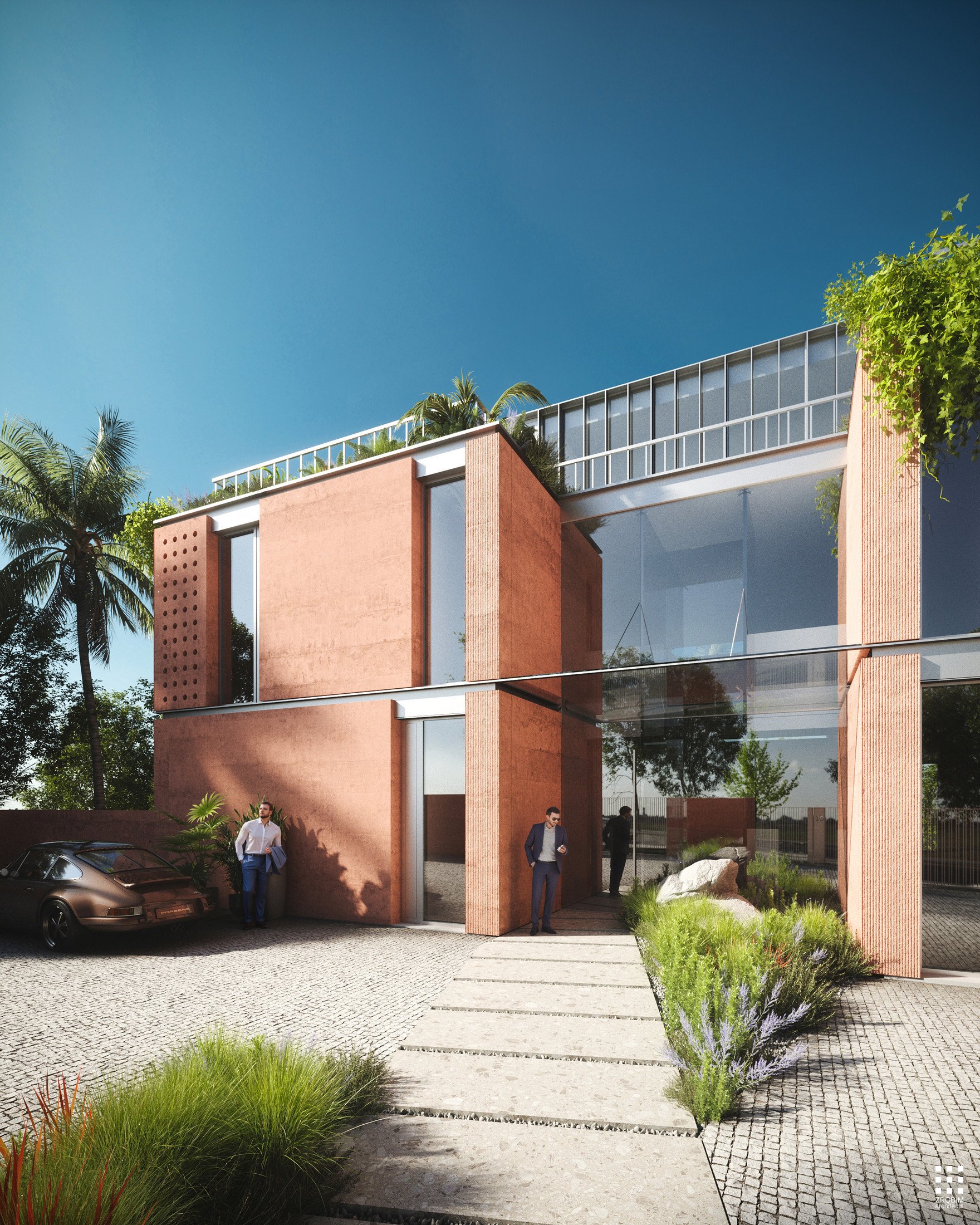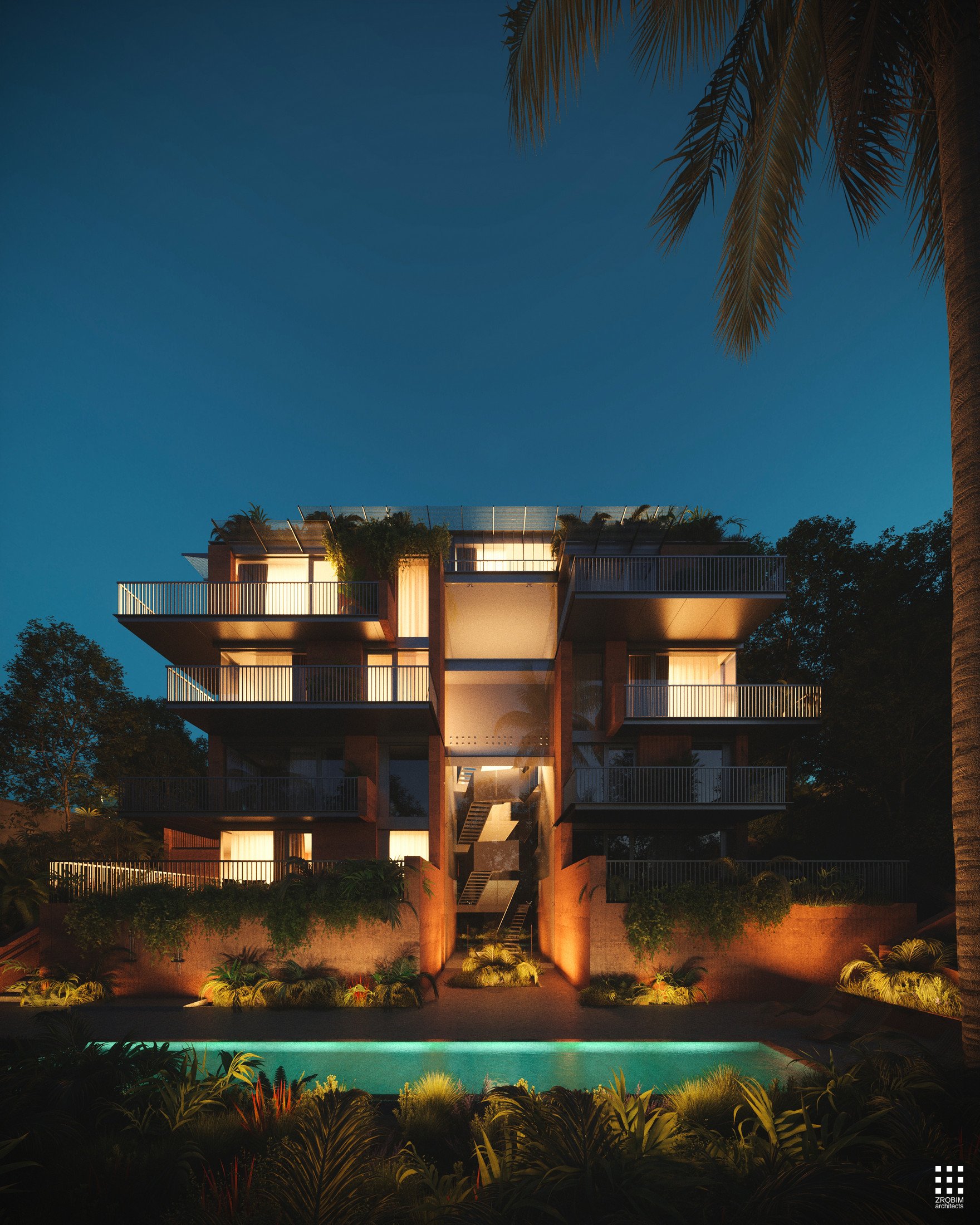 At the top, a penthouse features a second level designed as a transparent glass volume. It contrasts with the solidity of the lower masses, adding lightness to the composition, while a spacious terrace opens up panoramic views.