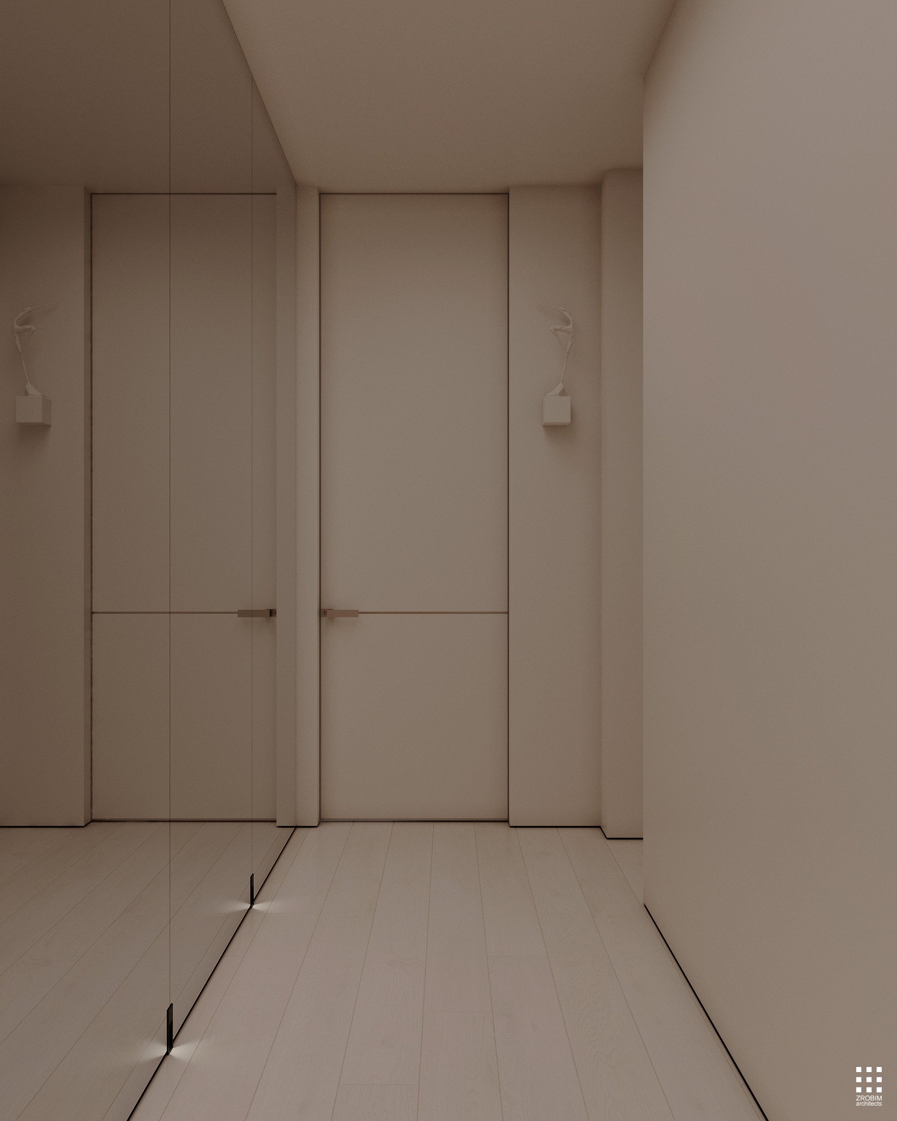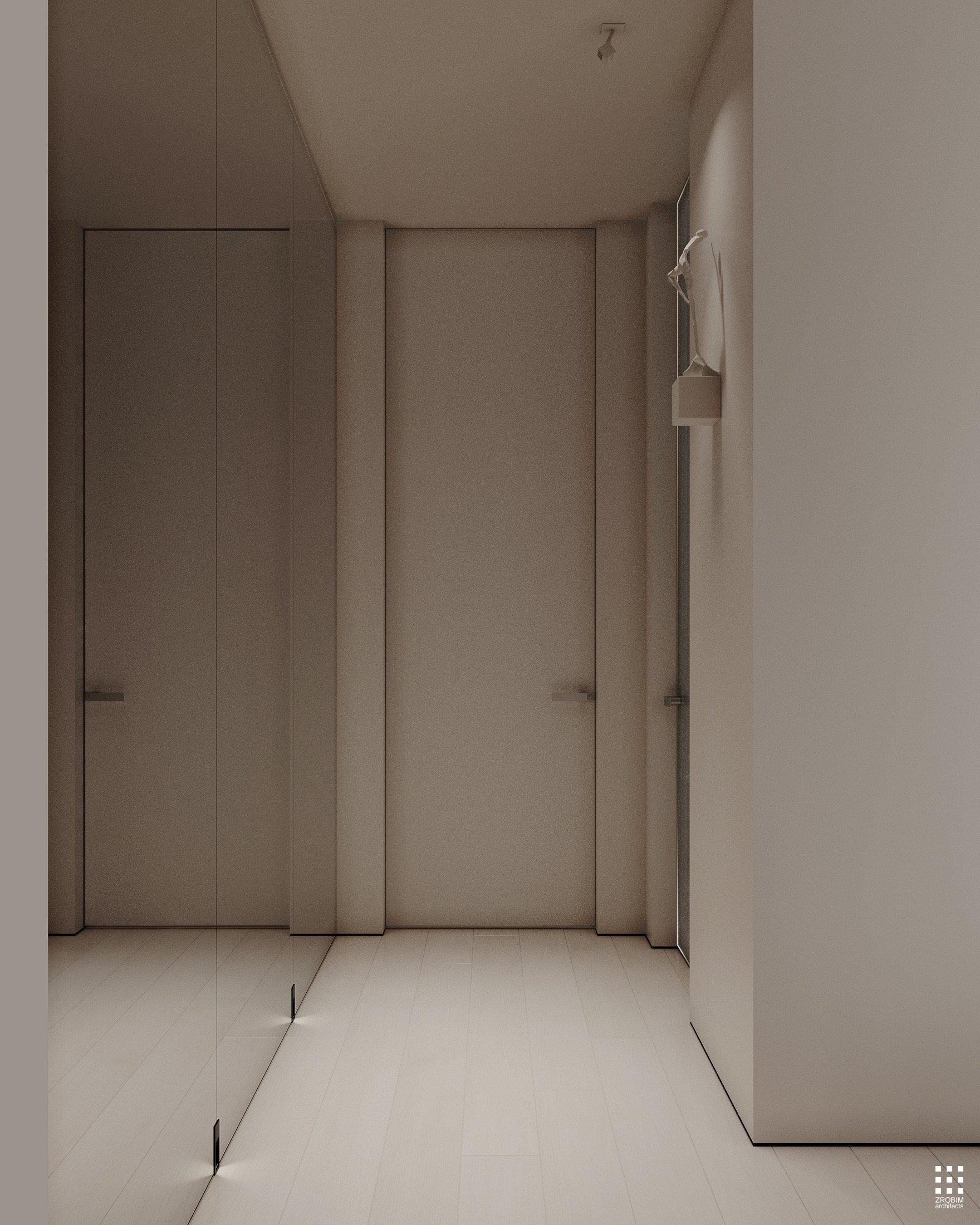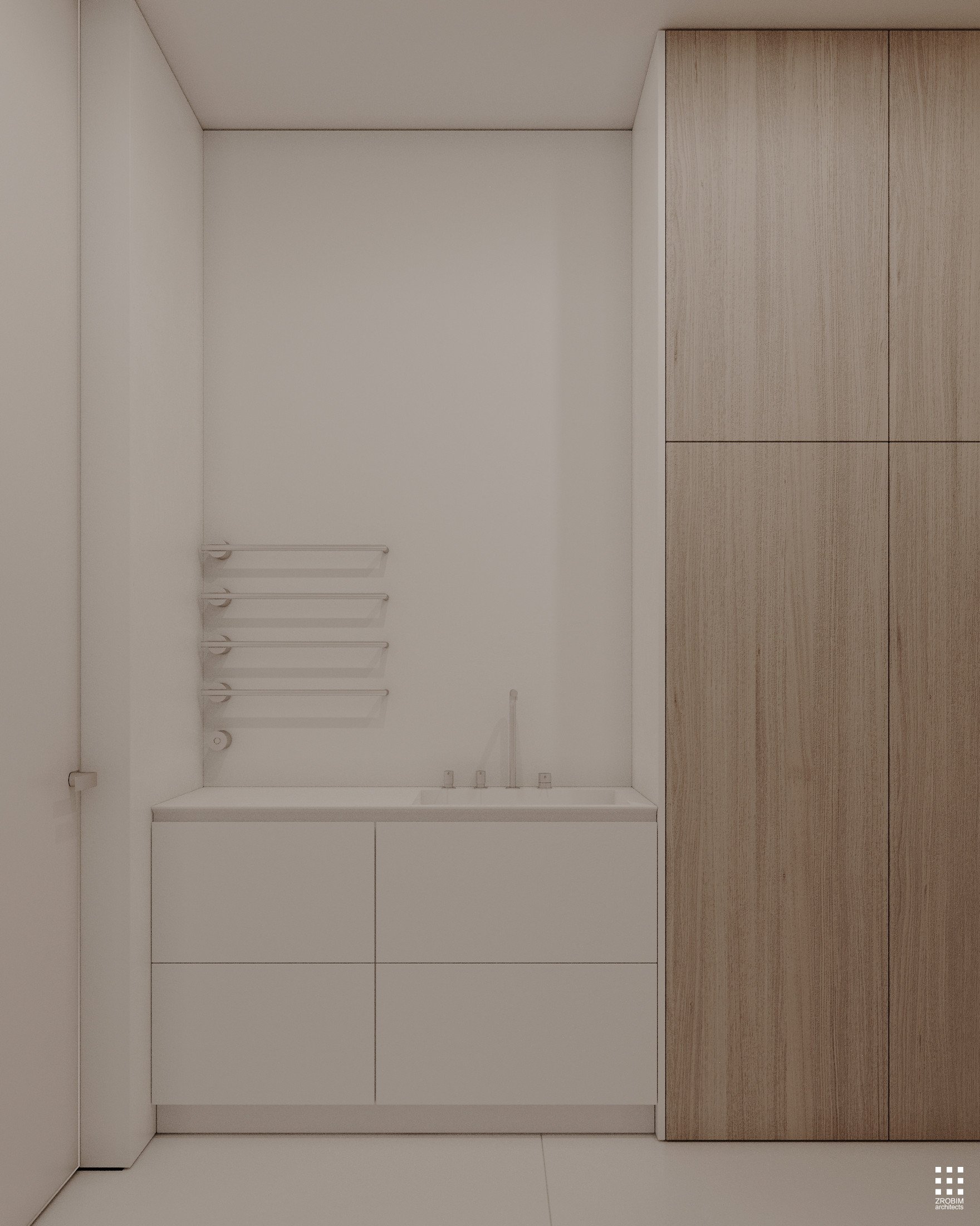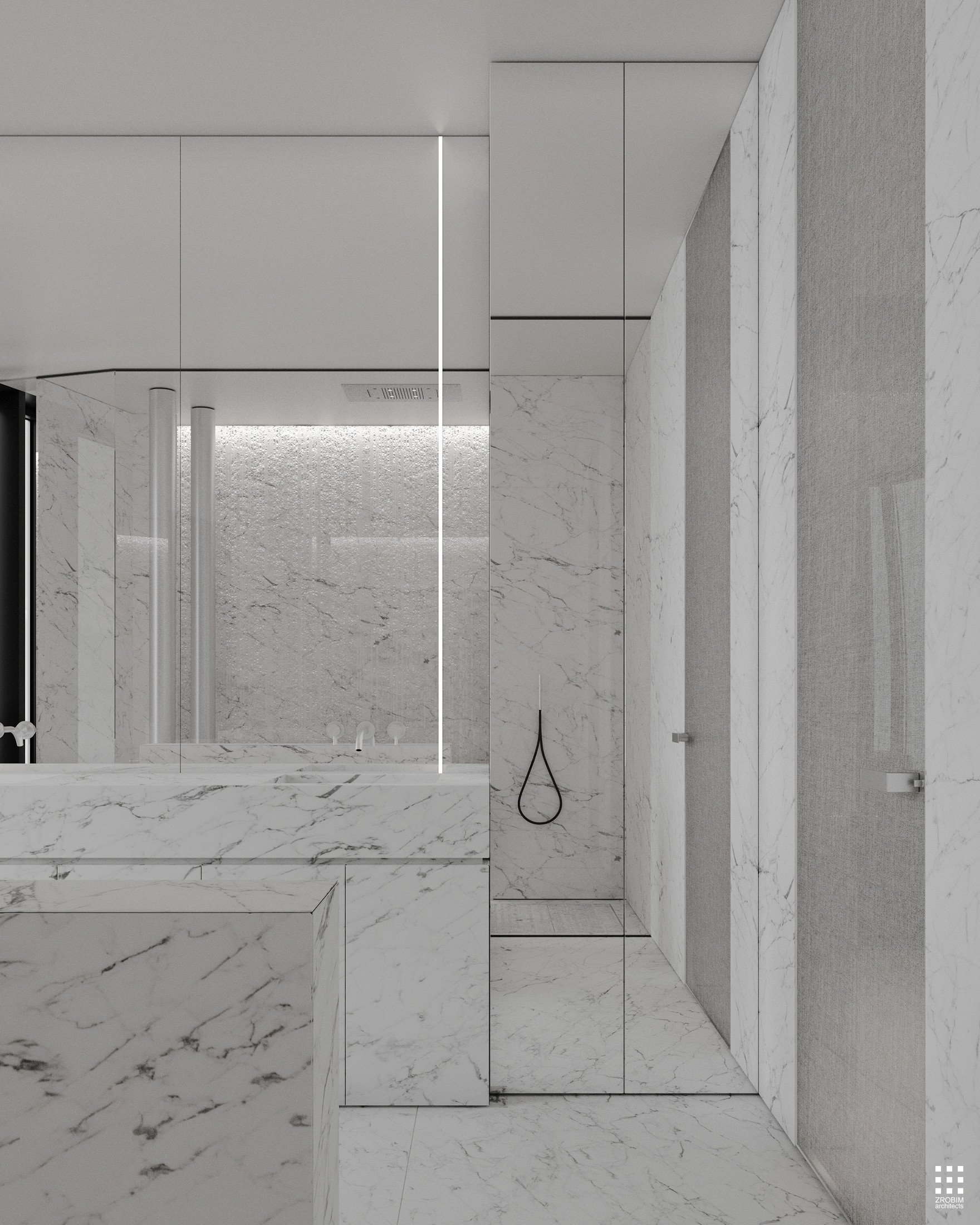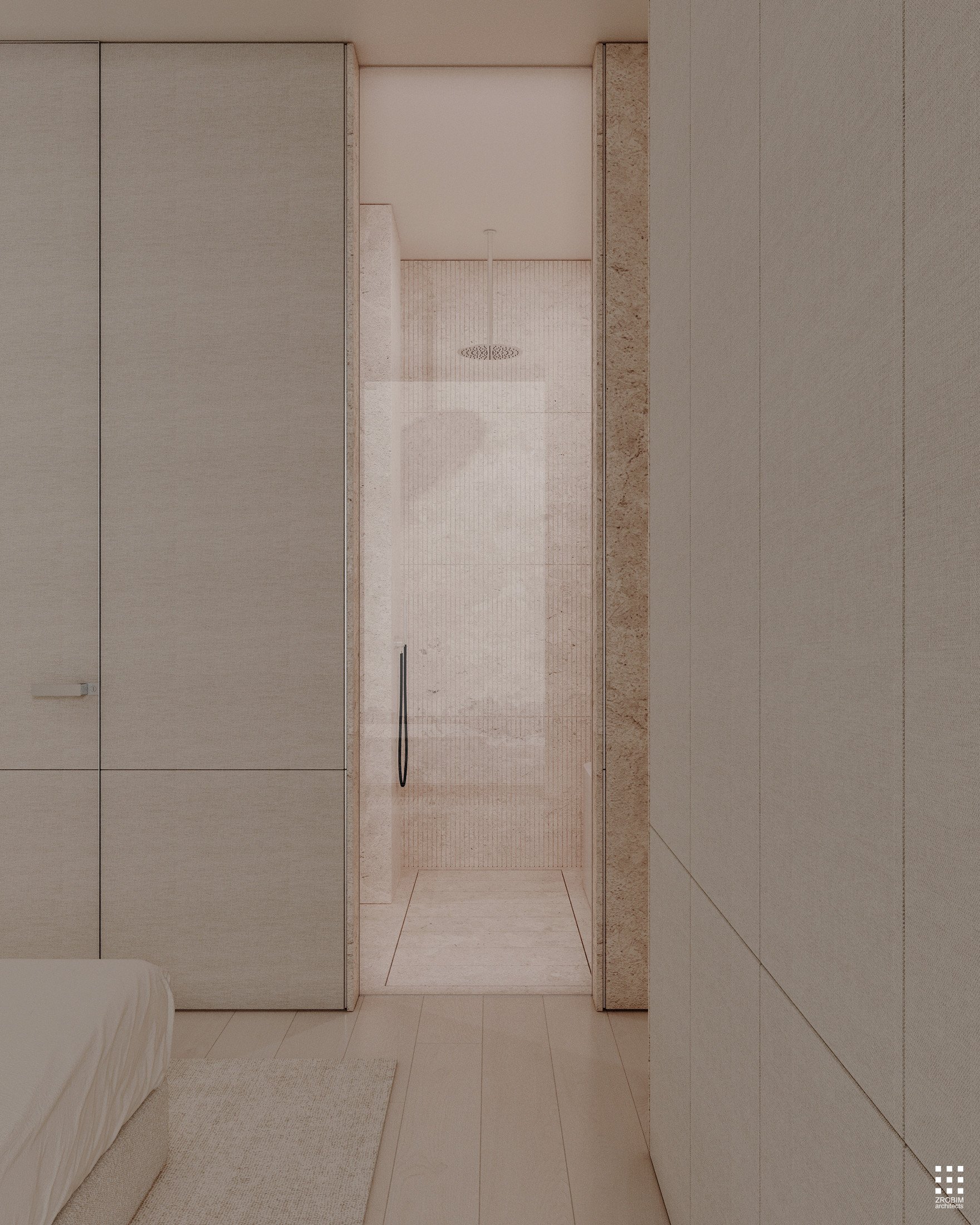 Despite the expressive volume, the project remains extremely minimalist — as minimalist as possible for a living space with a rich lifestyle. We deliberately eliminated all unnecessary elements, leaving only pure geometry, precise proportions, and thoughtful axes. Here, every line, every node, and every material transition are carefully crafted.