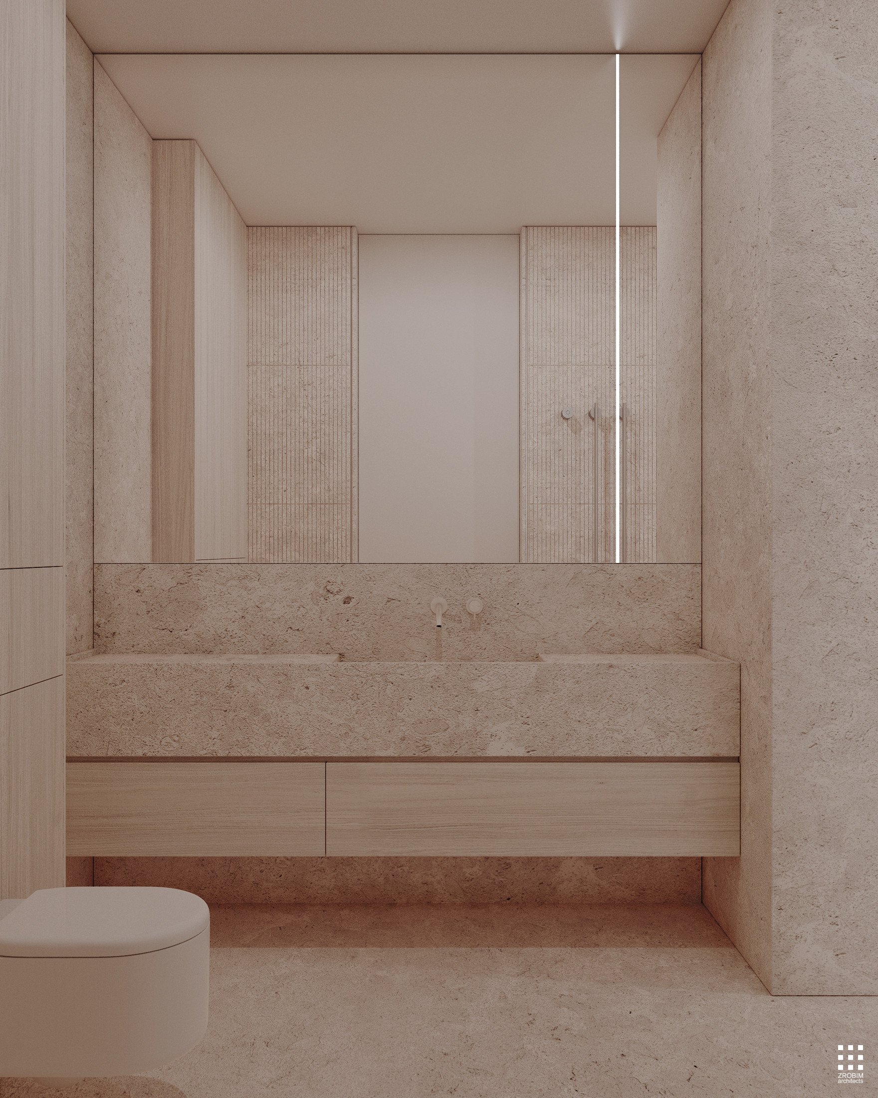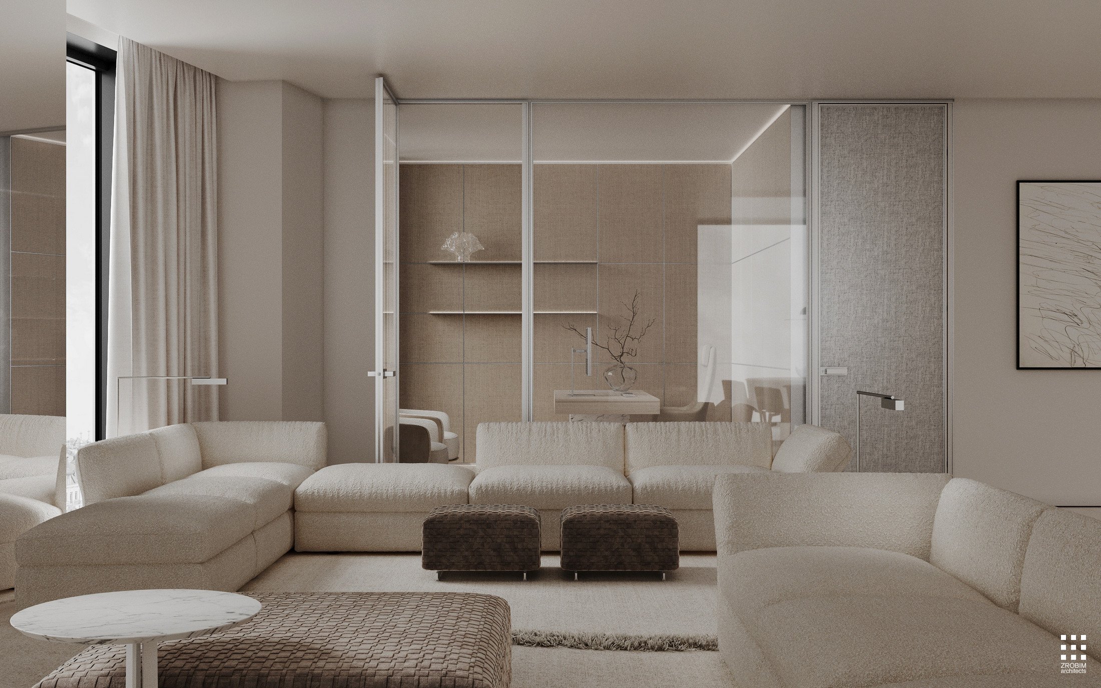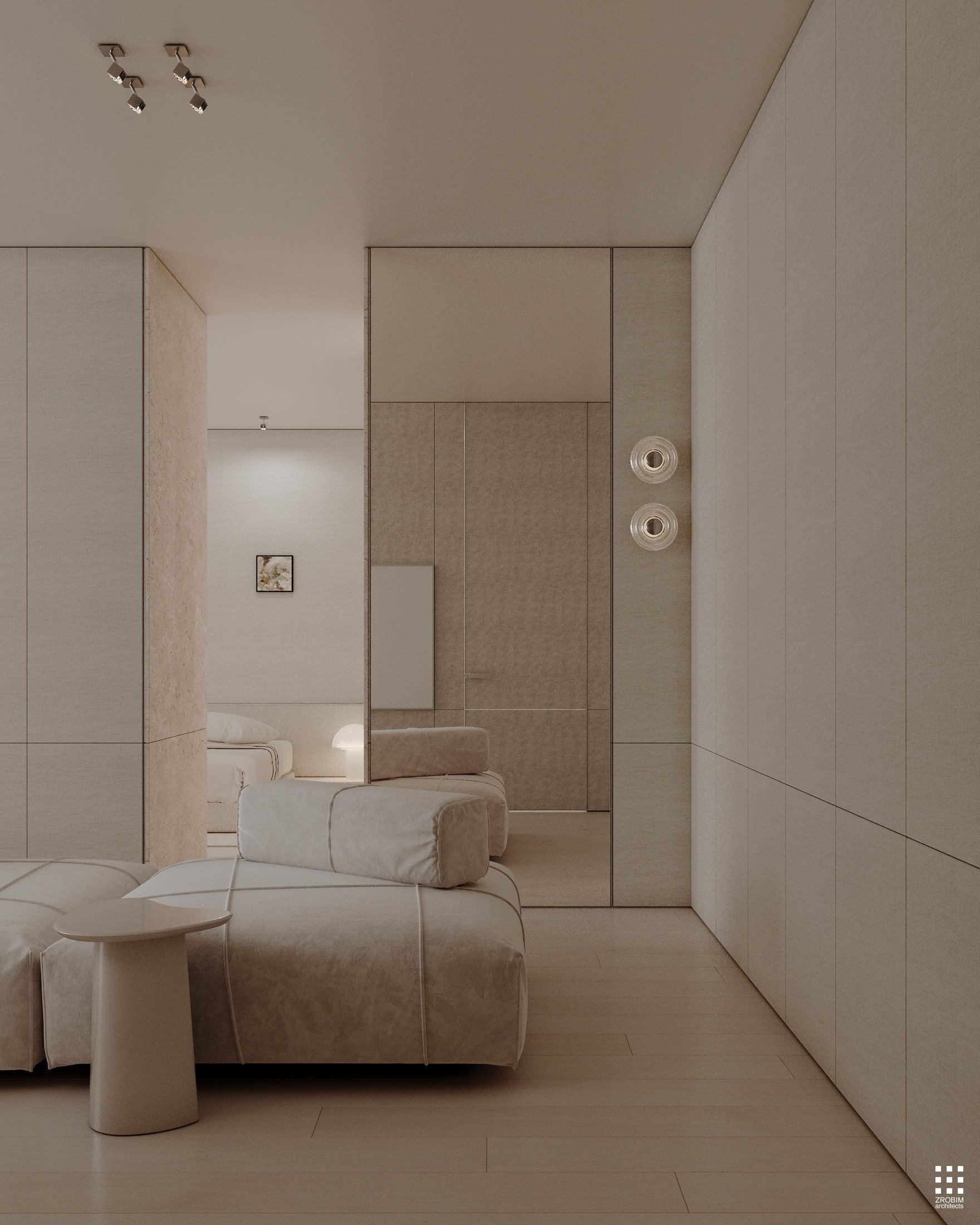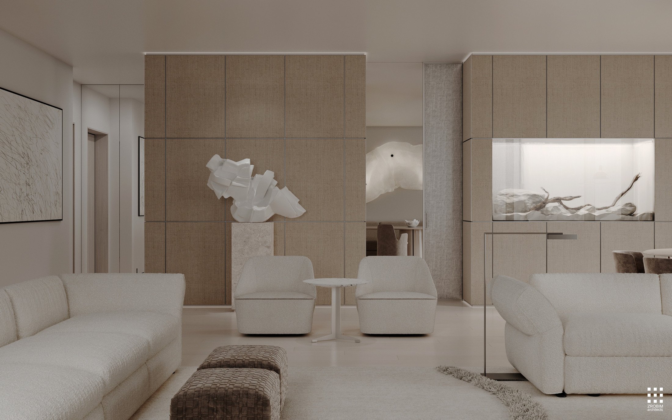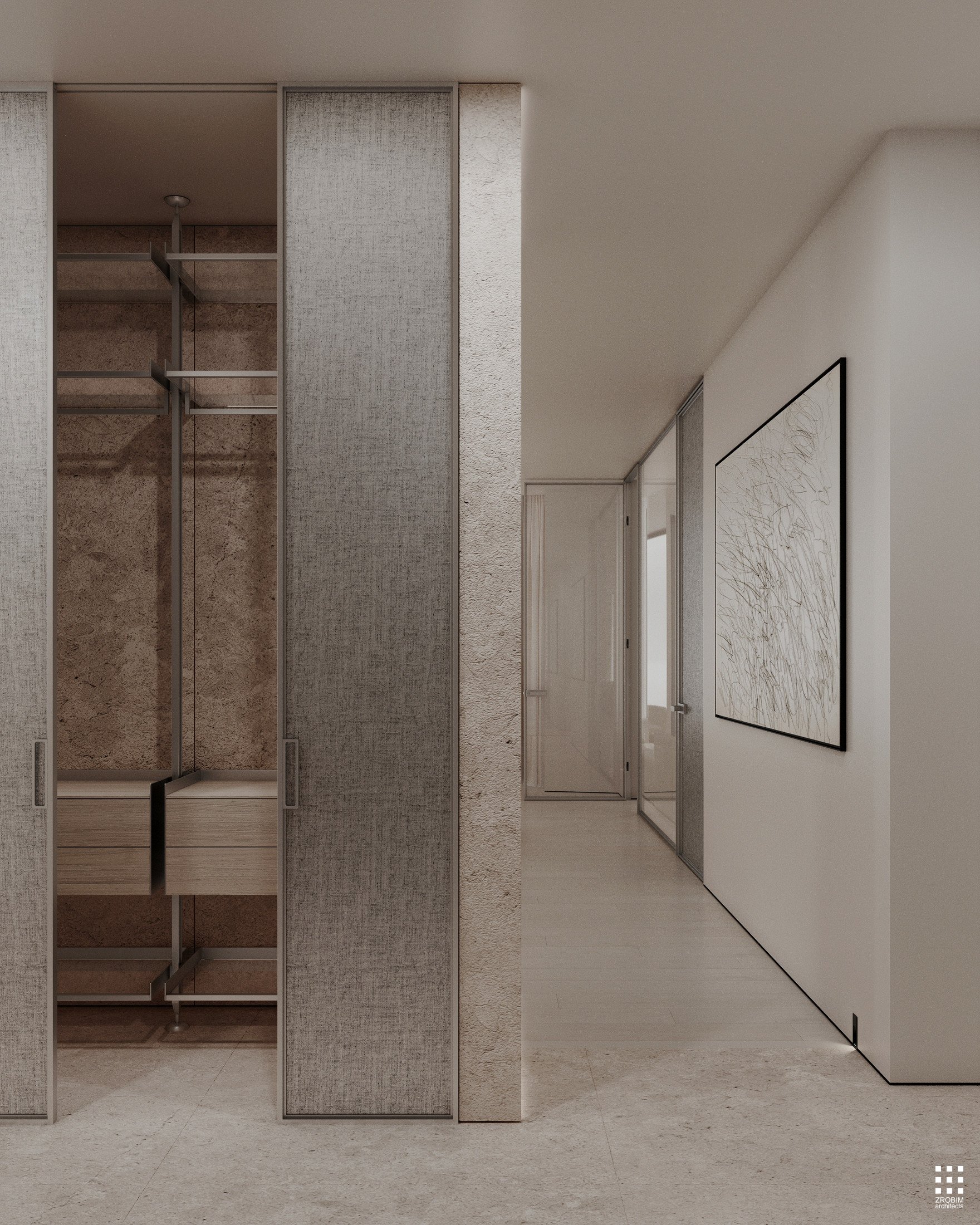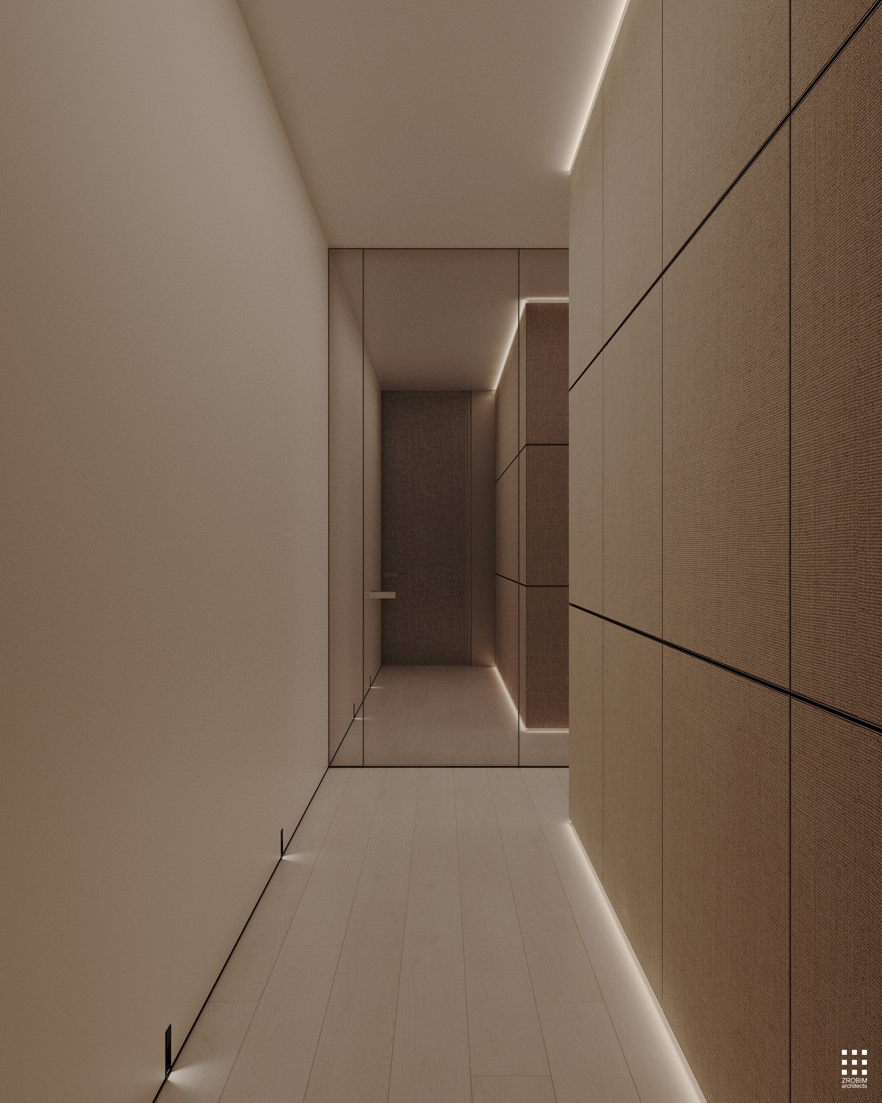 Despite the expressive volume, the project remains extremely minimalist — as minimalist as possible for a living space with a rich lifestyle. We deliberately eliminated all unnecessary elements, leaving only pure geometry, precise proportions, and thoughtful axes. Here, every line, every node, and every material transition are carefully crafted.