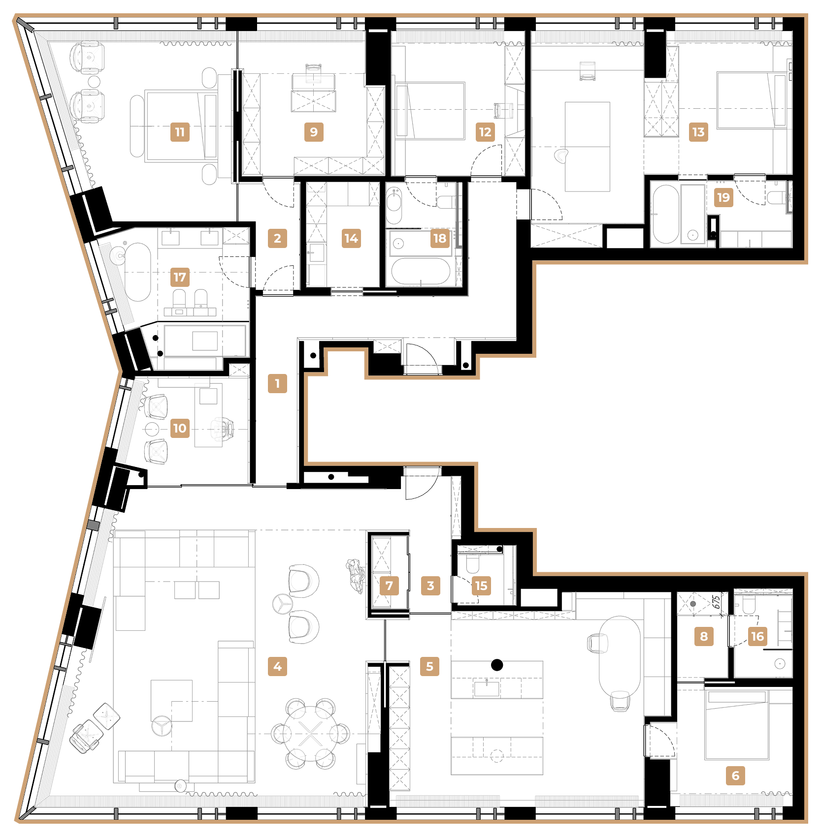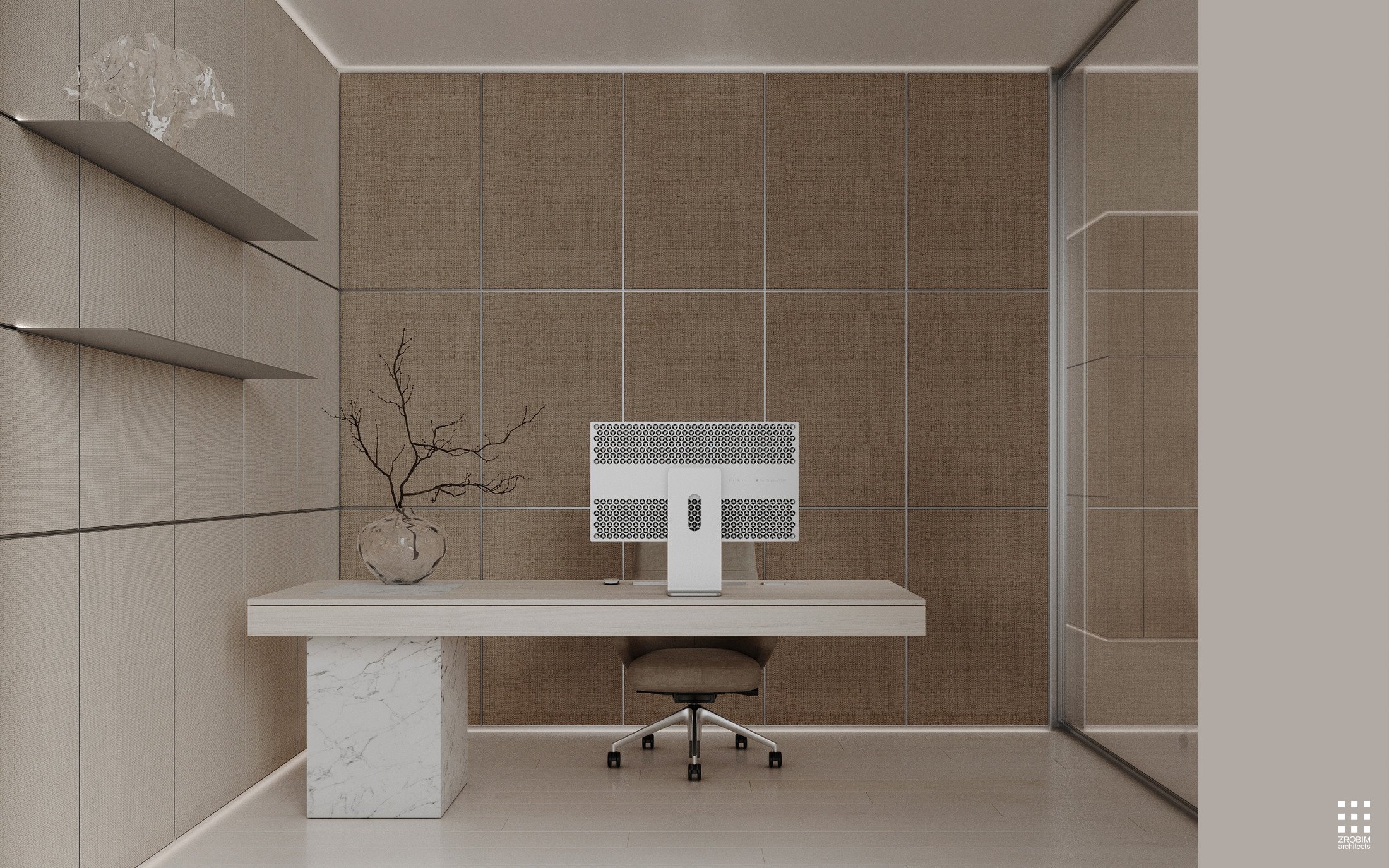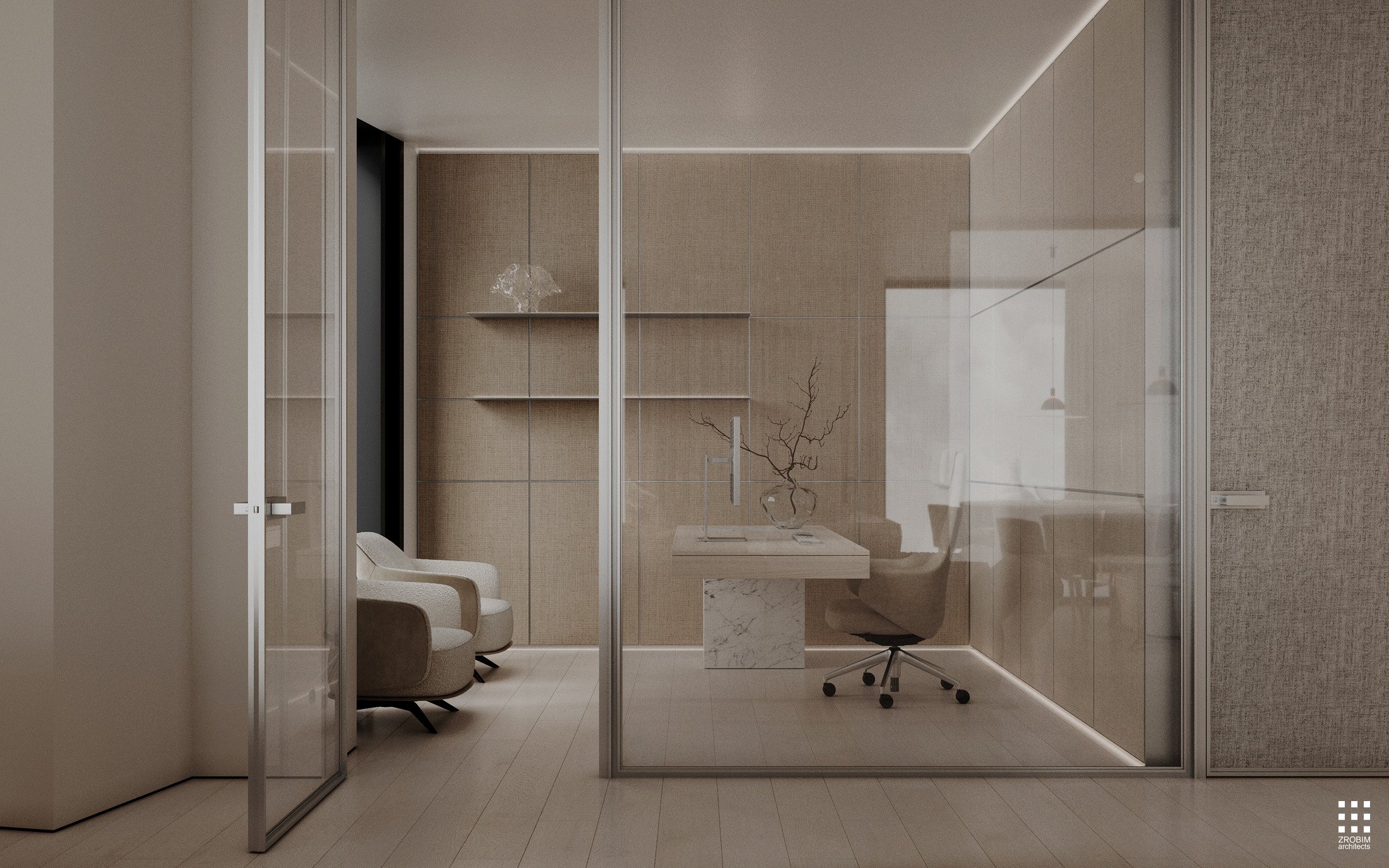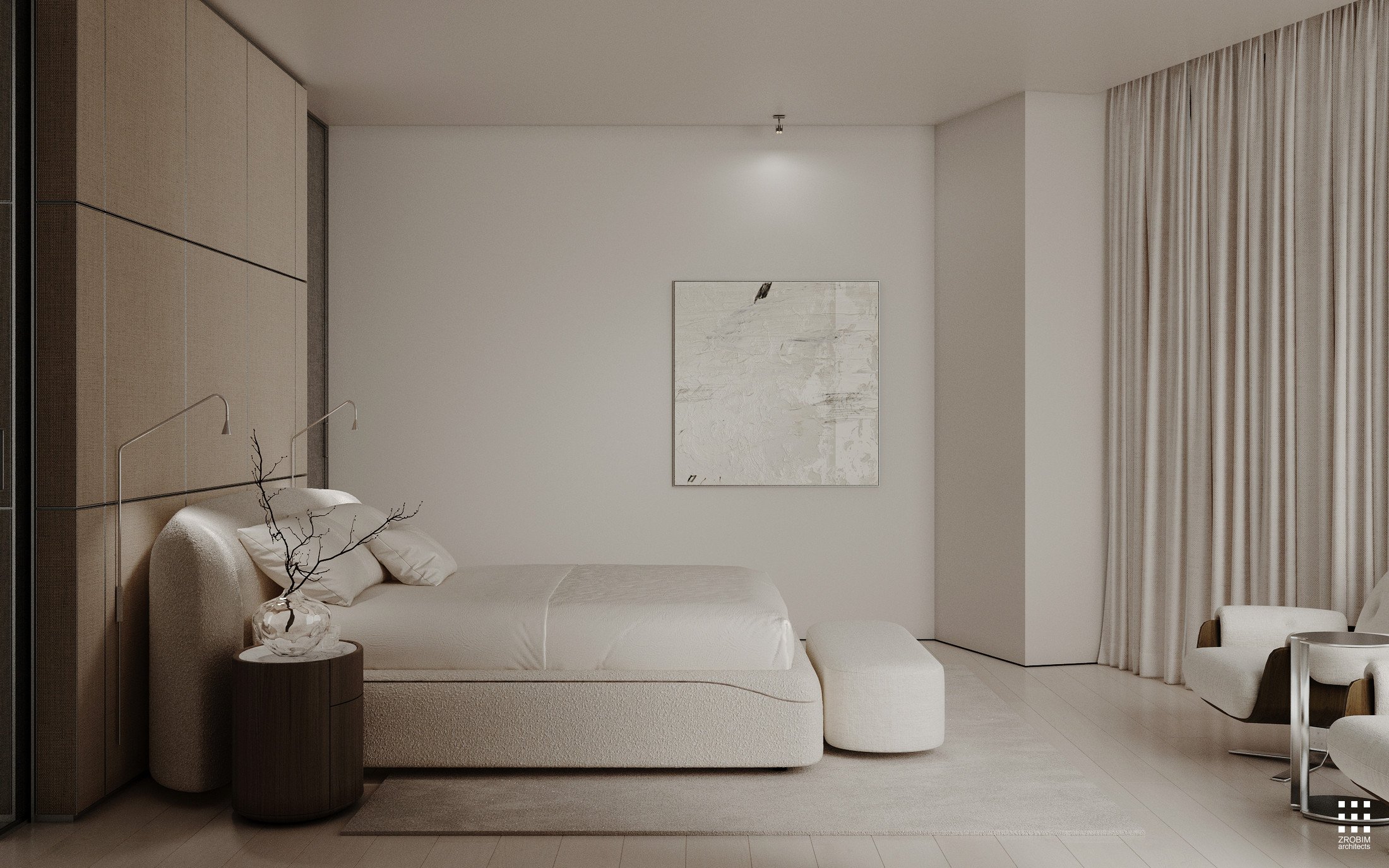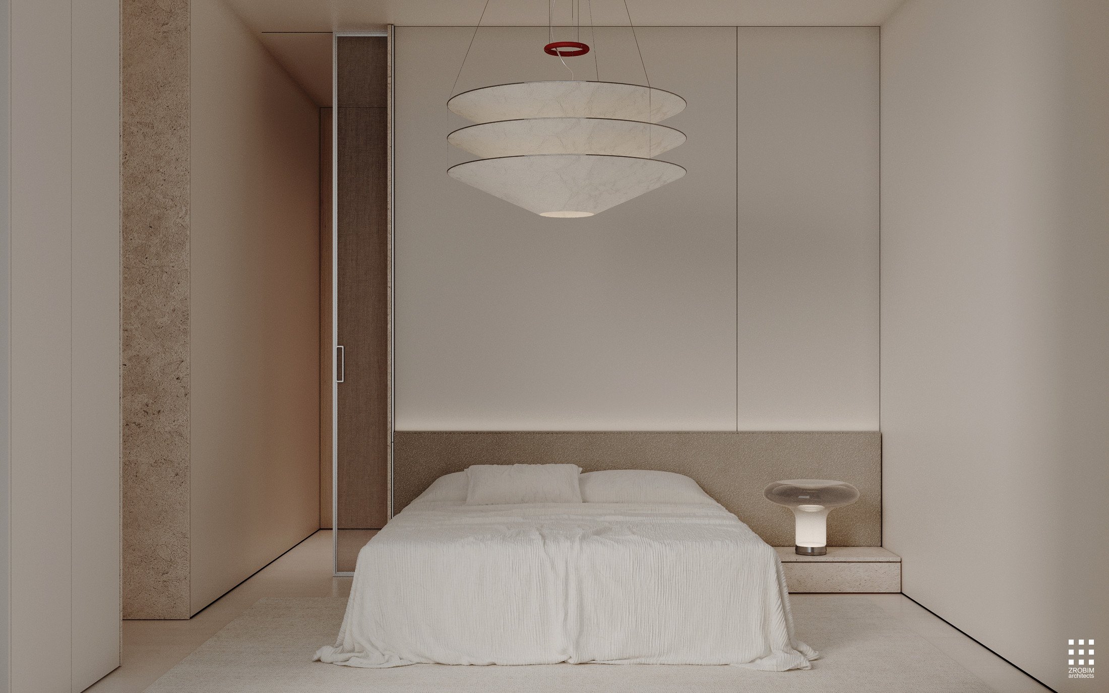 Despite the expressive volume, the project remains extremely minimalist — as minimalist as possible for a living space with a rich lifestyle. We deliberately eliminated all unnecessary elements, leaving only pure geometry, precise proportions, and thoughtful axes. Here, every line, every node, and every material transition are carefully crafted.