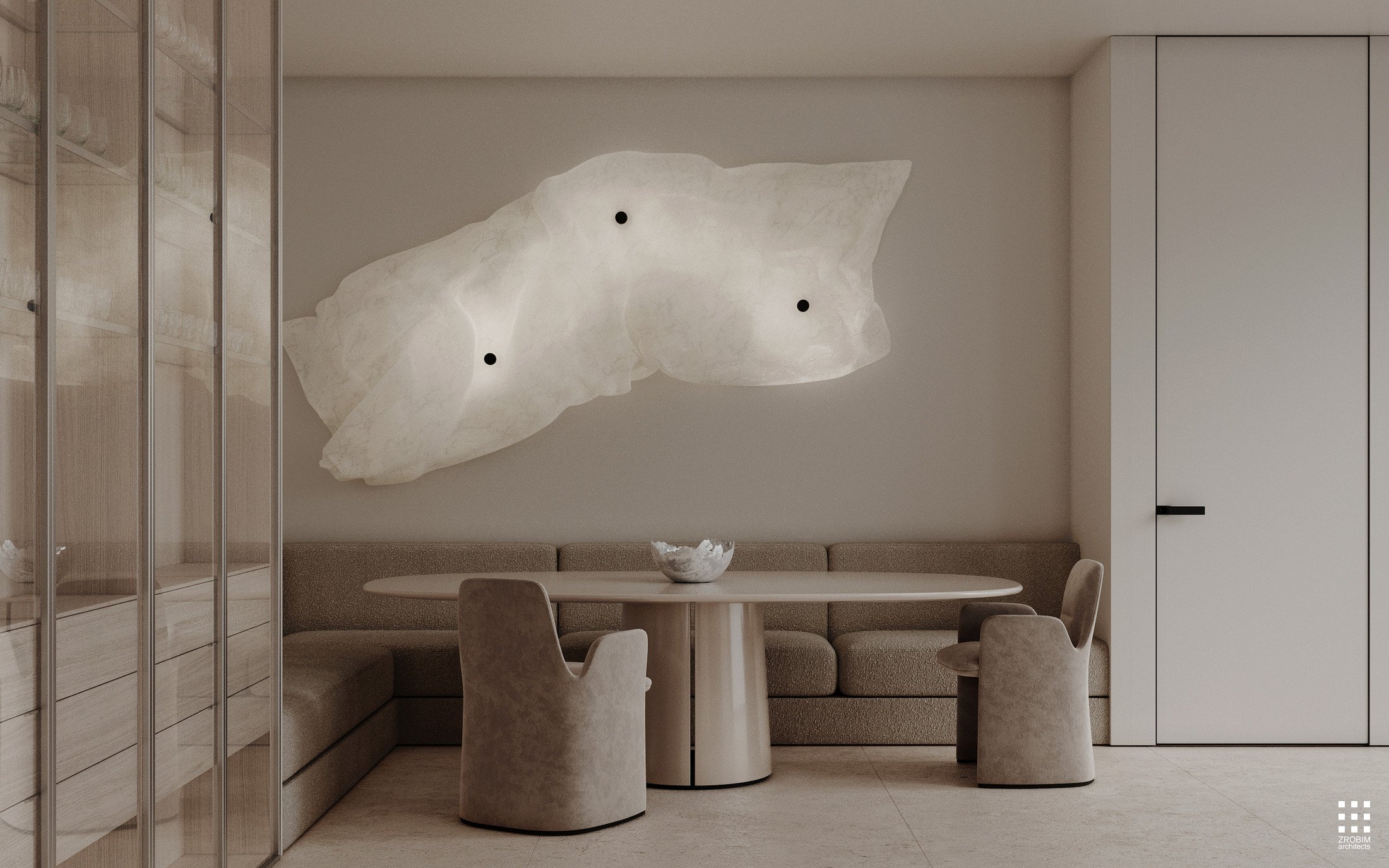 At the same time, the interior is neither cold nor sterile. Art is delicately woven into the space through characterful furniture, expressive lamps, sculptures, and paintings, which become meaningful accents, creating a dialogue with the space and emphasizing its intellectuality.