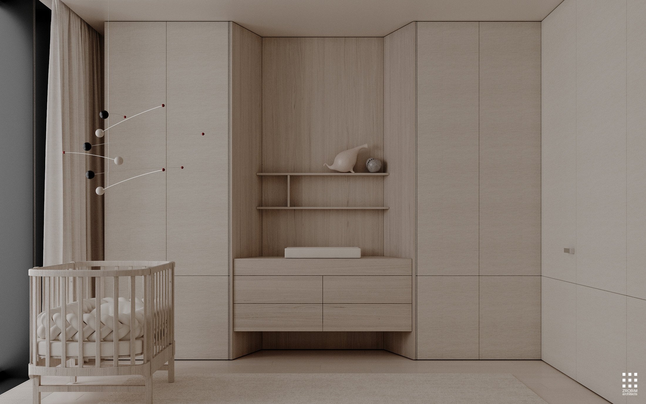 In public areas, raffia wall panels create a subtle natural rhythm and a soft play of light, while in children's rooms, fabric panels create a more intimate, acoustically comfortable atmosphere. The materials here work not only visually but also sensorially, creating a sense of comfort without sacrificing status and scale.