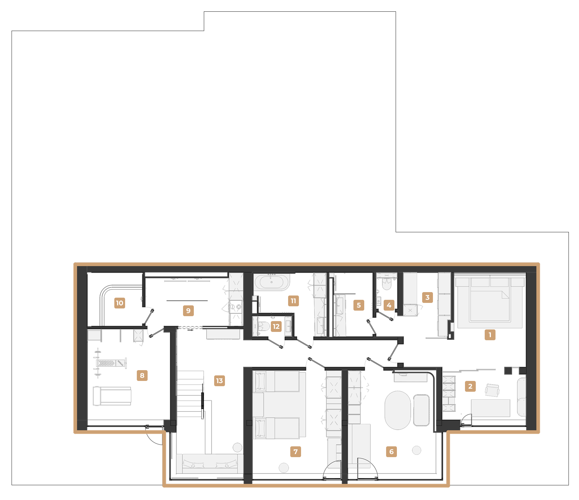 Идея проекта заключается в том, чтобы «облачить» брутальные, холодные, природные каменные объёмы в тёплые древесные оттенки, создавая мягкую, спокойную и обволакивающую среду. Так рождается пространство, где строгая геометрия уравновешивается теплом материала, а природа становится частью интерьера.