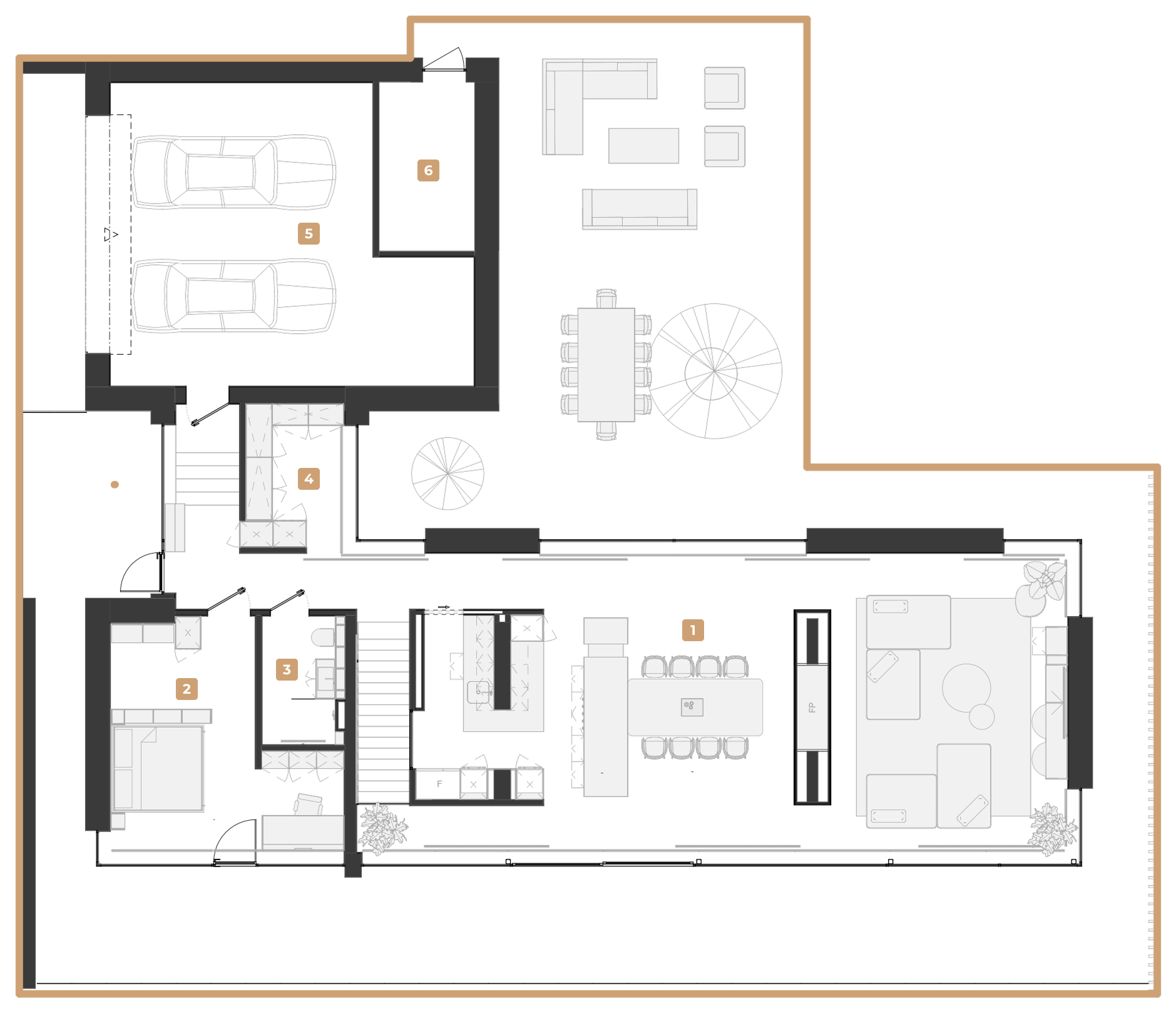 Центром композиции первого этажа становится Т-образный узел: кухонный остров, переходящий в обеденный стол, и каминная перегородка, которая объединяет столовую и гостиную в цельный визуальный и функциональный блок. Такой приём задаёт структуру пространства и поддерживает архитектурную логику всей резиденции.