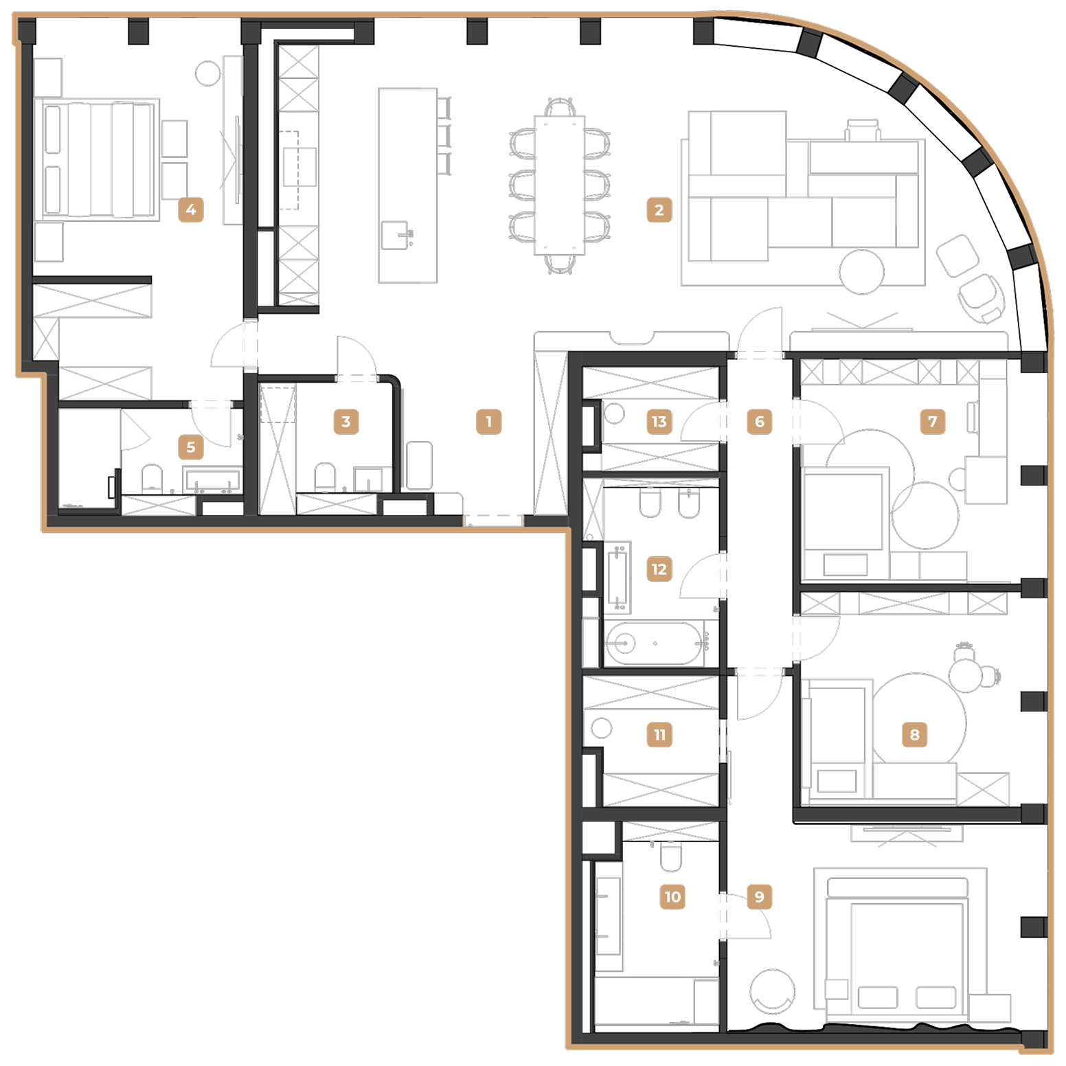 Планировка квартиры сама стала отправной точкой для архитектурных решений: сочетание округлых и прямолинейных форм подчёркивает пластику пространства и делает композицию более выразительной.