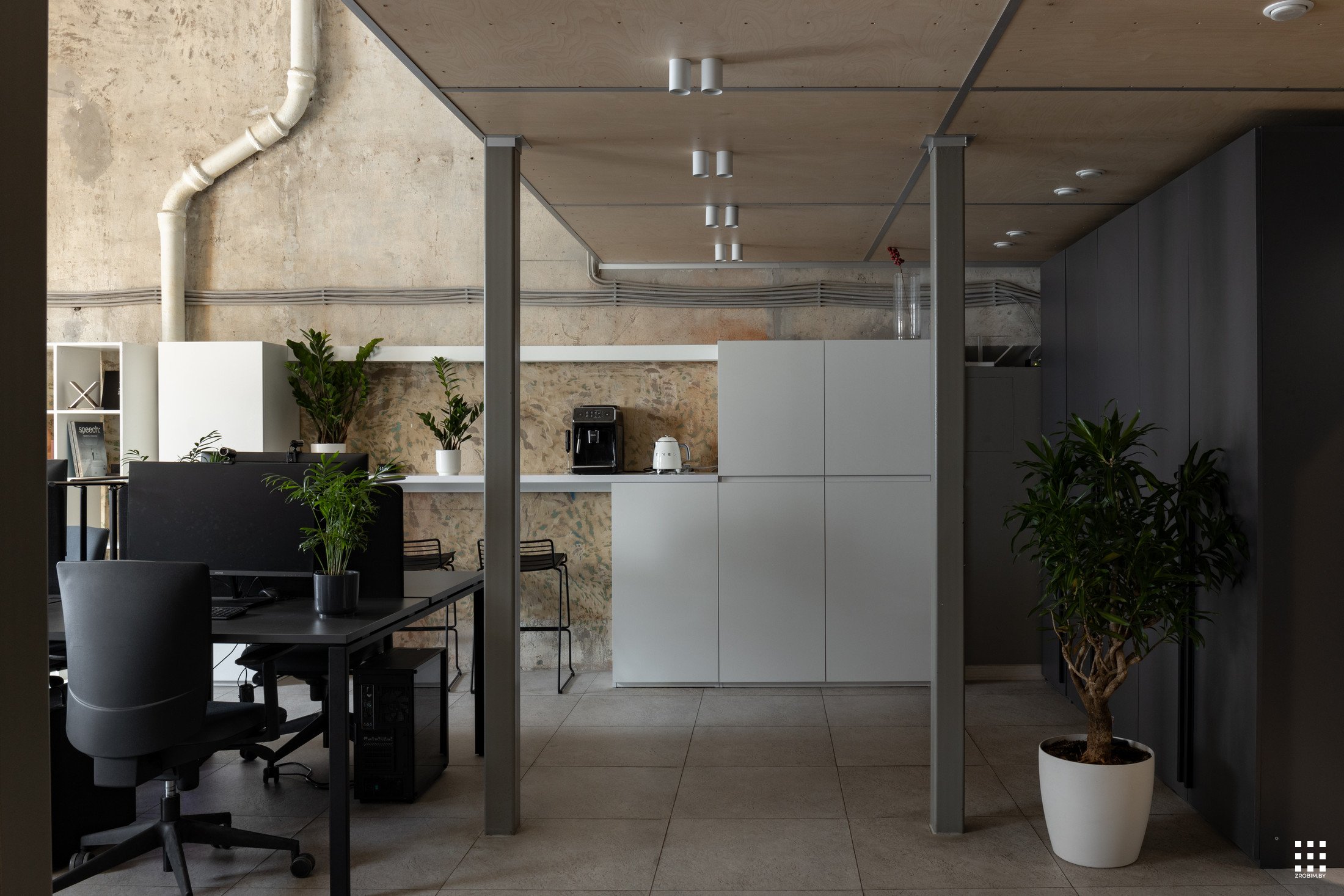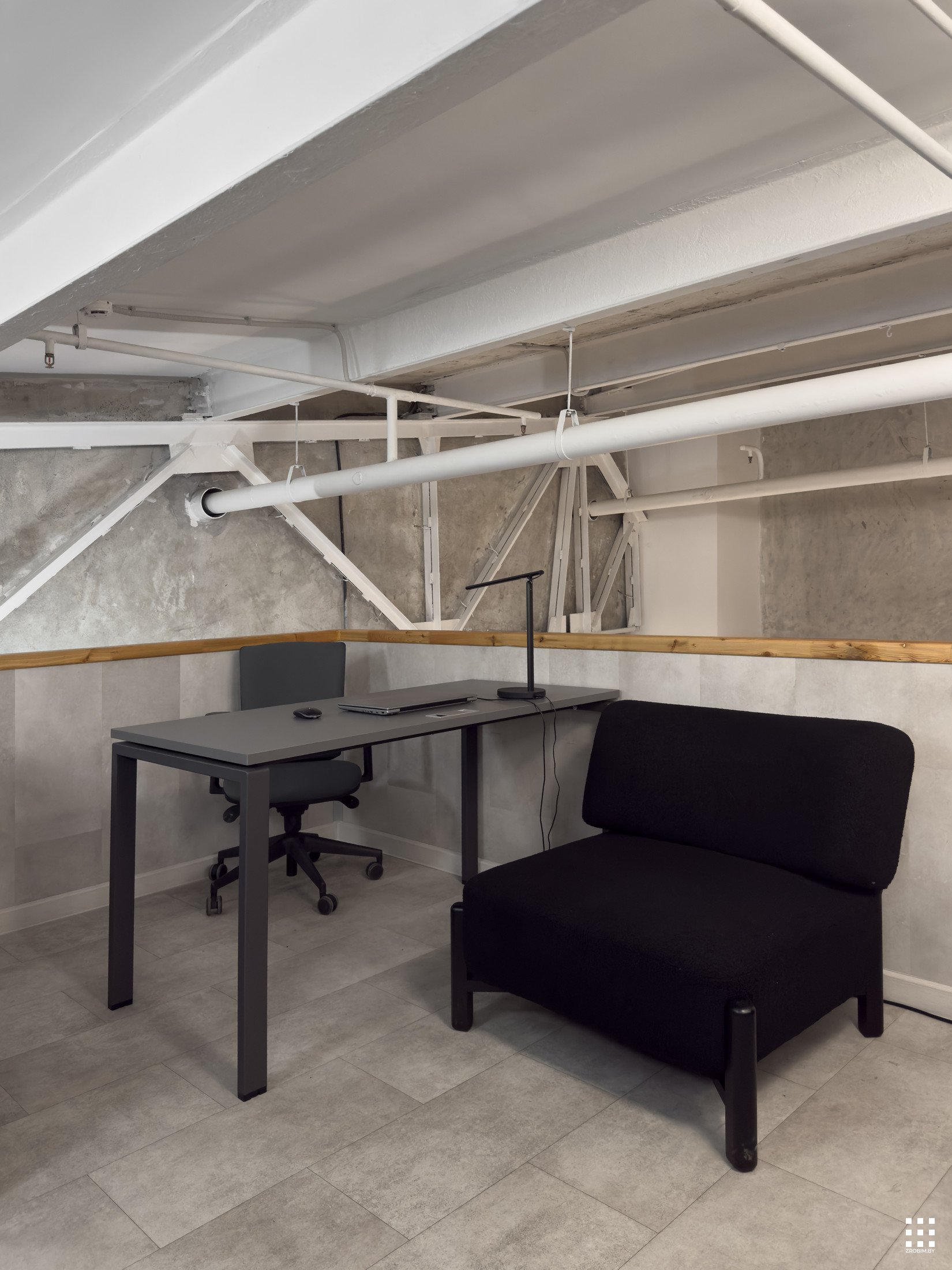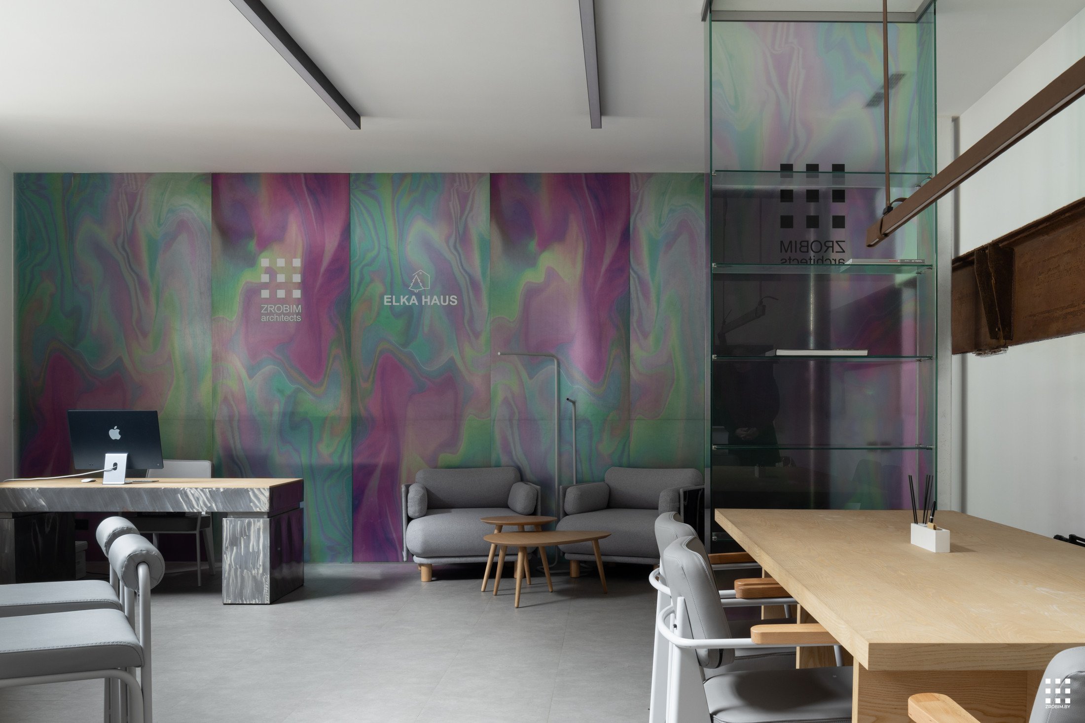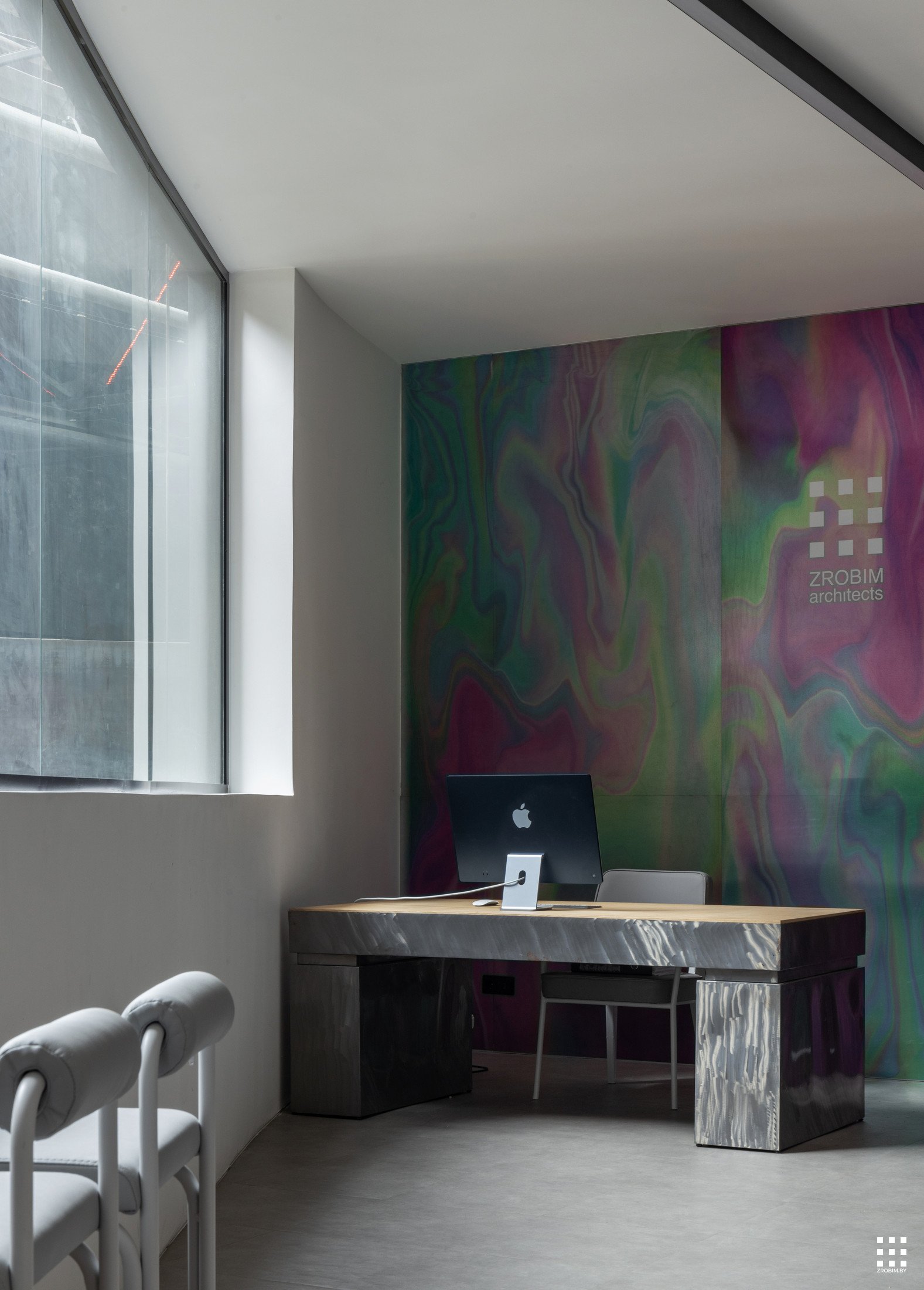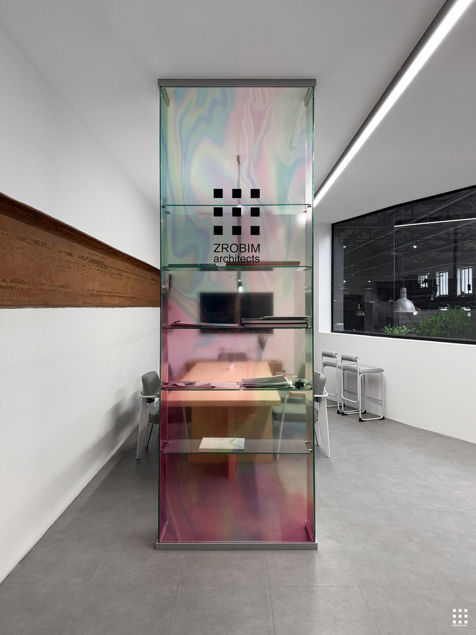 Так как площадь небольшая, мы зонировали пространство с помощью интересной бензиновой перегородки, которая выступает одновременно и системой хранения, и ненавязчивой перегородкой. Нашей главной задачей при проектировании офиса было не спорить с пространством, а гармонично в него вписаться со своей уникальностью. Поэтому интерьер офиса минималистичный и функциональный, а дополняет его мебель нашего бренда BY furniture.